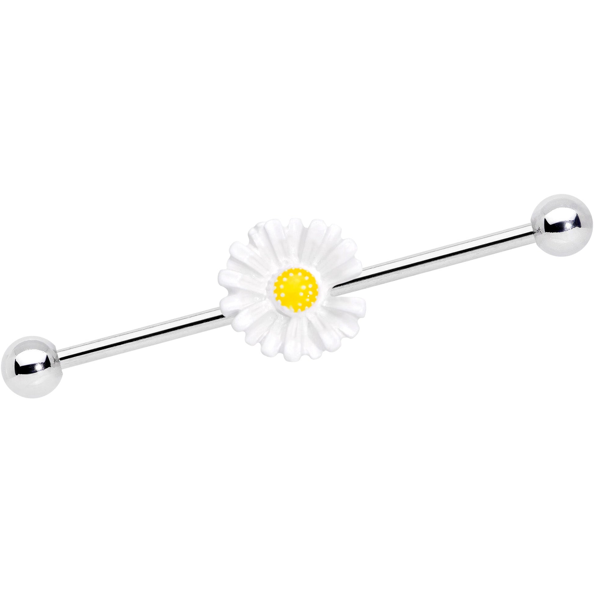 Let the daisy on this 14 gauge helix barbell bedeck your piercing in colorful style! It's made with a 1 1/2" durable 316L surgical grade stainless steel straight barbell with 5mm ball ends. It features a three-dimensional white and yellow daisy charm. And you can slide the daisy up and down the length of the barbell to get exactly the look you want. Your industrial piercing will blossom with this delicious daisy in it!Specifications