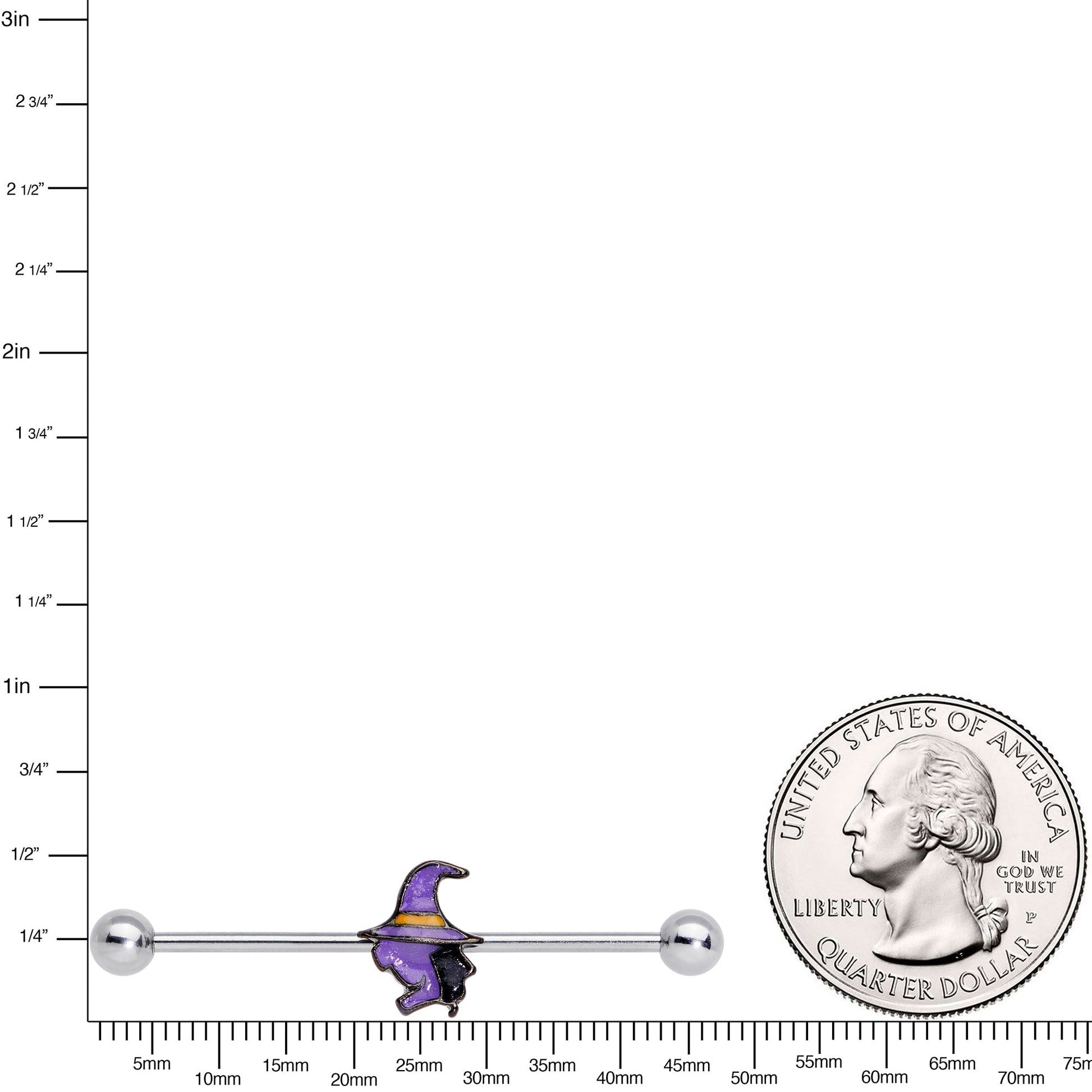 You'll be feeling fashionably fearful with this 14 gauge helix barbell in your ear! It's made with a 1 1/2" durable 316L surgical grade stainless steel straight barbell with 5mm ball ends and features a moveable glow in the dark purple witch charm that is perfect for all of your Halloween fun!Specifications