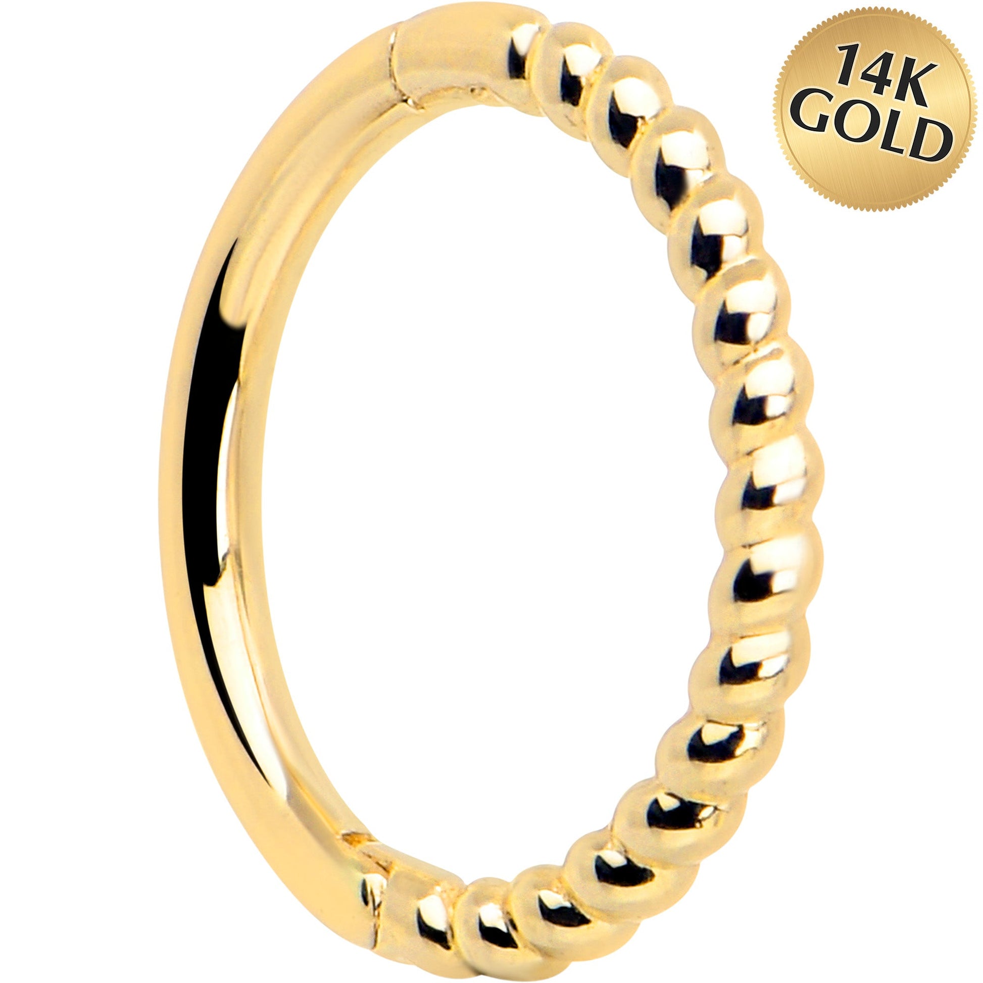 Want to show off your high-fashion style in every aspect of your look? Then this 18 gauge solid 14k yellow gold hinged circular ring is exactly what you need for a pierced look you can be proud of. It features a forward facing coil design for classic style you can really show off. This 8mm lip ring also features a non-removable, hinged segment that makes insertion and removal a breeze and you can rock it in multiple piercings including tragus, helix, some conch, and some nostril piercings. Ta-da! Solid gold style for you and your cartilage piercing.Specifications