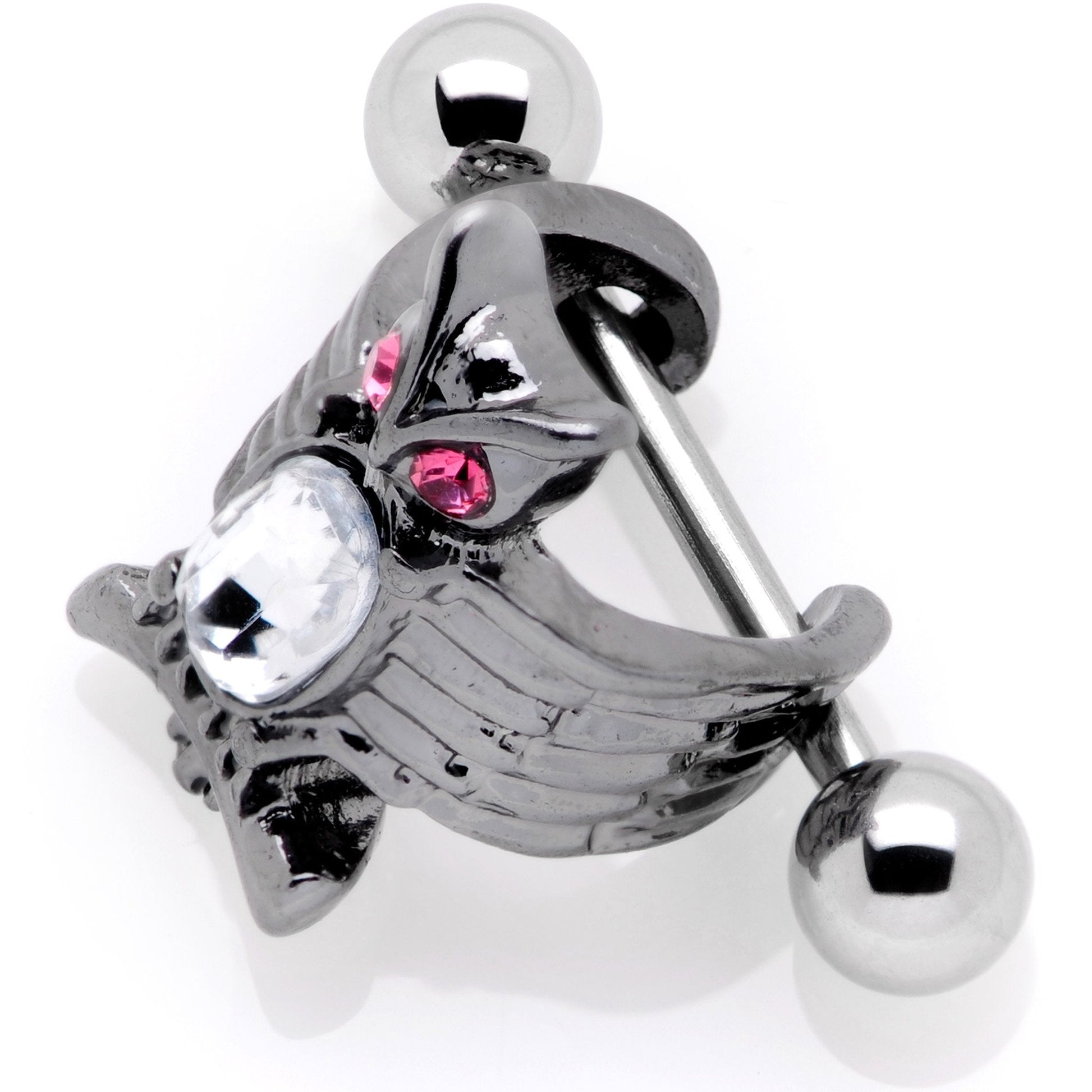 Embrace your mysterious side with this winged creature helix cuff. This 16 gauge helix cuff features an ominous winged creature with a clear gem body and pink gem eyes that create a mysterious, eerie look. The creature charm is set on a 12mm straight barbell made with durable 316L surgical grade stainless steel.Specifications