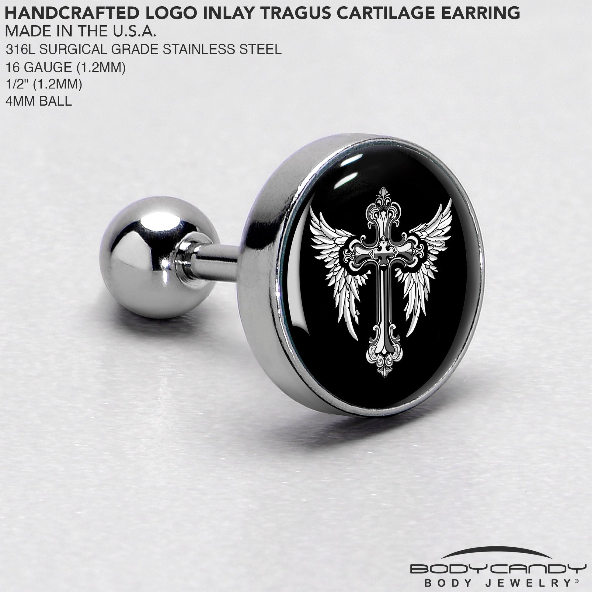 Give your soul some wings with this 16 gauge tragus stud. It's made with a 6mm durable 316L surgical grade stainless steel straight barbell with a 4mm ball end. It features a cross charm, with detailed wings on a black background, for a look that mixes spirituality with style. You can even rock it in multiple piercings including tragus, helix, and some conch piercings. Give your look a lift while honoring your beliefs with this winged cross cartilage piercing jewelry.
