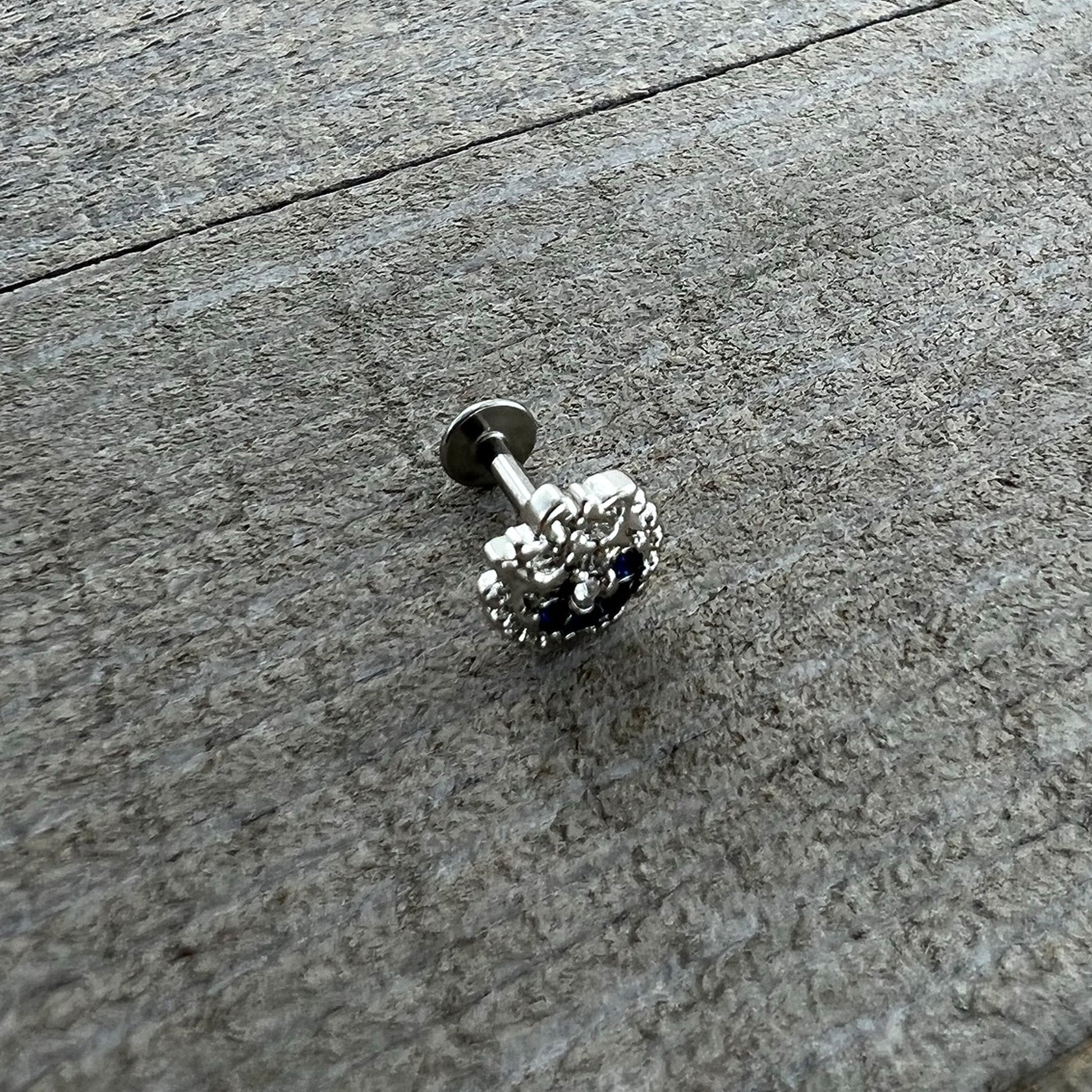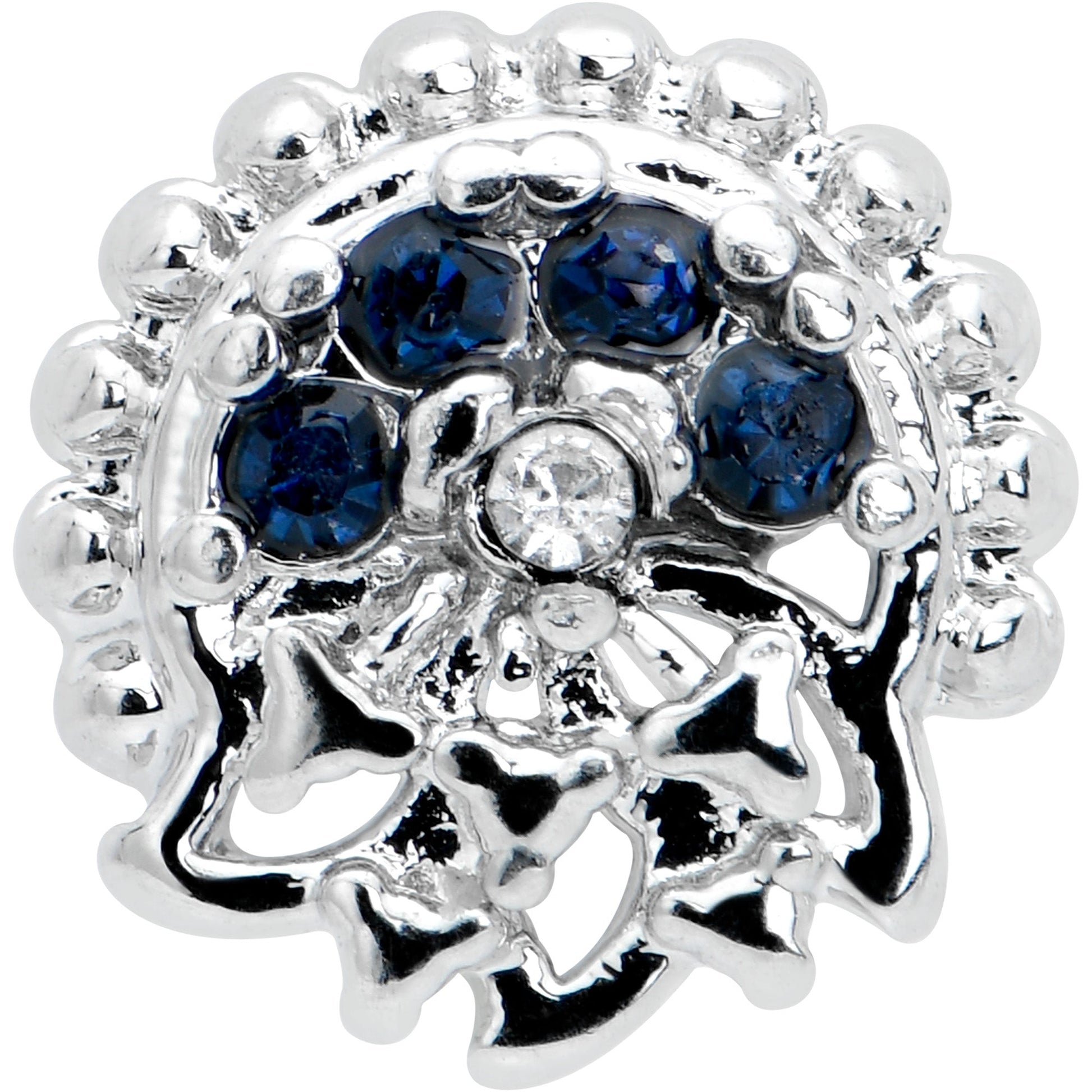 The curve on this 16 gauge tragus ring is sure to catch eyes! It's made with a 6mm durable 316L surgical grade stainless steel straight post with a flat disc end. It features an abstract arch charm, with the outermost rim set with textured embellishment and the inner curve set with deep blue gems. Below that is an abstract flower design with a clear gem center. You can even rock it in multiple piercings including tragus, helix, and some conch piercings. Get abstract with this elegant cartilage piercing ring!Specifications