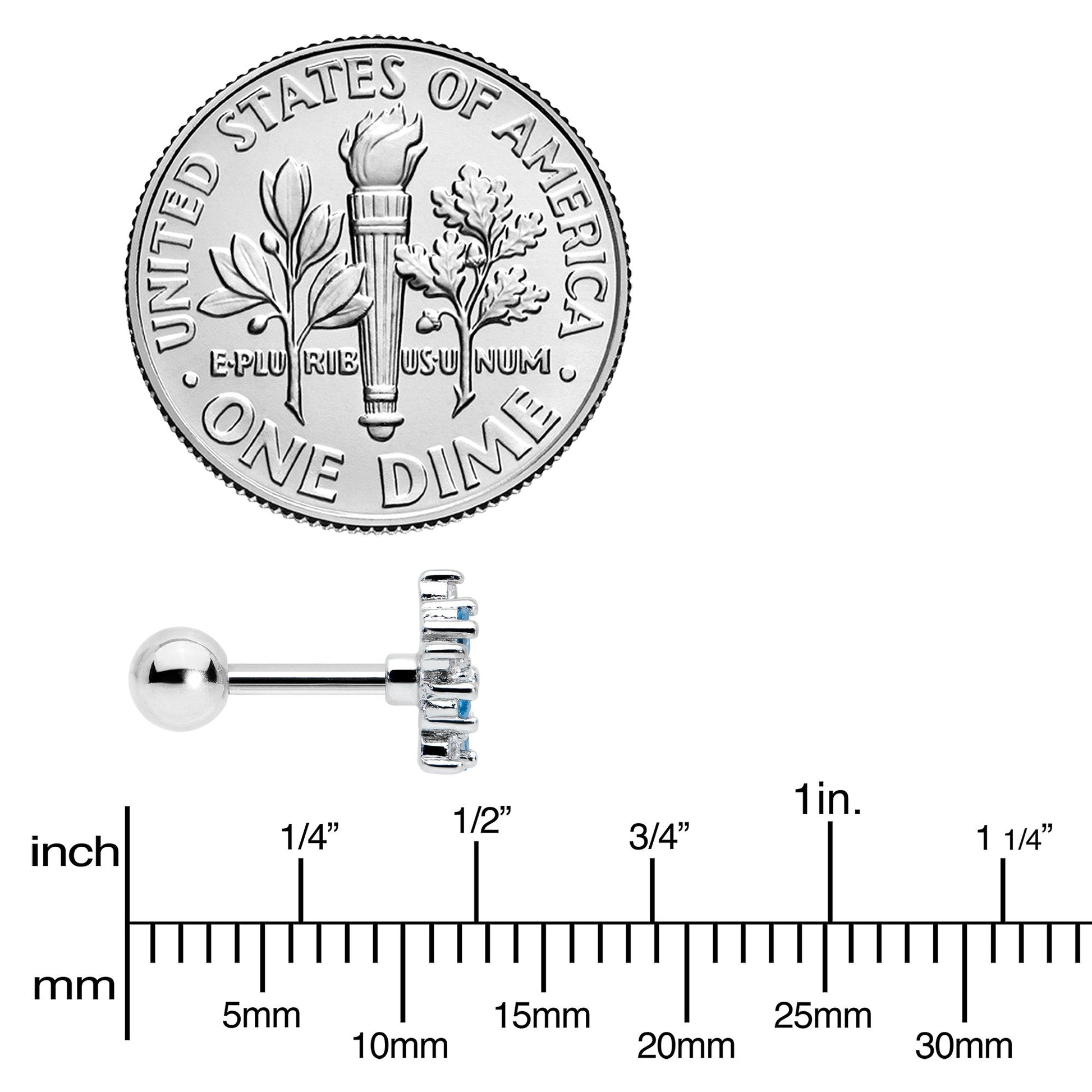 Your cartilage piercings will be bursting with style when you're rocking this 16 gauge tragus stud! It's made with a 6mm durable 316L surgical grade stainless steel straight barbell with a 4mm ball end. It features a floral charm, composed of blue cubic zirconia gems. The large petals are in full bloom and the flowers are further embellished with smaller, clear cubic zirconia gems along the edge. You can even flaunt this flower in multiple piercings including tragus, helix, and some conch piercings. Burst into style with this fabulous, flower cartilage stud!Specifications
