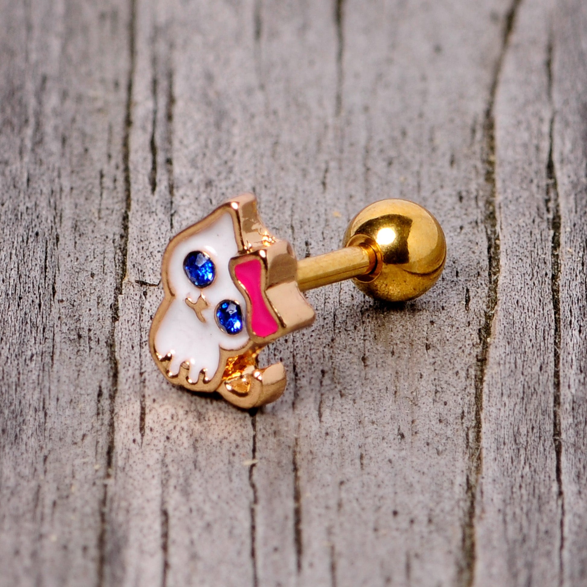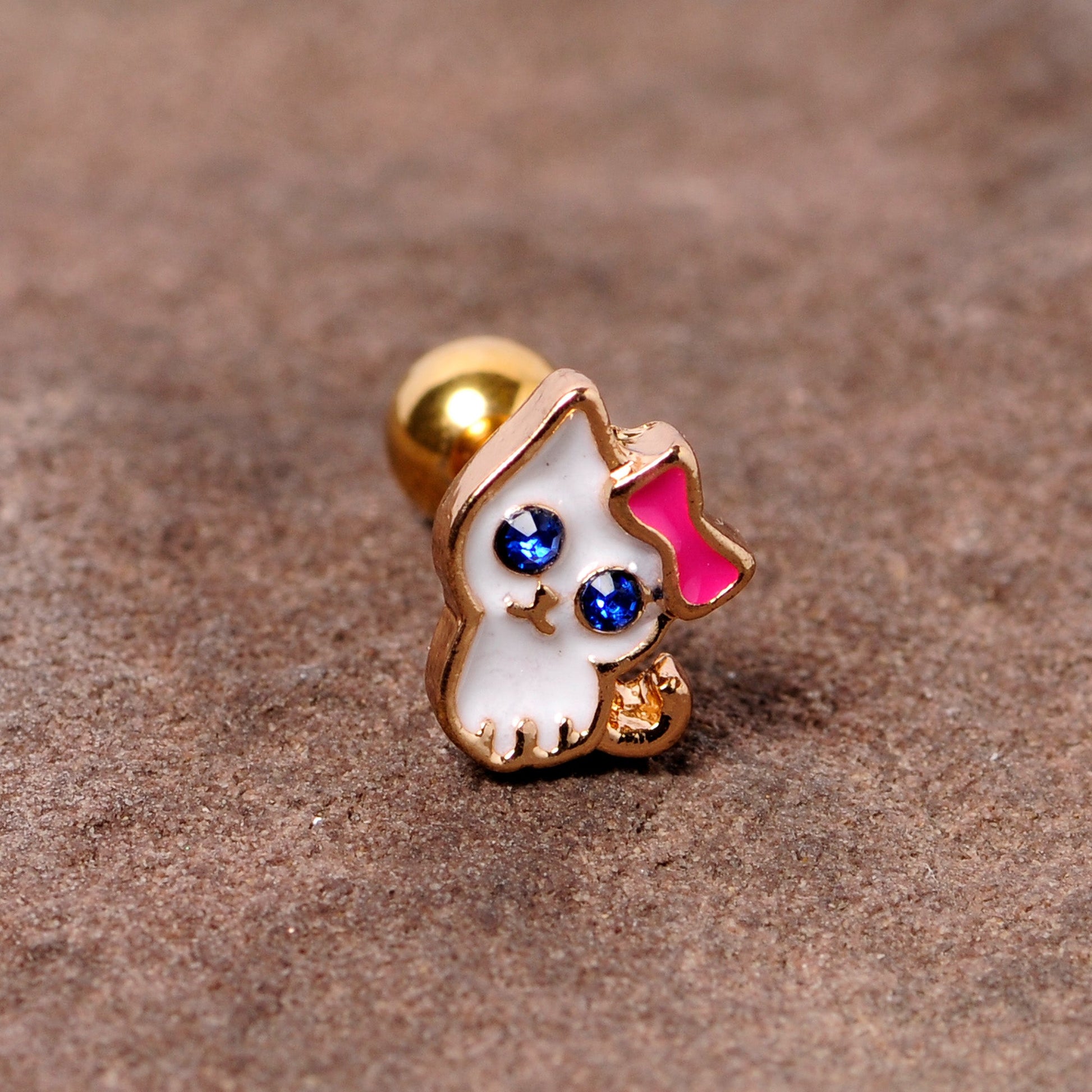 This 16 gauge pretty kitty is flaunting her big blue eyes in hopes that someone will give her a fur-ever home! This tragus piercing is made with a 6mm gold tone PVD over 316L surgical grade stainless steel straight barbell with a 4mm ball end and feature a white kitty cat charm with blue gem eyes and a pretty pink bow. Best of all, this cartilage stud can be worn in multiple cartilage piercings including the tragus, helix, and some conch piercings! So go ahead and take this cat cartilage jewelry home - she's sure to look purrfect in your piercings!Specifications