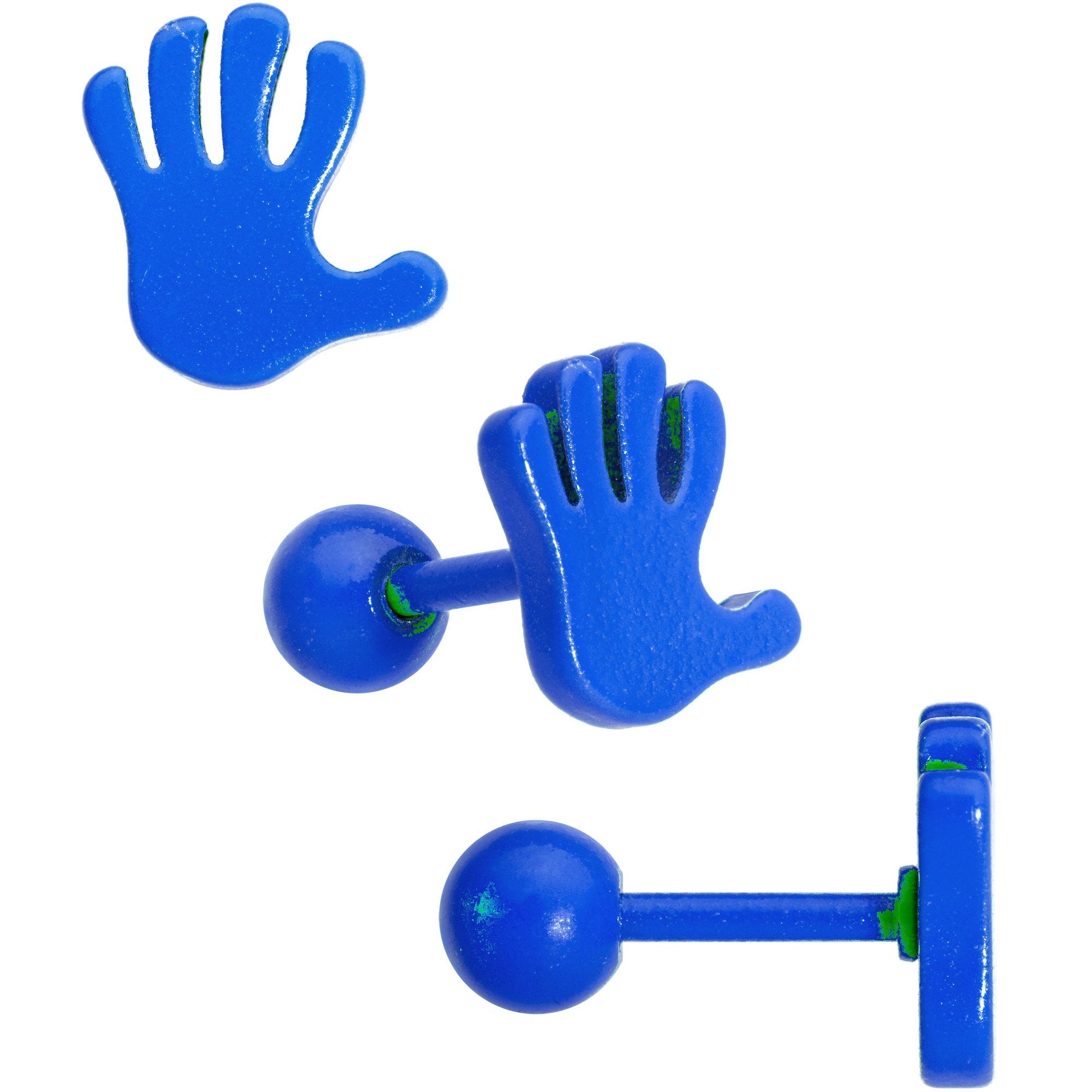 This set of 16 gauge cartilage earrings will stop you in your tracks! You get two earrings made with 6mm acrylic over durable 316L surgical grade stainless steel straight barbells and one made with a 6mm durable 316L surgical grade stainless steel straight barbell. All three have 3mm ball ends. The first is simple in appearance, blue with ball ends on both ends. The second one is also blue and features an end in the shape of a hand, spread as if saying "stop." The third one features a white end in the shape of a five-pointed star. But all three earrings are sharing a secret - turn out the lights and they glow in the dark! And these earrings work well in multiple piercings including helix and auricle. So stop....and get your glow on! Sold as a set of three.Specifications