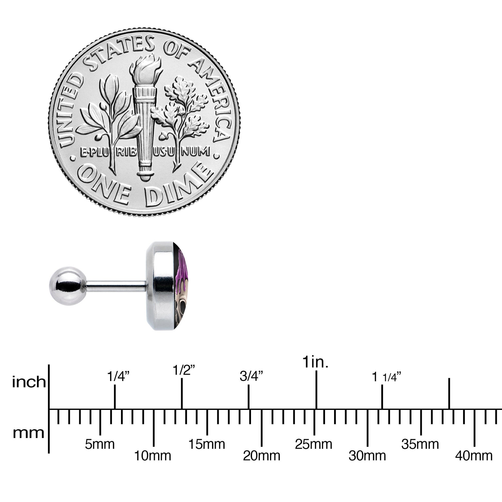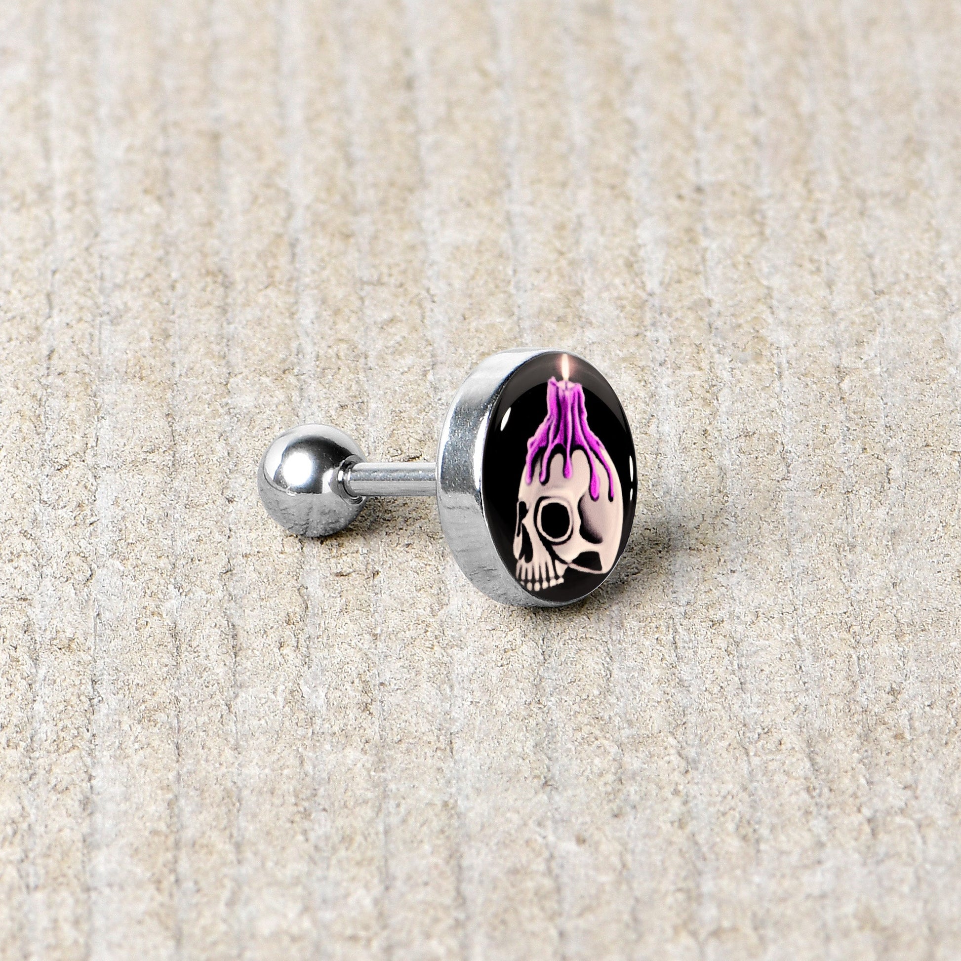 This 16 gauge tragus stud is totally lit! It's made with a 6mm durable 316L surgical grade stainless steel straight barbell with a 4mm ball end. It features a disc shaped skull charm. The skull is embellished with a lit purple candle, dripping wax down the skull. It's further embellished with a black background that really makes the image pop and you can rock it in multiple piercings including tragus, helix, and some conch piercings! Let your look cast a haunting spell when you're rocking this gorgeously gothic cartilage piercing ring!