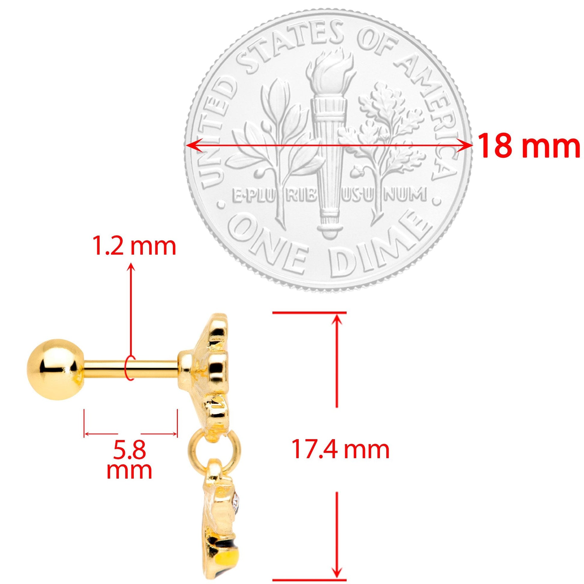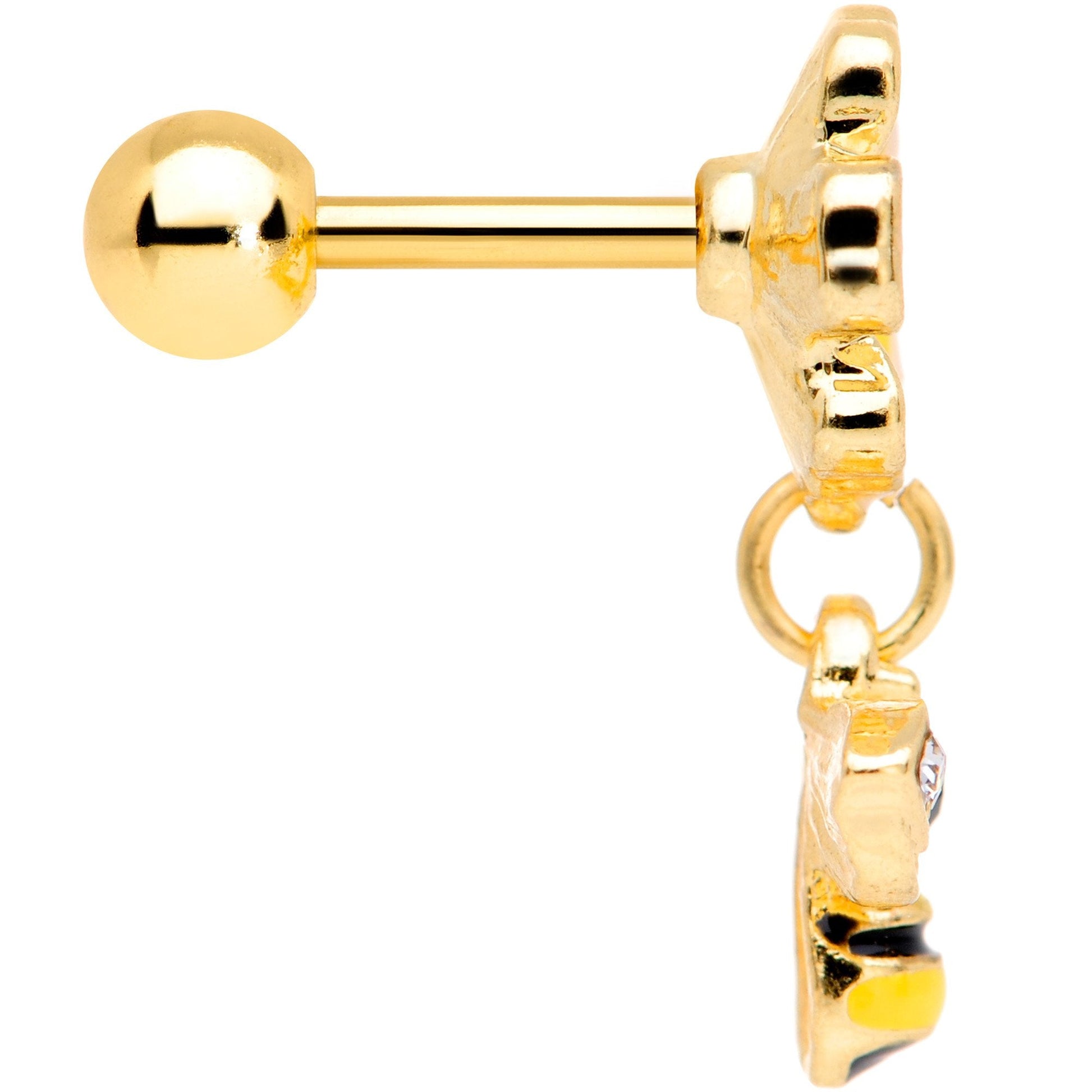 You don't need to get a bee in your bonnet to want a bee in your cartilage piercing! This cartilage stud is made with a 6mm gold tone PVD over 316L surgical grade stainless steel straight barbell and has a 4mm ball end. It features a white flower with a yellow center for some color contrast. Dangling from the flower is a small bee with black and yellow stripes. The bee has clear gems set in its wings and a small black gem set in the middle of its thorax. The overall look is colorful, cheerful, and utterly charming. This earring works well in multiple cartilage piercings including the tragus and helix. So pop it in your piercing - you'll bee thrilled with how it looks!Specifications