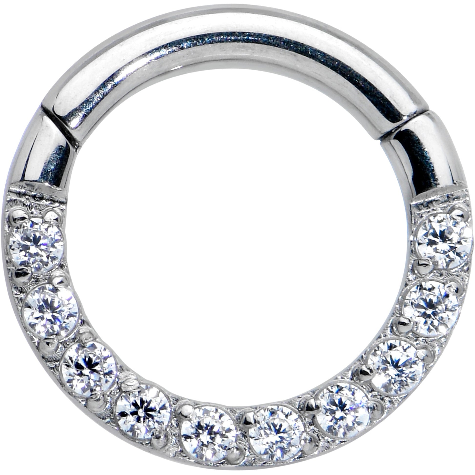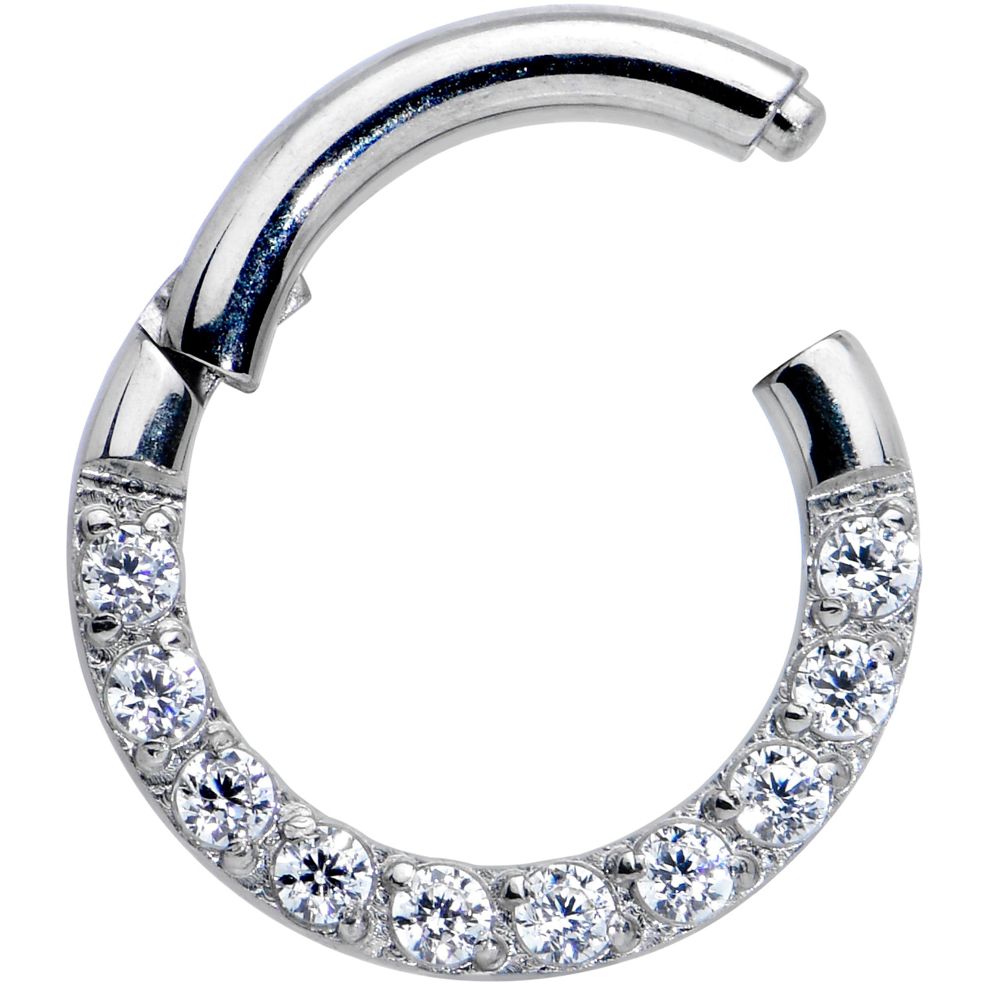 Add a look of sophistication to your cartilage piercings with this 16 gauge tragus ring! It's made with a 6mm solid grade 23 implant grade titanium hinged circular ring. The bottom arc of this cartilage earring is paved with clear cubic zirconia gems for a look that's totally attention-getting without being over-the-top. It also features a hinged, non-removable segment that makes insertion and removal a snap and it works well in multiple piercings including tragus, helix, and daith piercings. So why be subtle when you can be ultra-glam with this fabulously extravagant cartilage ring?Specifications