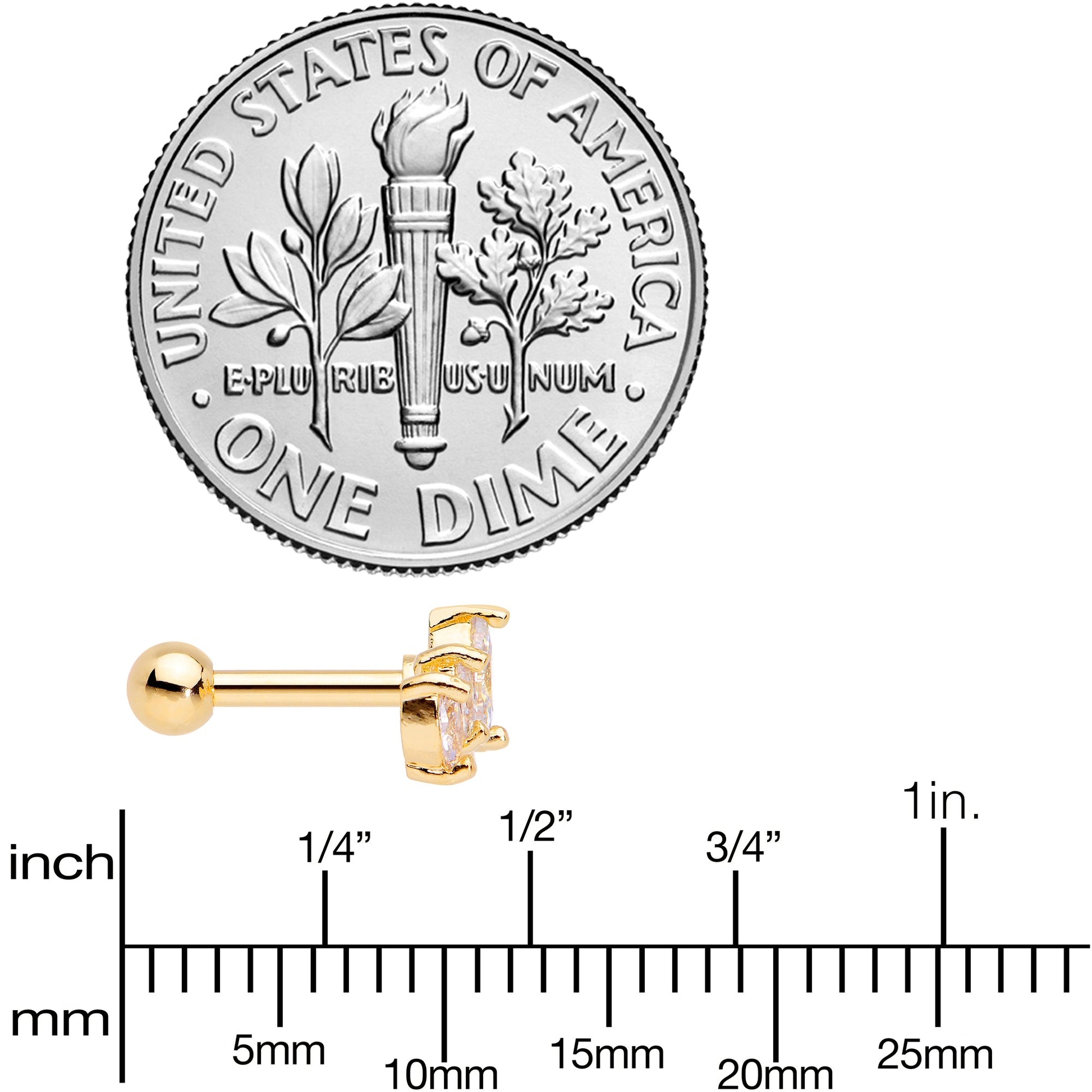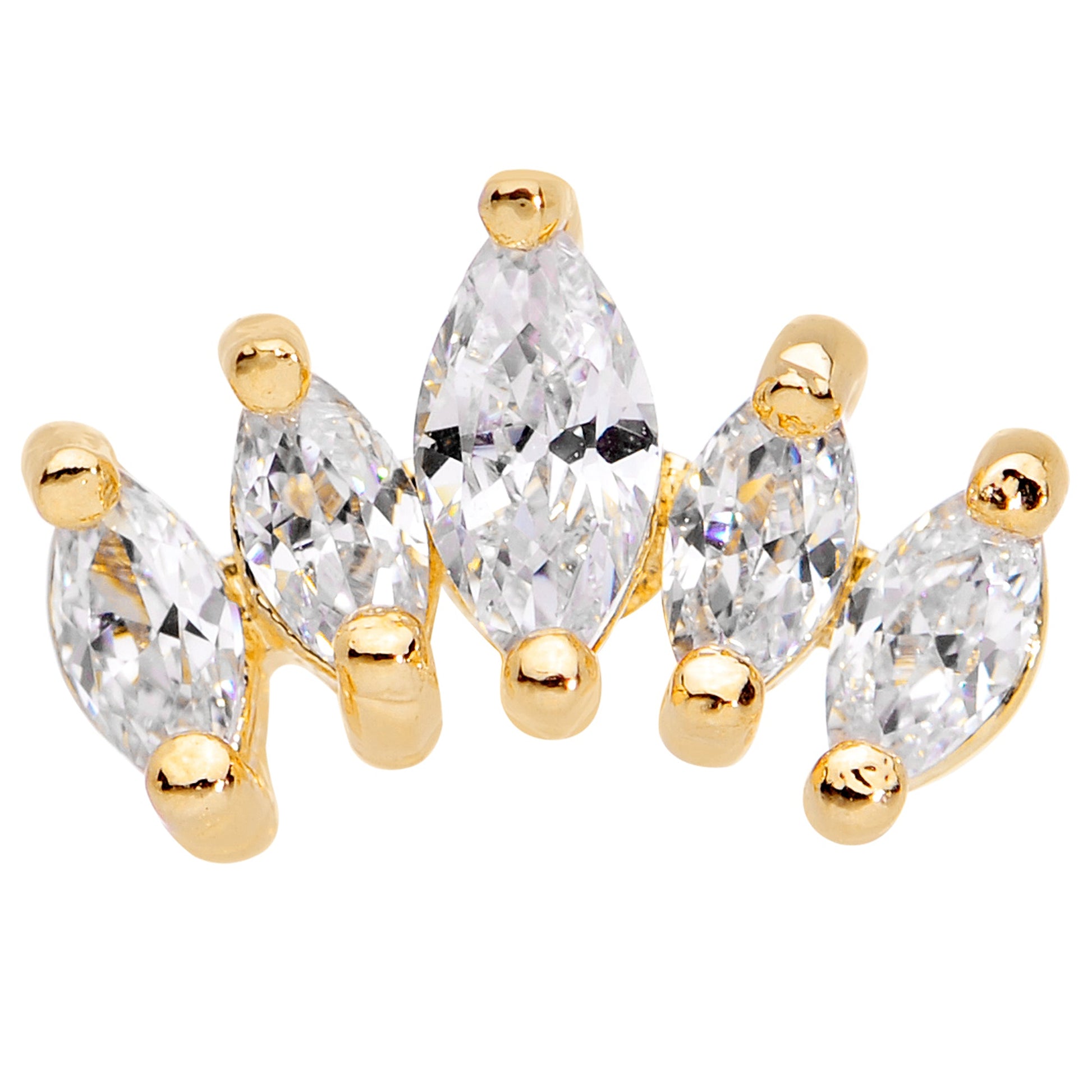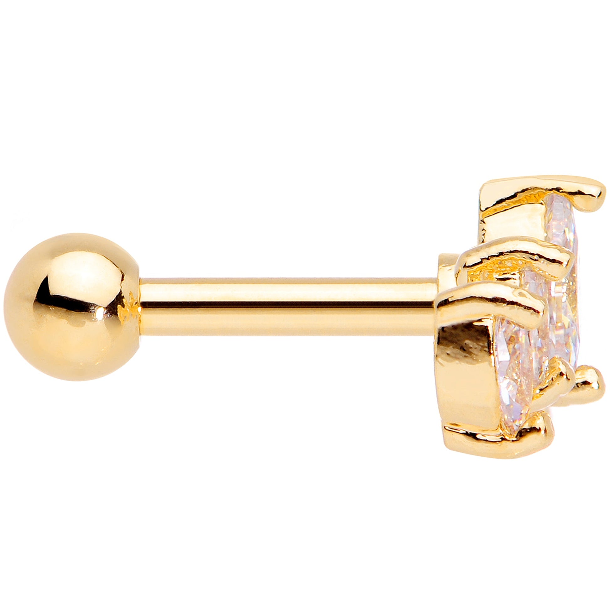 Crown your cartilage piercing like the royalty you know it is with this 16 gauge tragus stud! It's made with a 6mm gold tone plated over 316L surgical grade stainless steel straight barbell with a 3mm ball end. It features a crest of five clear cubic zirconia gems that resembles a crown and it's one you can bestow upon multiple piercings including tragus, helix, and some conch piercings. With this cartilage stud crowning your piercings, they'll absolutely rule.Specifications