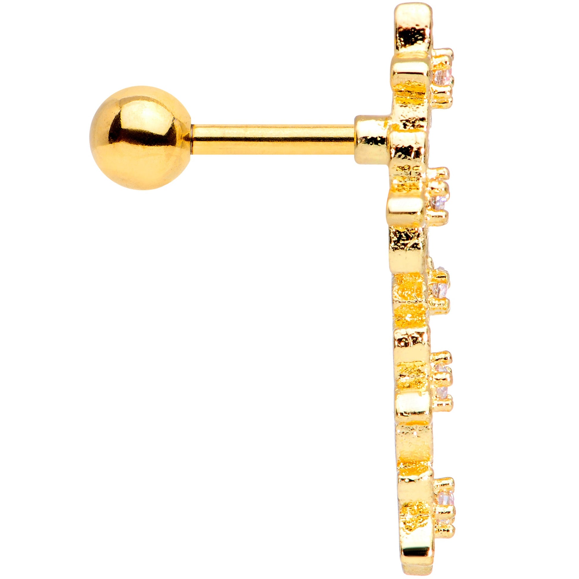 Give your cartilage piercings a look that's both stylish and ornate with this 16 gauge floral-themed cartilage stud. It's made with a 6mm gold tone PVD over 316L surgical grade stainless steel straight barbell with a 4mm ball end. It features a string of flowers charm with clear cubic zirconia gems set in each of their five petals and another one set at their center for a truly baroque appearance. This cartilage jewelry works well in multiple piercings, particularly helix but also some conch and tragus piercings. Set your piercings apart from the crowd with this fabulously floral tragus stud.Specifications