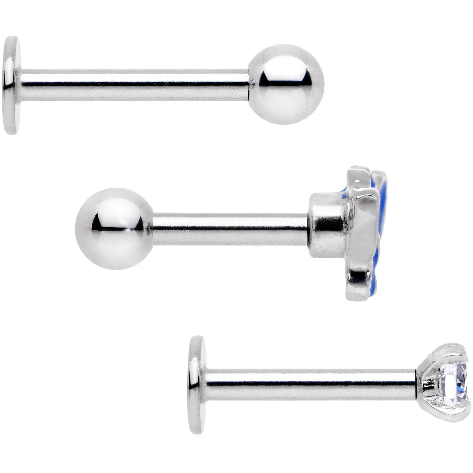 If you're all about the outdoors then you will love this set of 16 gauge tragus piercings. Made with 6mm durable 316L surgical grade stainless steel straight barbells, these cartilage earrings feature a plain ball end, blue butterfly end, and clear gem end to be worn in a variety of cartilage piercings. Sold as a set of three.Specifications