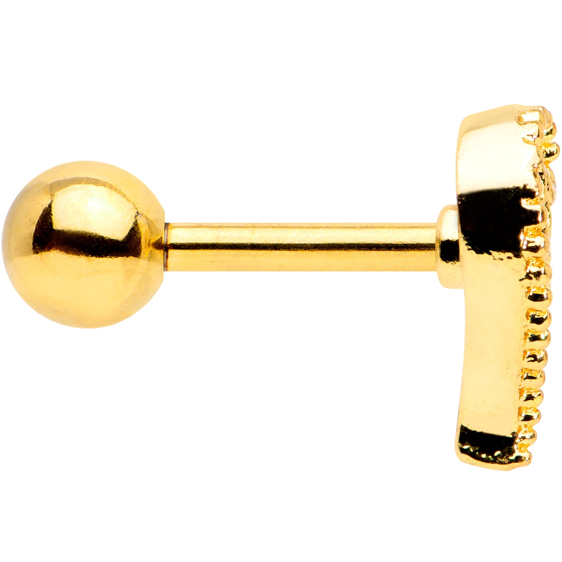 Give your cartilage piercing the heart of an angel with this 16 gauge tragus stud! It's made with a 6mm gold tone PVD over 316L surgical grade stainless steel straight barbell with a 4mm ball end. It features a heart-shaped charm with one side and an angel's wing on the other, with open work feathers for an airy feel. The wing is also embellished with clear gems for a look that's truly heavenly! You can even wear this wing in multiple piercings including helix, tragus, and some conch piercings. Wear your love to the heavens with this angelic cartilage stud!Specifications
