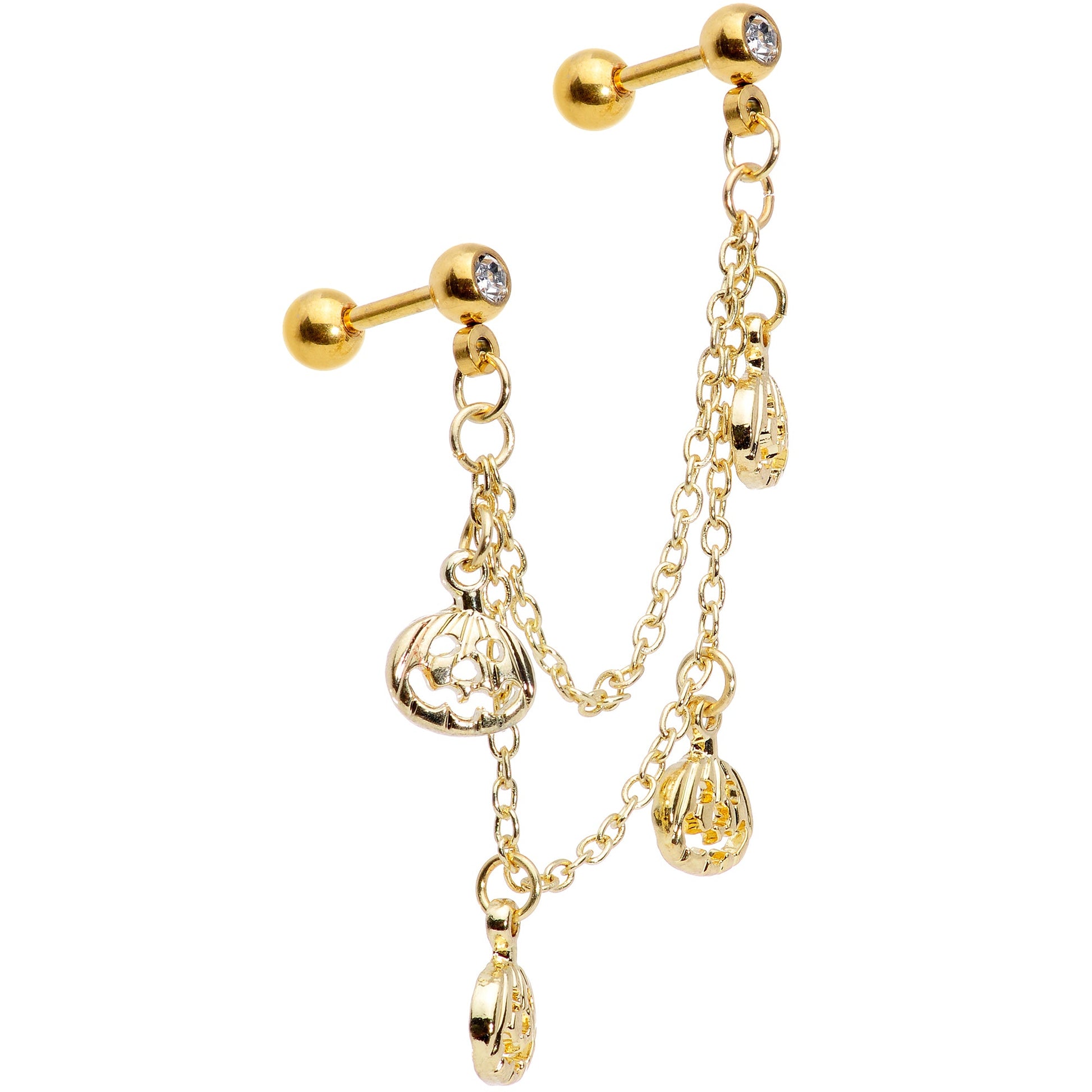 If you're looking to get extra creative with your cartilage piercings this Halloween, your prayers are answered with this 16 gauge cartilage to cartilage chain earring! It's made with two 6mm gold tone anodized over 316L surgical grade stainless steel straight barbells with clear gems set into the 4mm ball ends. The two are connected by two lengths of chain. The top chain is 2" in length while the bottom chain is long enough to hang freely. Dangling from the bottom chain are several pumpkin charms, with textured detailing and cut-out jack o'lantern features. Perfect for any two cartilage piercings and perfect for Halloween!Specifications
