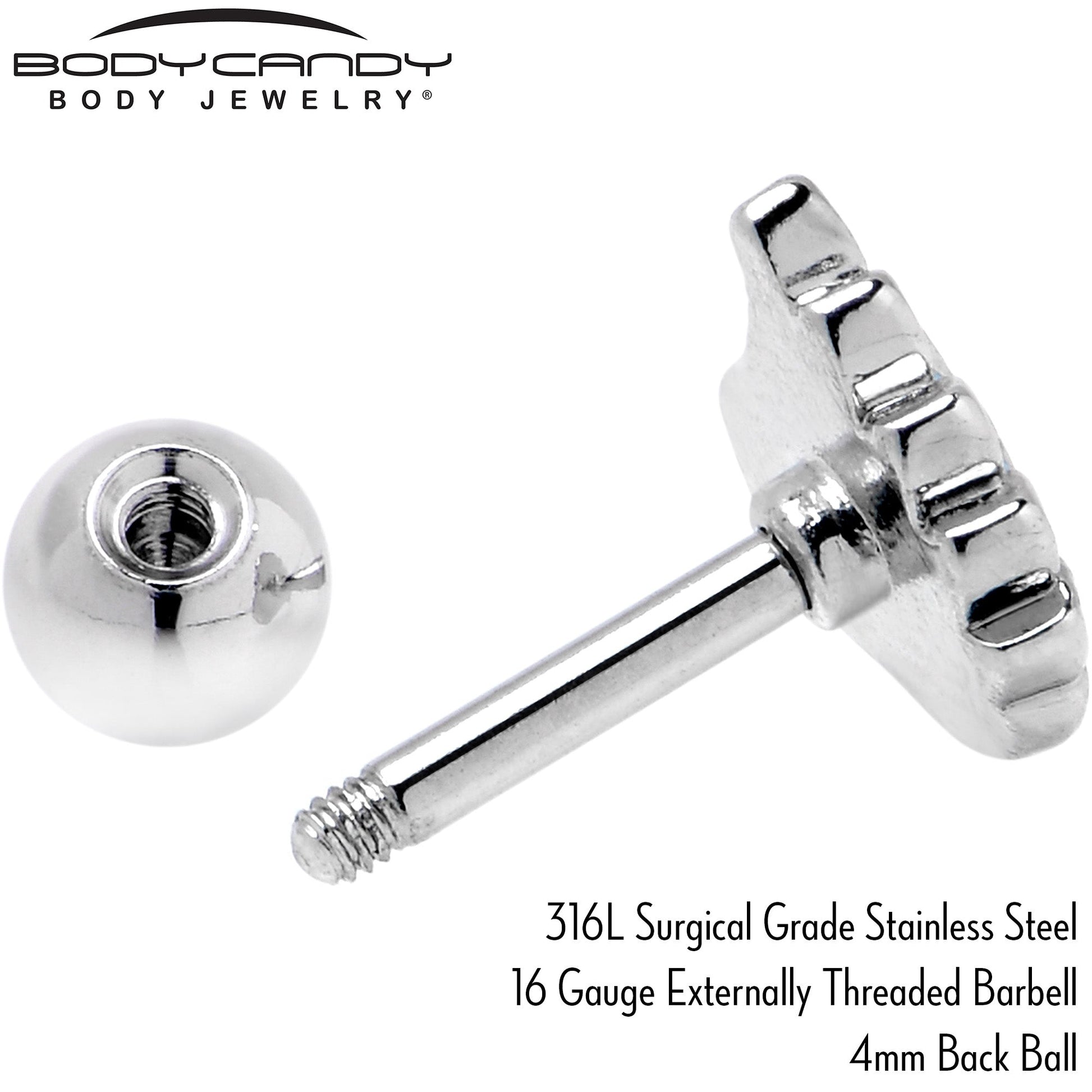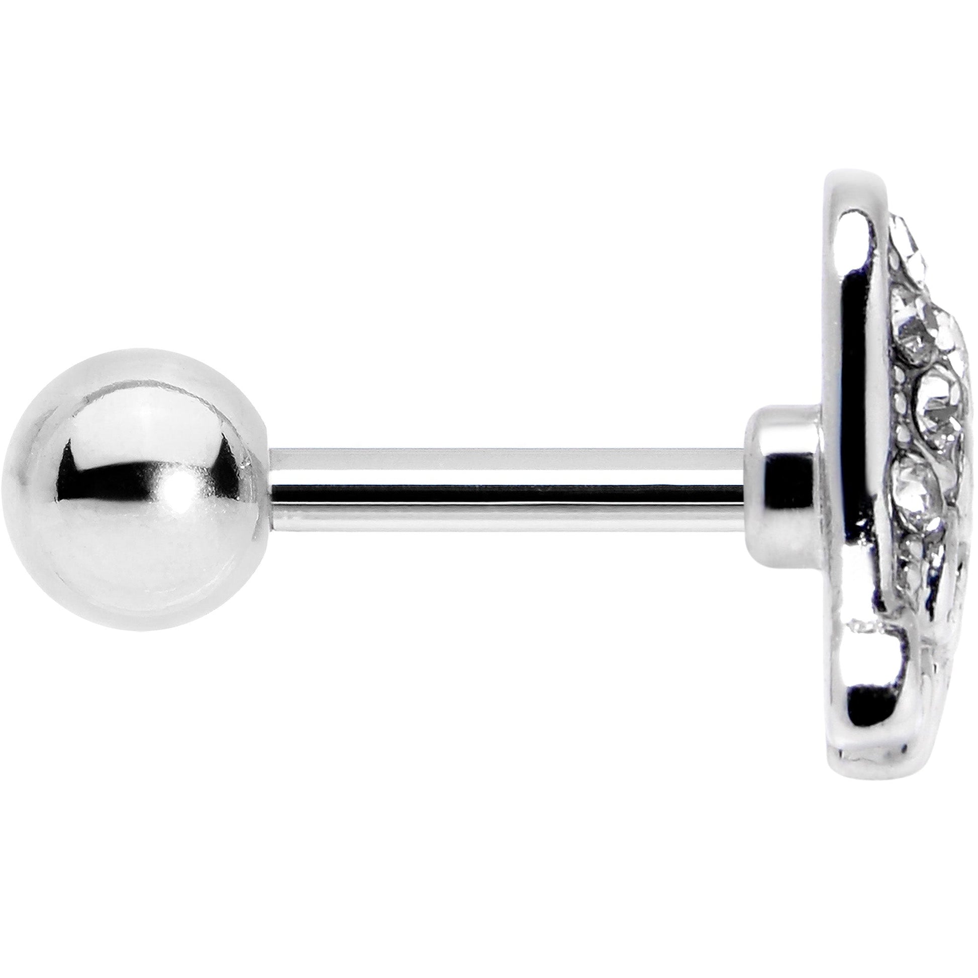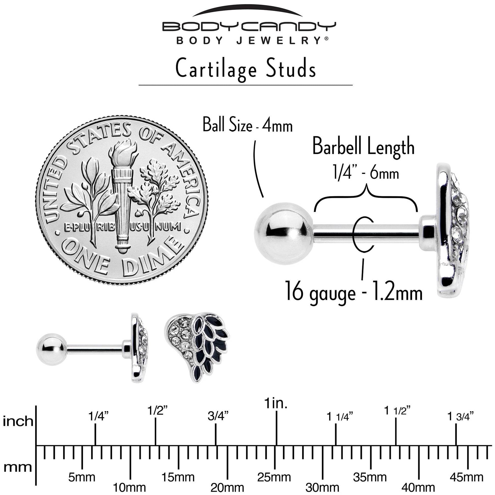 Give yourself a heavenly new look with this 16 gauge tragus stud. It's made with a 6mm durable 316L surgical grade stainless steel straight barbell with a 4mm ball end. It features a heart shaped charm featuring an angel's wings, with one side paved with clear gems. The other side features black inlay and simply styled feather details and you can rock it in multiple piercings including tragus, helix, and some conch piercings. Let your look and your spirit soar with this stylish and spiritual cartilage piercing jewelry.Specifications