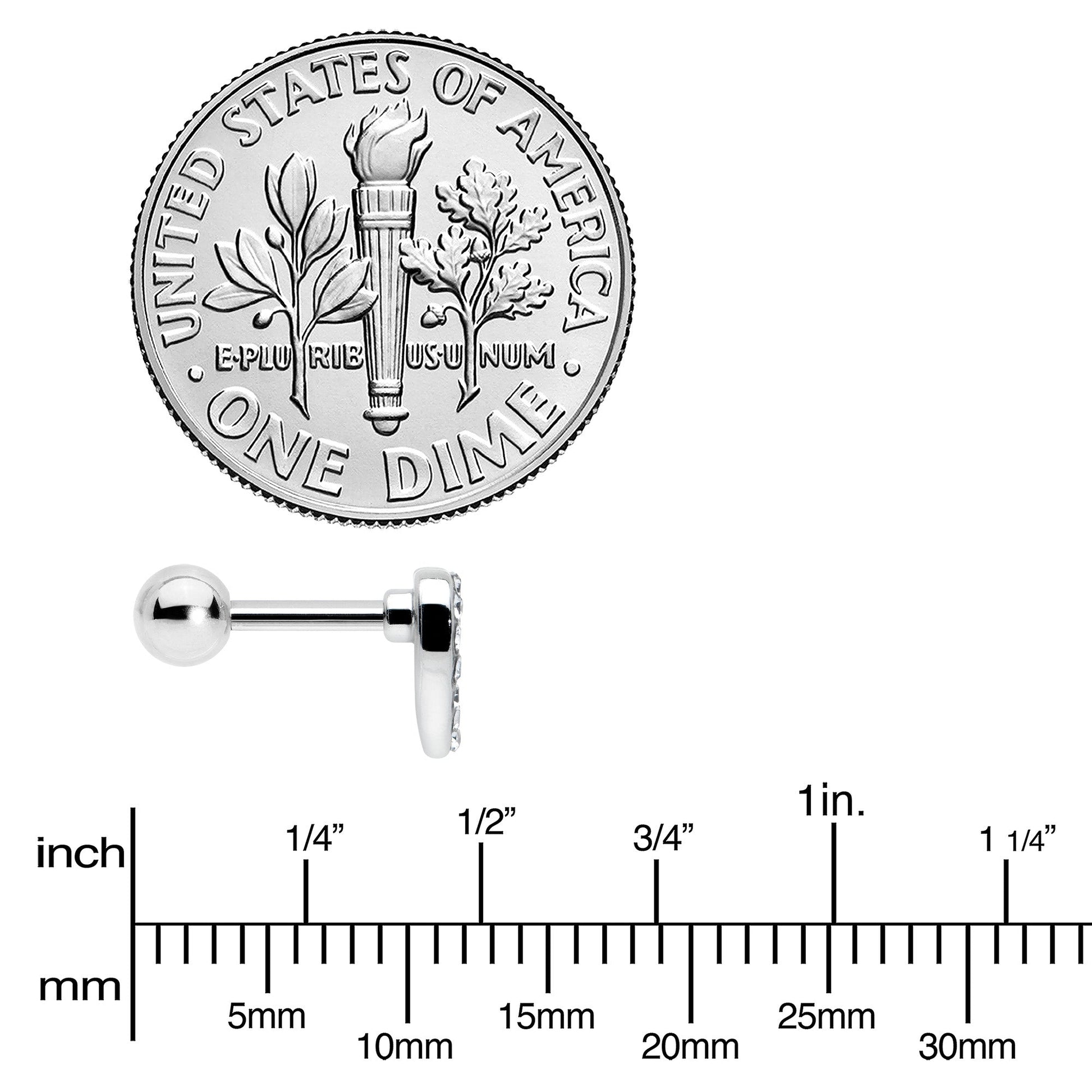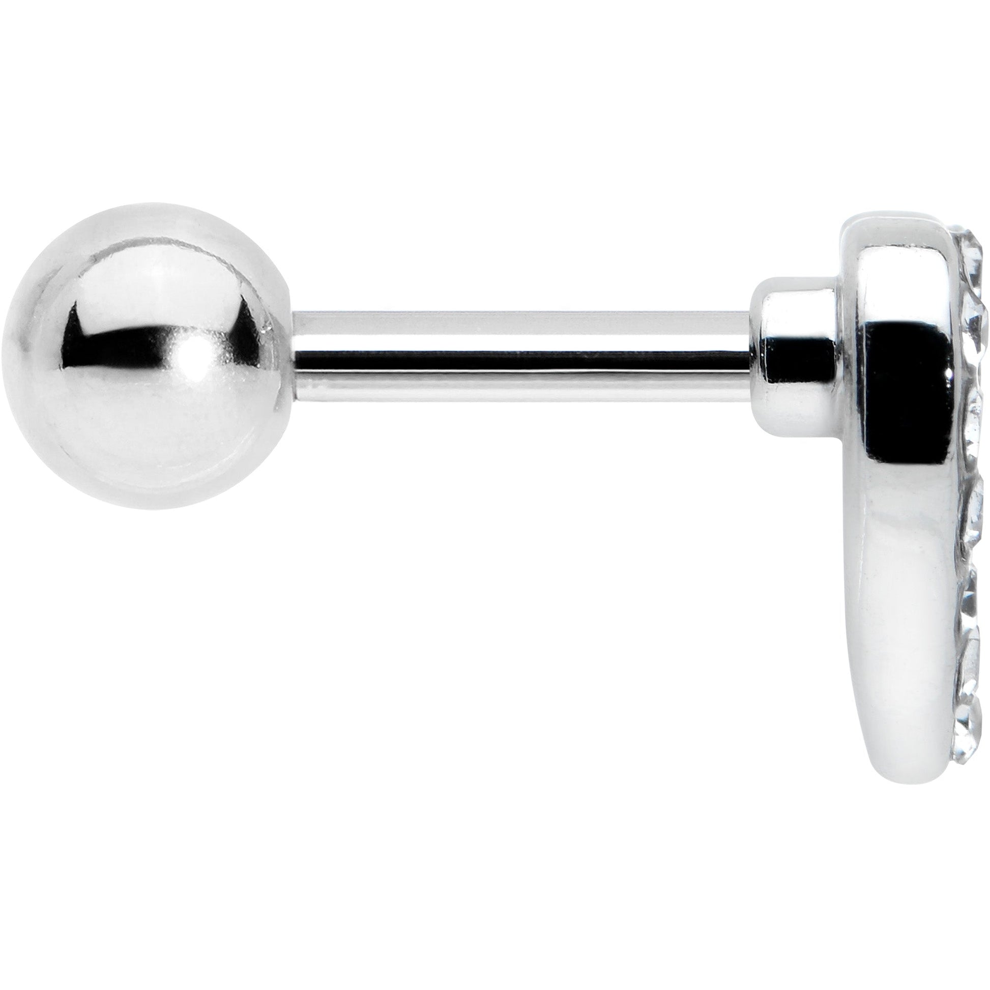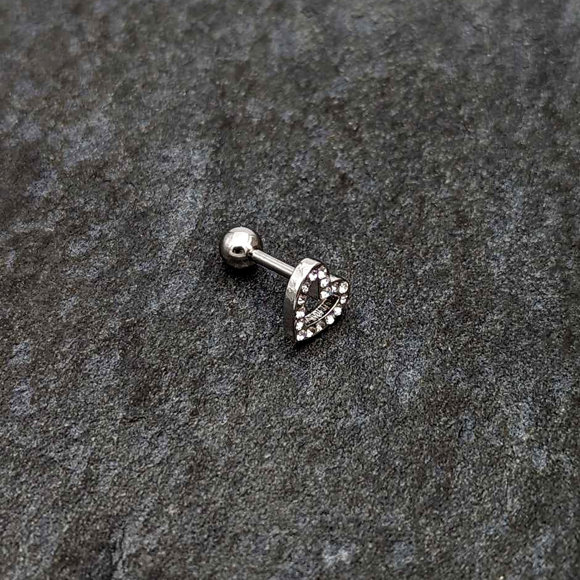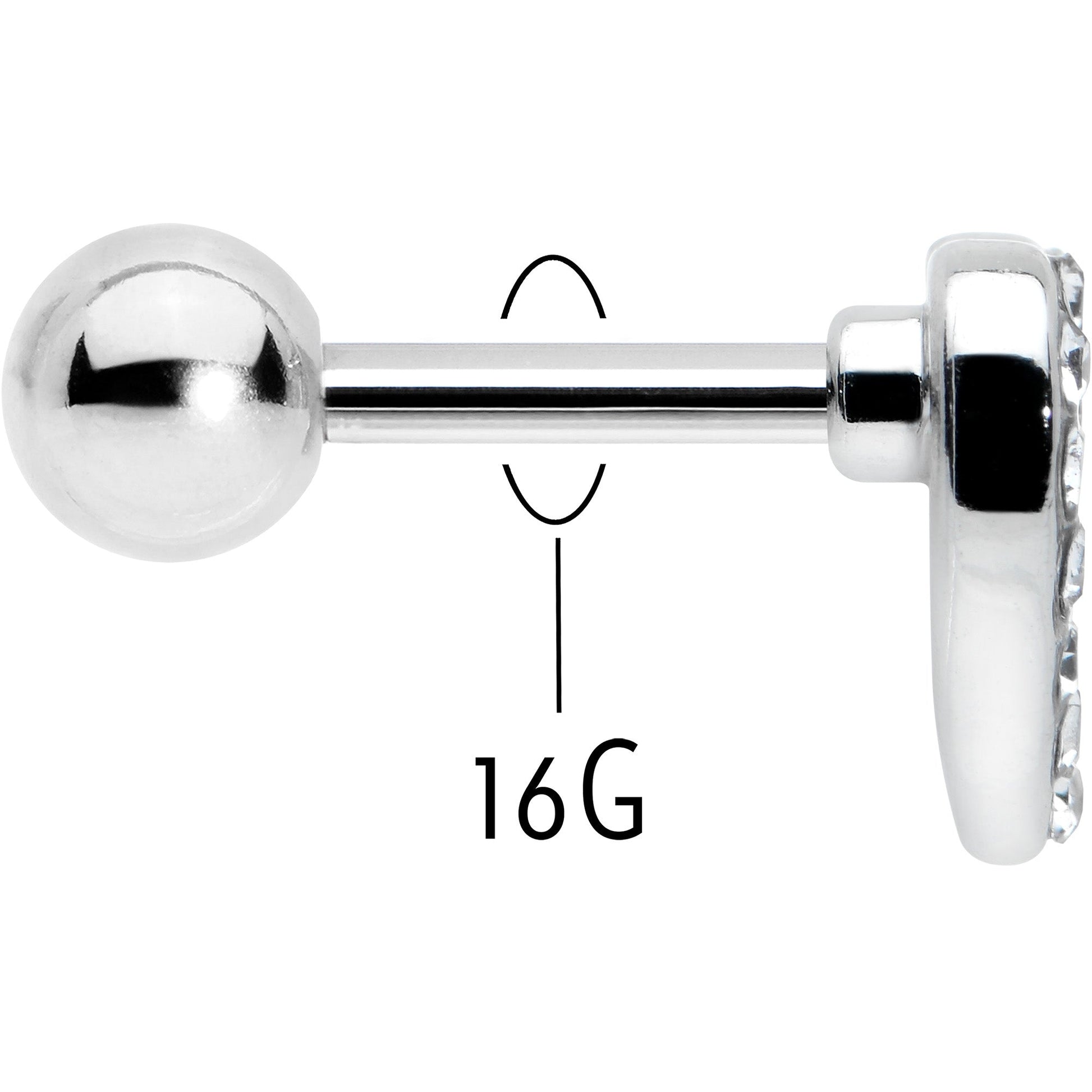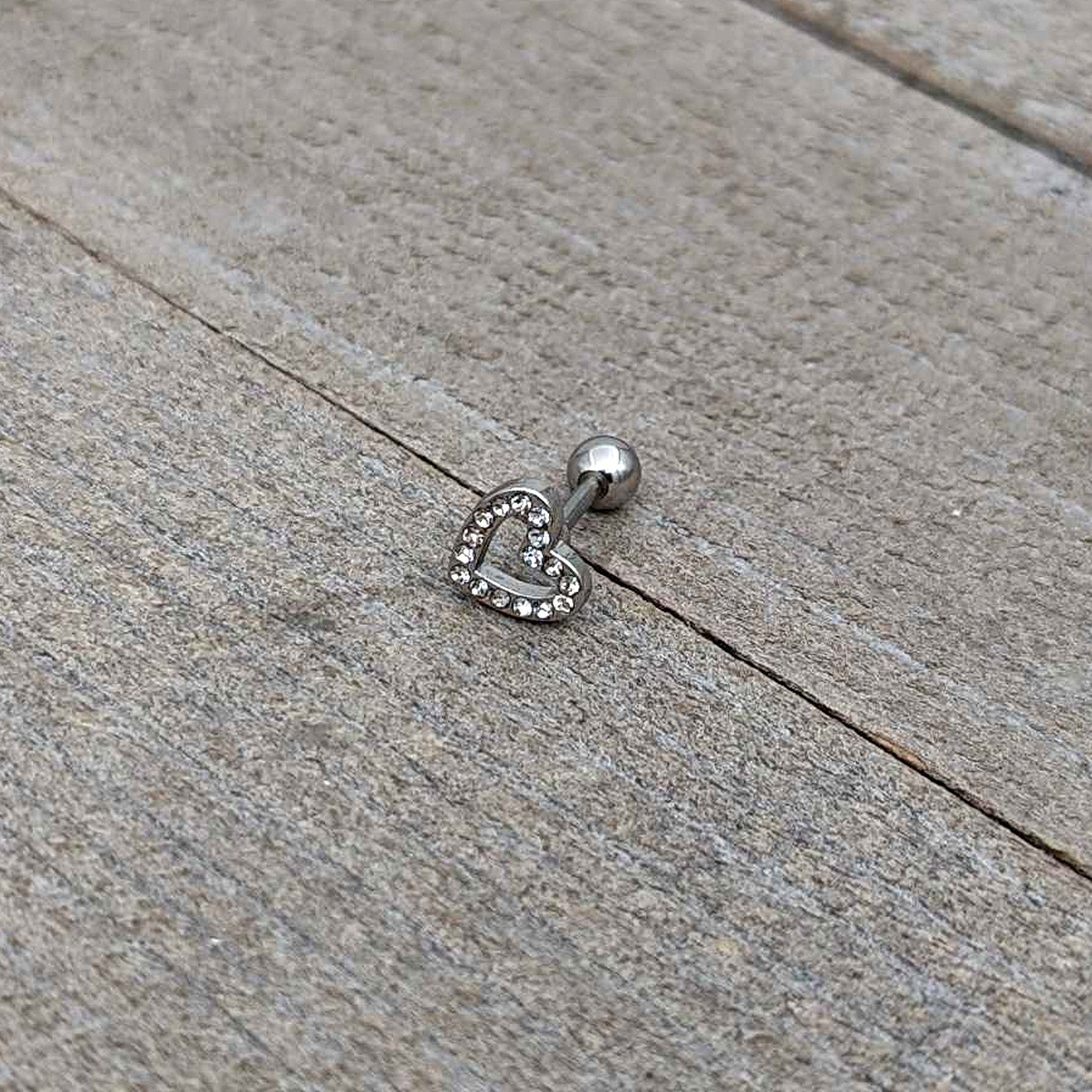 Keep your heart open and the world will notice - like on this 16 gauge tragus stud! It's made with a 6mm durable 316L surgical grade stainless steel straight barbell with a 4mm ball end. It features a hollow heart charm, with the heart paved with clear gems. The heart is open at the center for an airy look. You can even rock it in multiple piercings including tragus, helix, and some conch piercings. For the incurable romantic, this understated valentine's cartilage piercing ring is sure to make you fall in love!Specifications