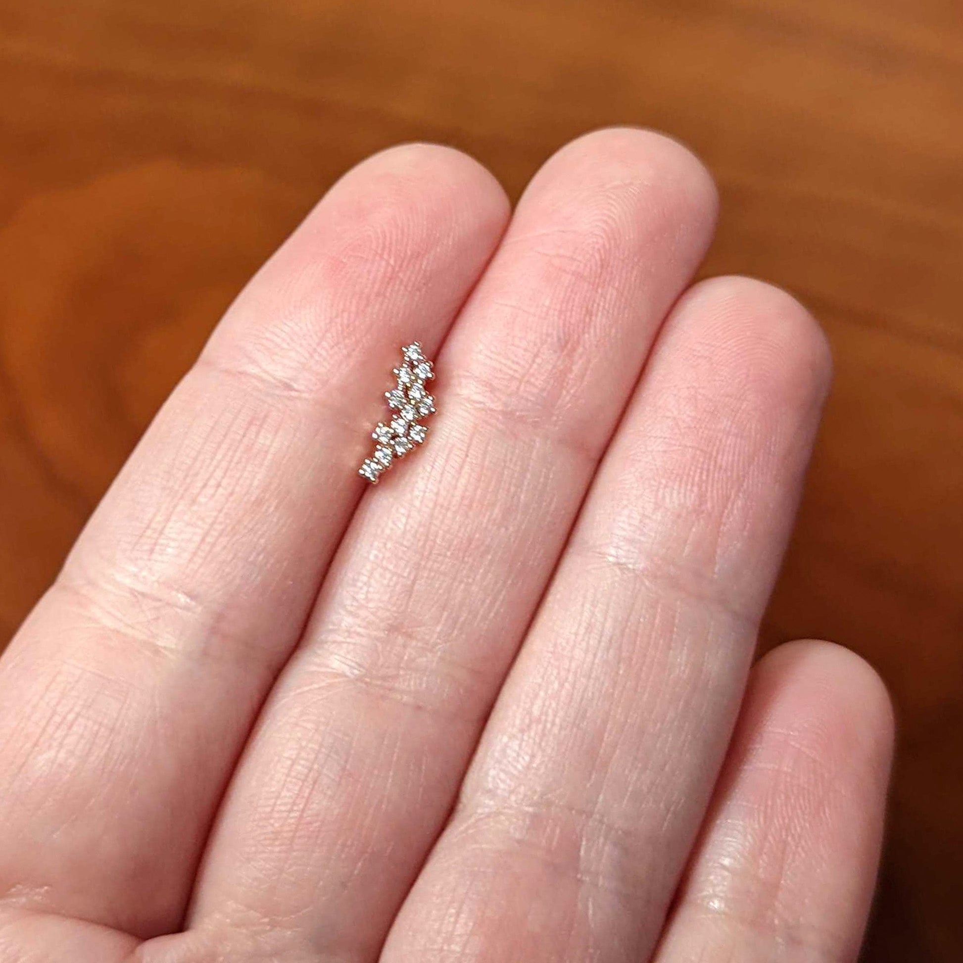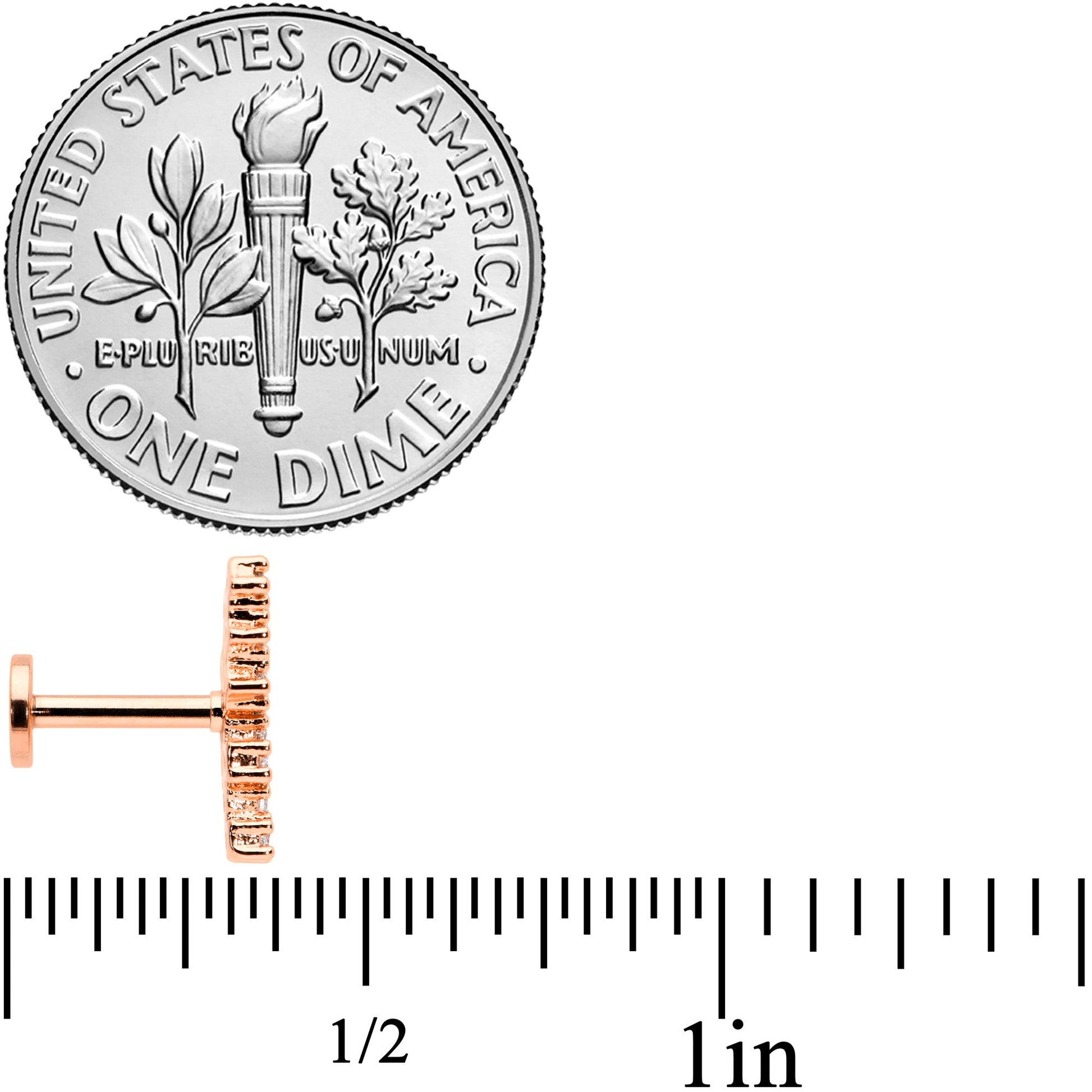 The arc on this 16 gauge lip ring is so simply elegant, it'll have your head going in circles! It's made with a 6mm rose gold tone PVD over 316L surgical grade stainless steel straight barbell with a flat disc end. It features an arc charm of clear cubic zirconia gems with textured detailing. It also features an internally threaded design that makes insertion and removal extra comfortable and you can even rock it in multiple piercings including tragus, helix, and some conch piercings. This elegant cartilage piercing ring has it all!Specifications