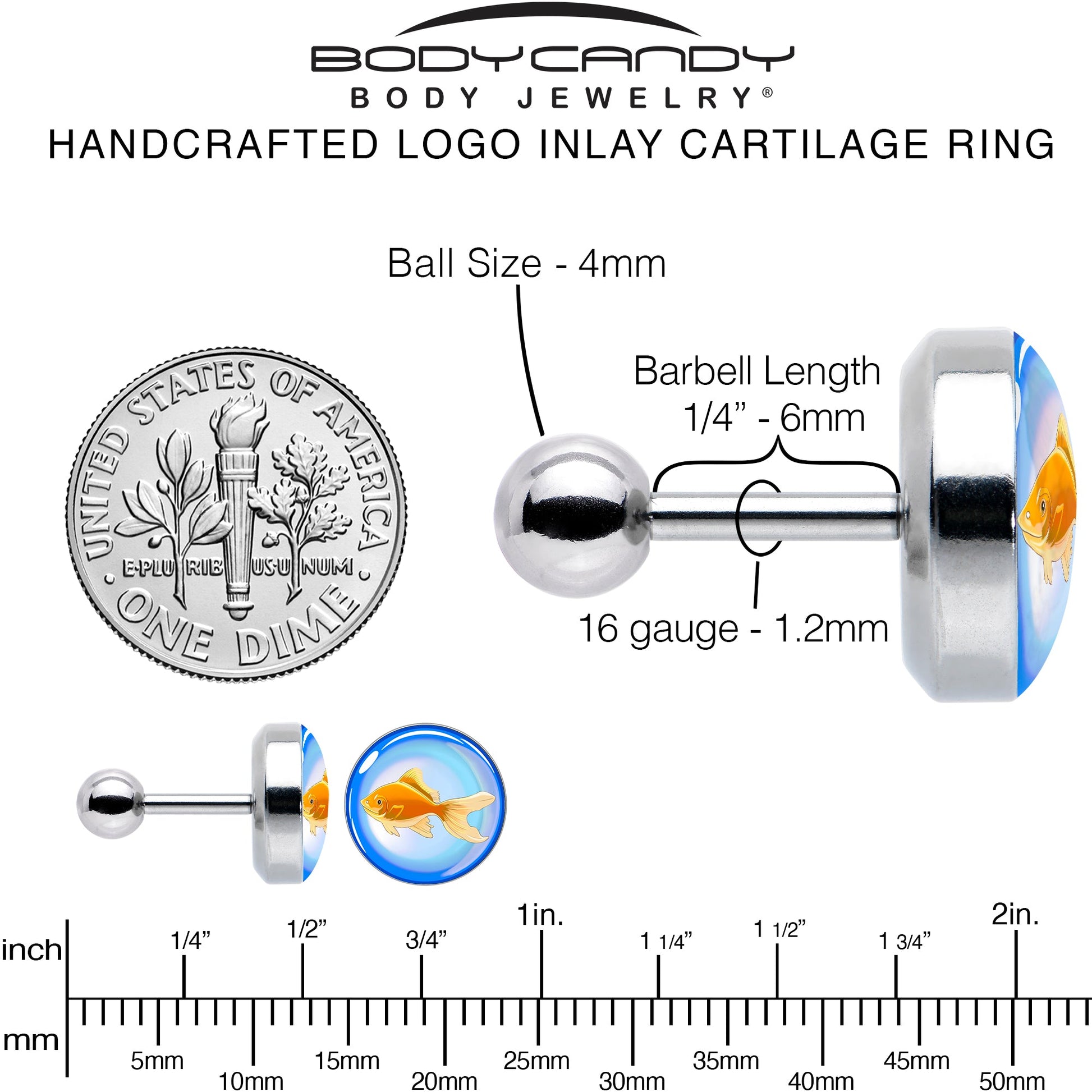 Gold is always gorgeous, but even more so when it is the goldfish on this 16 gauge tragus stud. It is made with a 6mm durable 316L surgical grade stainless steel straight barbell with a 4mm ball end. It features a blue disc with a goldfish on it. The fish is realistically detailed, with elegantly flowing fins and intricate shading and you can rock it in multiple piercings including tragus, helix, and some conch piercings. You will be absolutely golden when you are rocking this fabulous fish cartilage piercing jewelry.