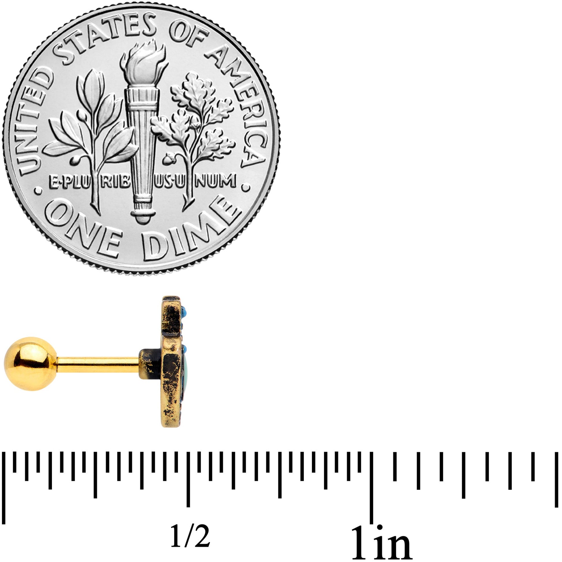 Get spiritual on the outside as well as the inside with this 16 gauge tragus stud! It's made with a 6mm gold tone PVD over 316L surgical grade stainless steel straight barbell with a 4mm ball end. It features a sacred hamsa hand charm heavily embellished with complementary shades of blue orbs, as well as contrasting black orbs for added visual impact. You can even sport this spiritual cartilage stud in multiple piercings including tragus, helix, and some conch piercings. Add a touch of the sacred to your cartilage piercing with this sublimely splashy cartilage earring!Specifications