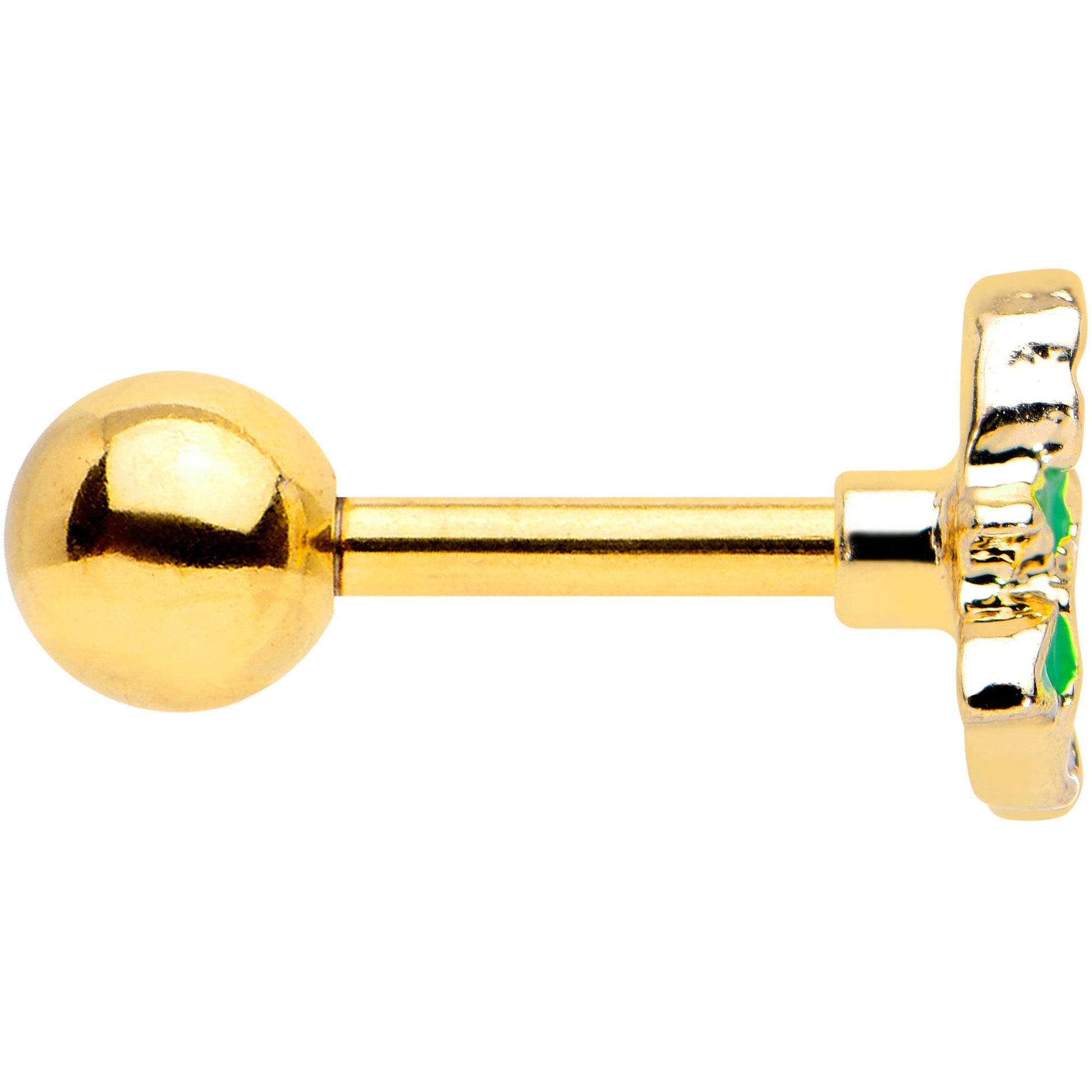 You'll feel absolutely floral with this elegant flower 16 gauge cartilage stud! It's made with a 6mm gold tone PVD over 316L surgical grade stainless steel straight barbell with a 4mm end. It features a white flower charm that screams spring. It's embellished with green leaves for an added touch of realism. You can even flaunt this flower in multiple piercings including tragus, helix, and some conch piercings. Between the luscious color contrast and splashy styling, this flower is sure to make an impression!Specifications
