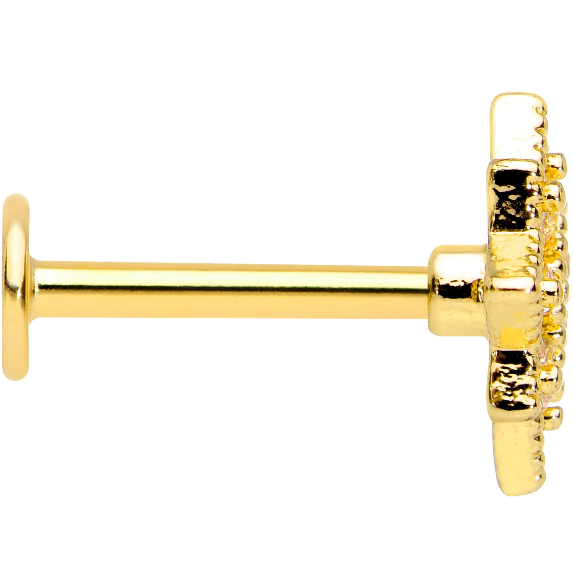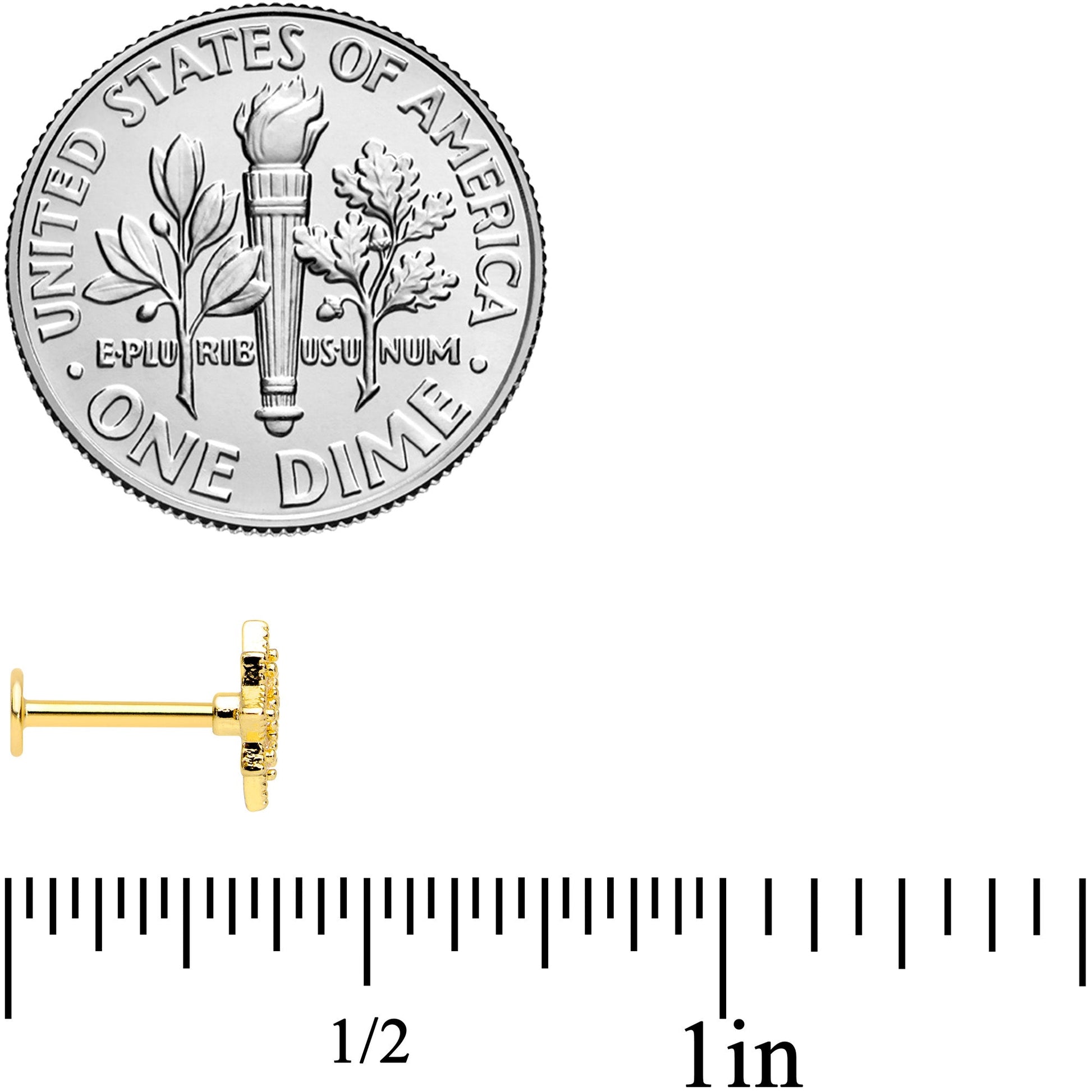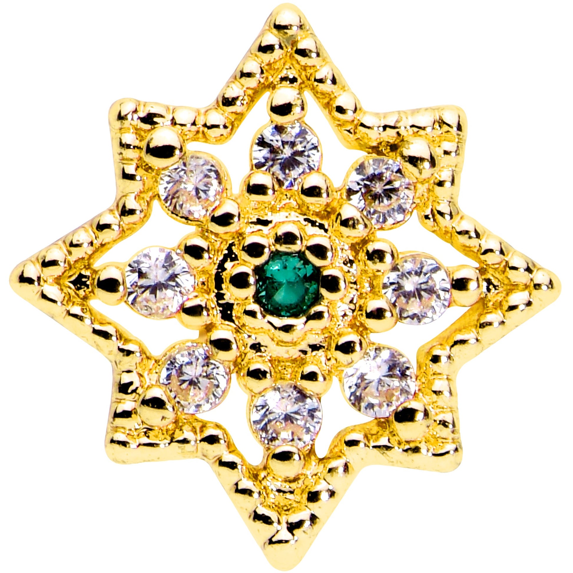 Be a star in the universe like the star on this 16 gauge cartilage jewelry! It's made with a 6mm gold tone PVD over 316L surgical grade stainless steel straight barbell with a flat disc end. It features an eight-pointed star charm. The star features a clear gems set on each point and is set at the center with a green gem for a gorgeous color contrast. And you can sport this star in multiple piercings including tragus, helix, and some conch piercings. Let your cartilage piercings be stars with this splendid star cartilage ring!Specifications