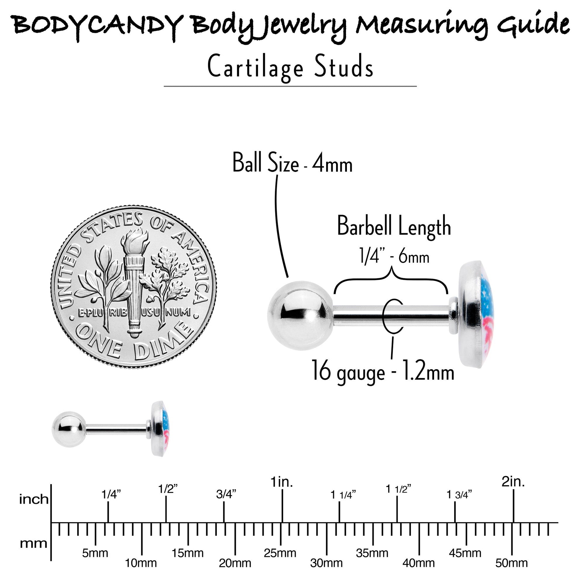 Show your love for the flag this 4th with this 16 gauge tragus stud. It is made with a 6mm durable 316L surgical grade straight barbell with a 4mm ball end. It features a white disc shaped charm with a heart on it. The heart is composed of the American flag, with one upper curve in blue, embellished with white stars. You can even rock it in multiple piercings including tragus, helix, and some conch piercings. Flaunt your flag for the fourth with this patriotic cartilage piercing ring.Specifications