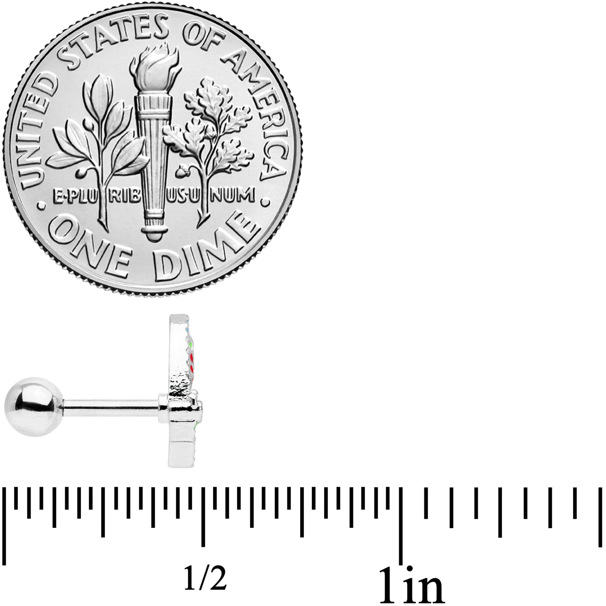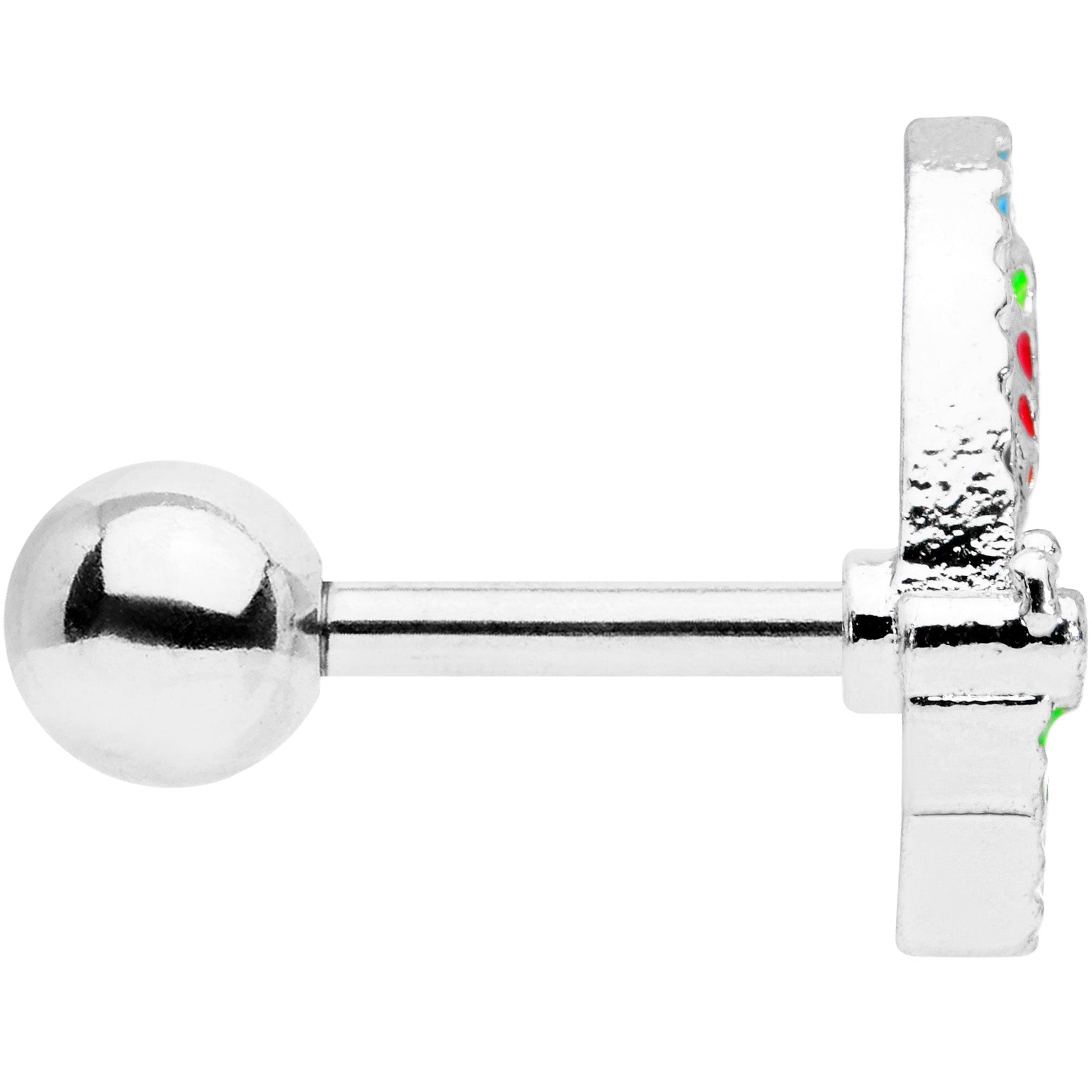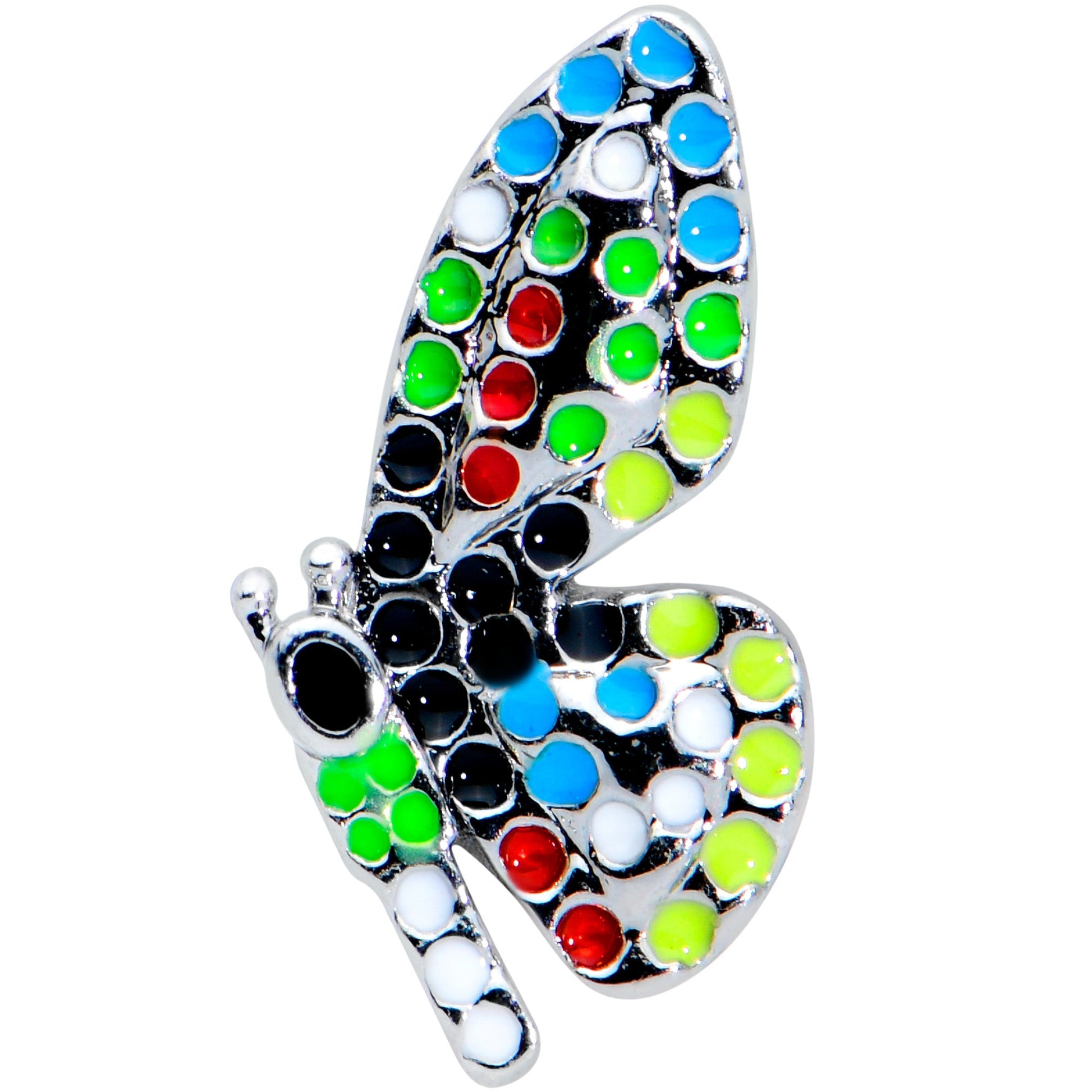 Add a vibrant punch of color to your cartilage piercings with this 16 gauge tragus stud! It's made with a 6mm durable 316L surgical grade stainless steel straight barbell with a 4mm ball end. It features a butterfly charm. The butterfly is set with an array of embellishments in a rainbow of colors, such as red, yellow, and blue. You can even wear it in multiple piercings including helix, tragus, and some conch piercings. This beautiful butterfly is sure to brighten your day with its gorgeously multi-hued wings!Specifications