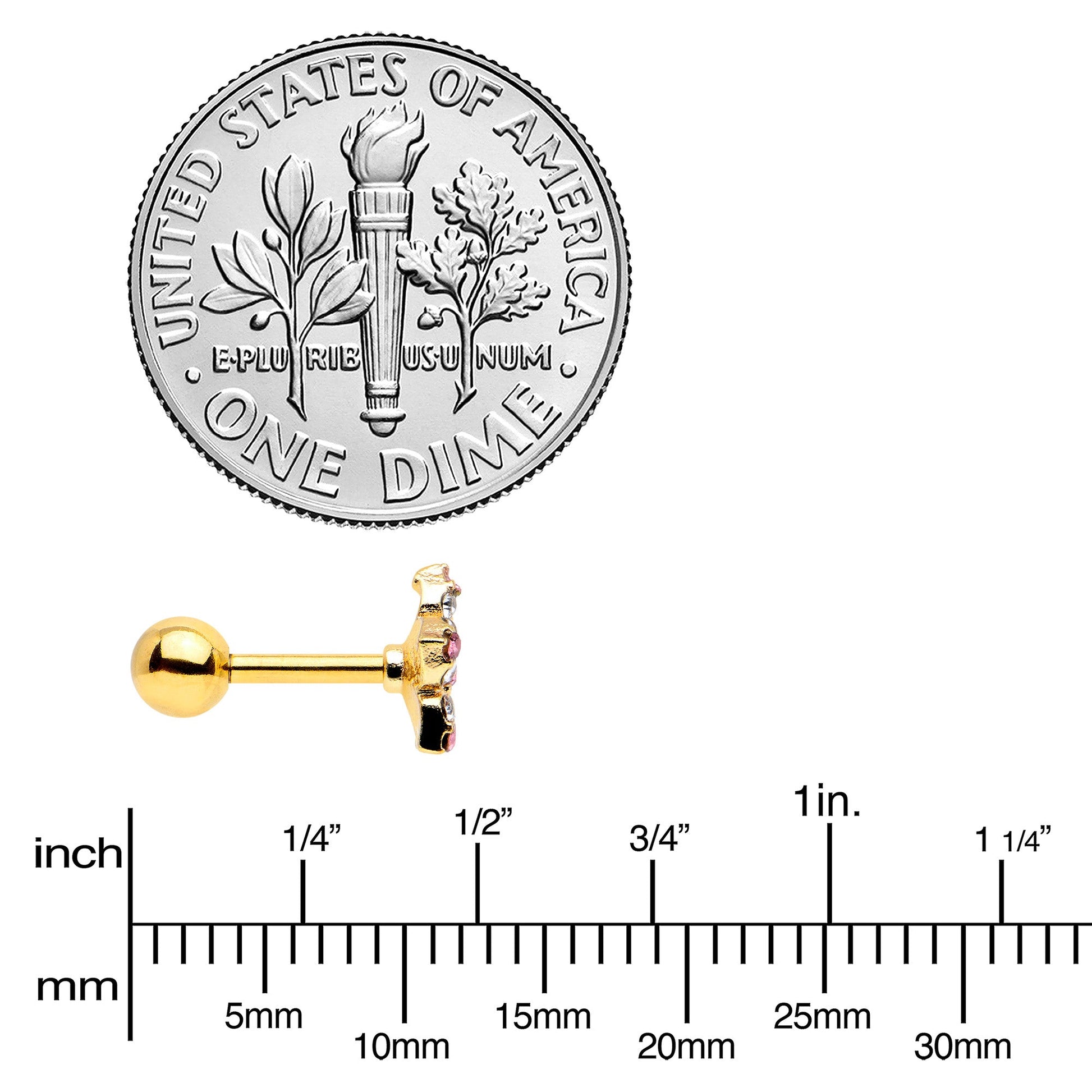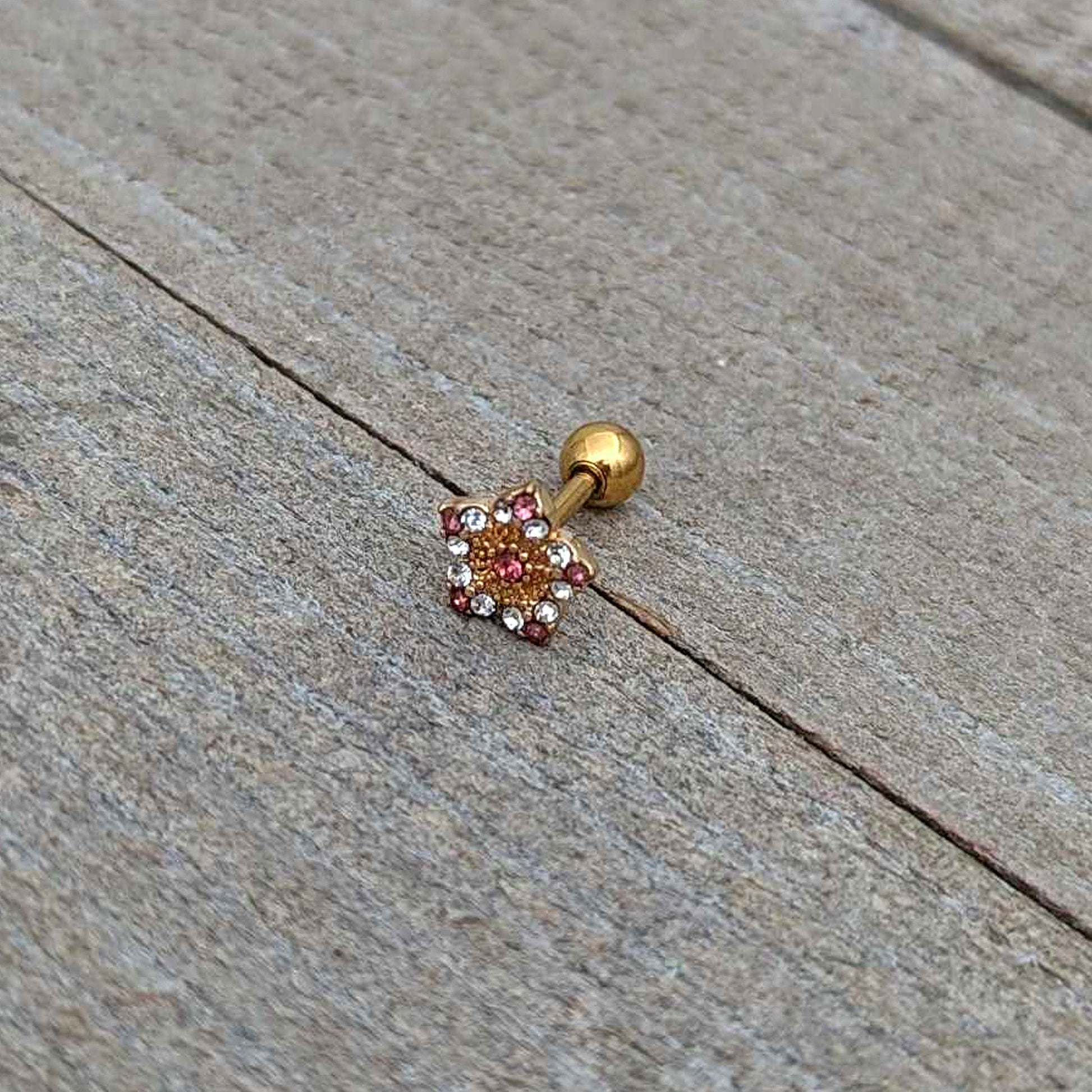 Be a star in the universe like the star on this 16 gauge tragus stud! It's made with a 6mm gold tone PVD over 316L surgical grade stainless steel straight barbell with a 4mm ball end. It features a five-pointed star charm. The star features clear and pink gems set within, as well as textured detailing. You can even sport this star in multiple piercings including tragus, helix, and some conch piercings. Let your cartilage piercings be stars with this splendid star cartilage jewelry!Specifications