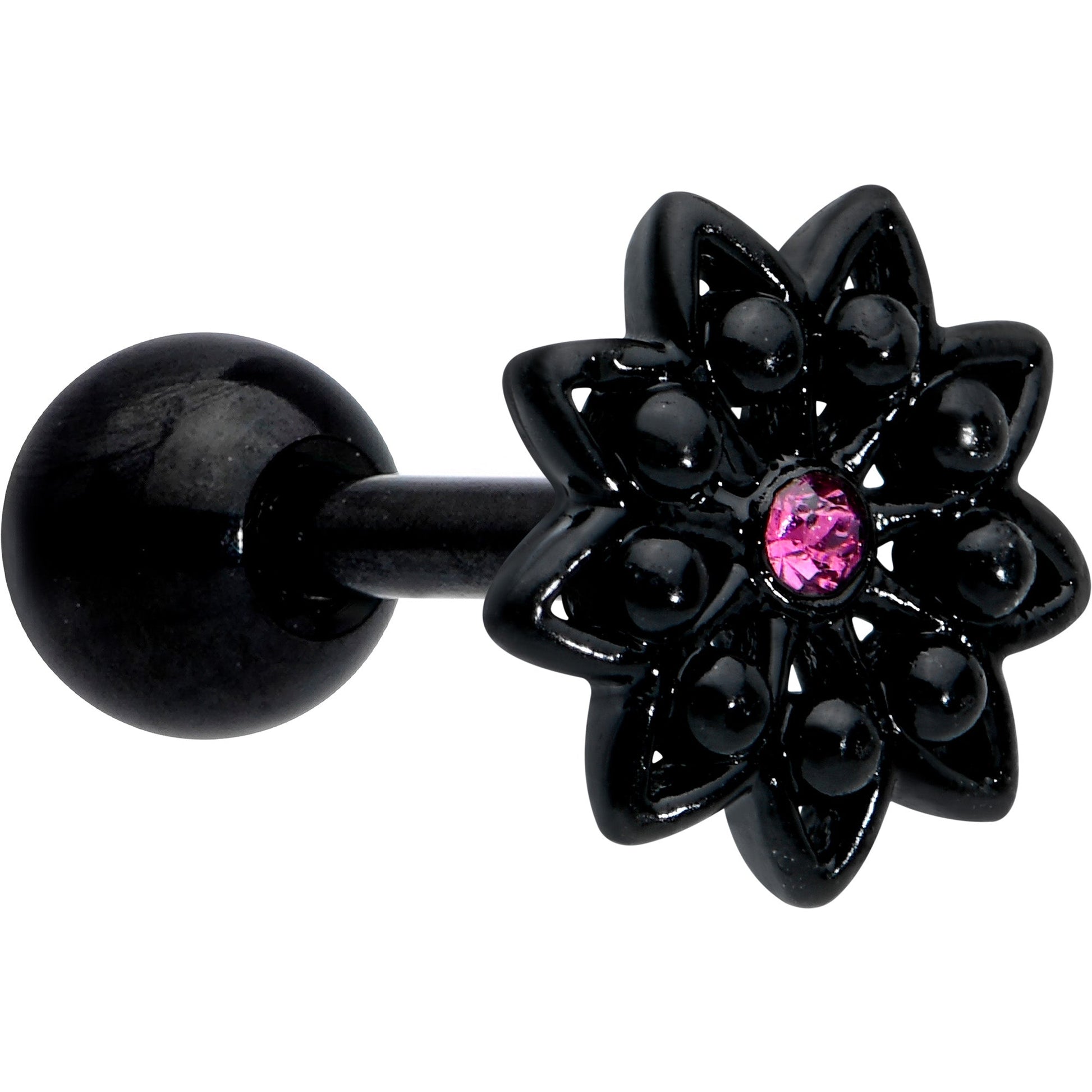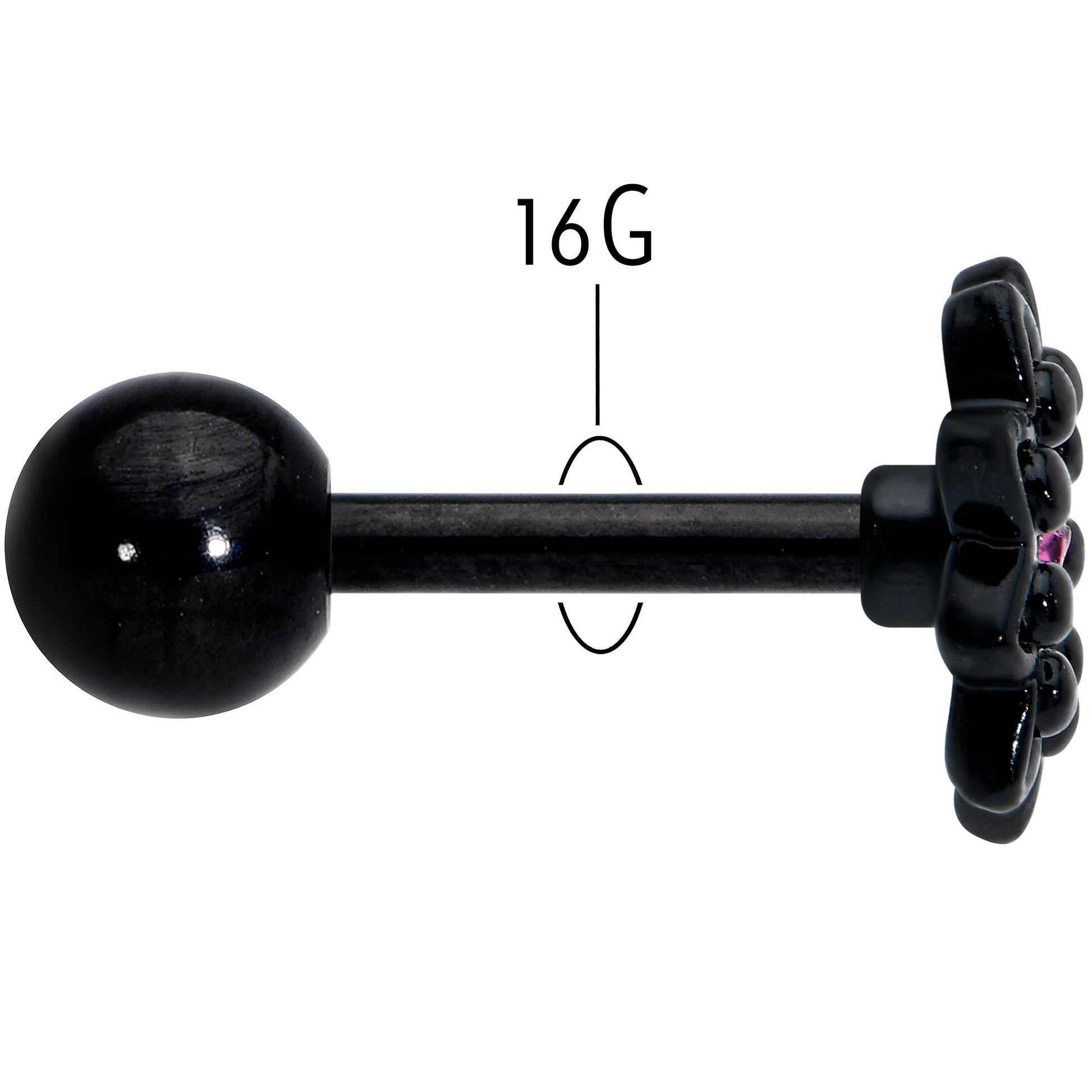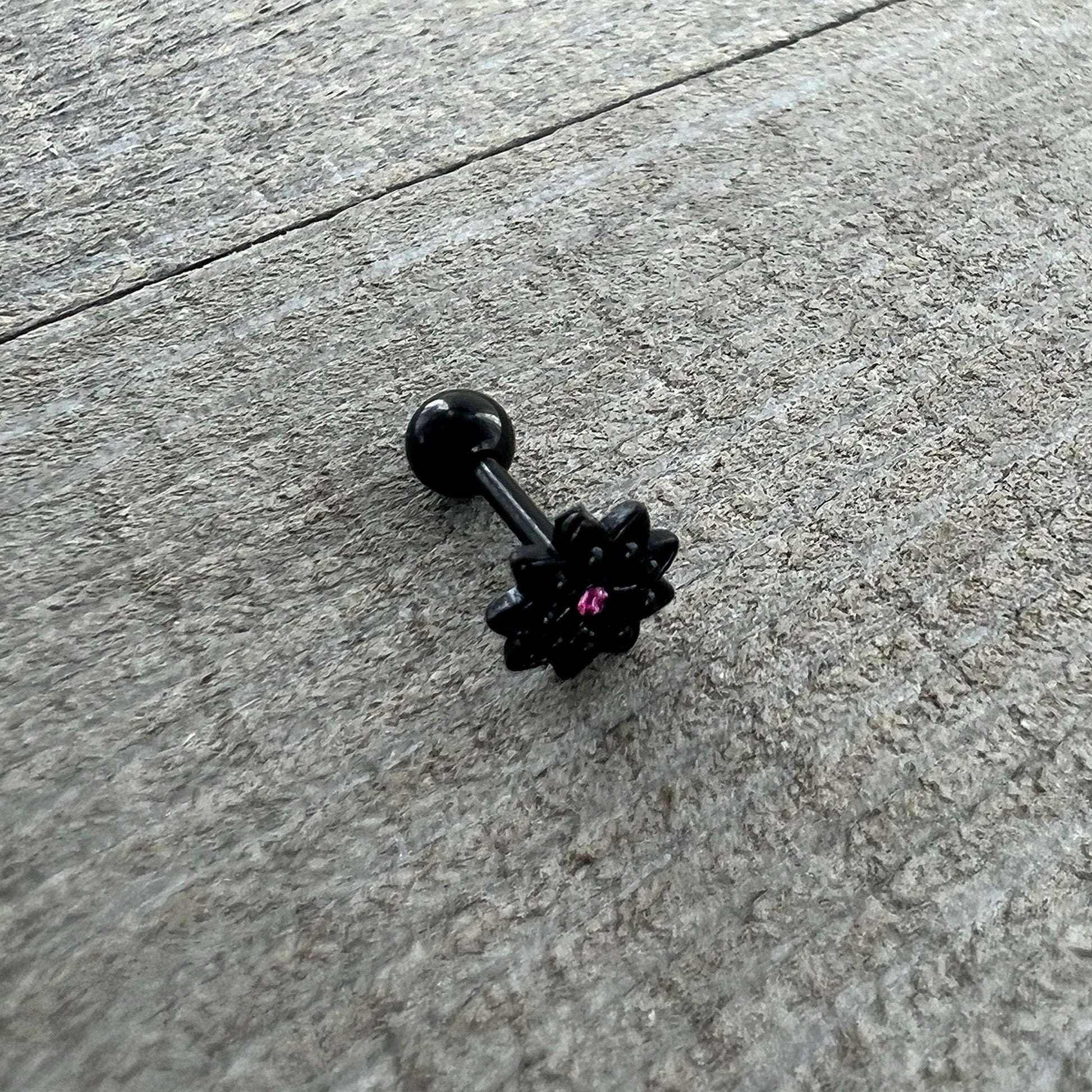 16G 1/4 Pink Gem Black Midnight Flower Cartilage Tragus Earring