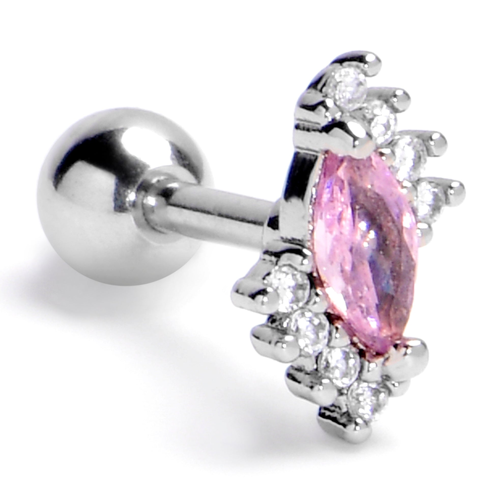 Give your look some fire with this 16 gauge tragus stud. It is made with a 6mm durable 316L surgical grade stainless steel straight barbell with a 4mm ball end. It features a drop shaped pink gem. It is embellished with clear gems on each side for a look that is reminiscent of flames and you can rock it in multiple piercings including tragus, helix, and some conch piercings. Get a look that is smoking hot with this elegant drop cartilage piercing ring.Specifications