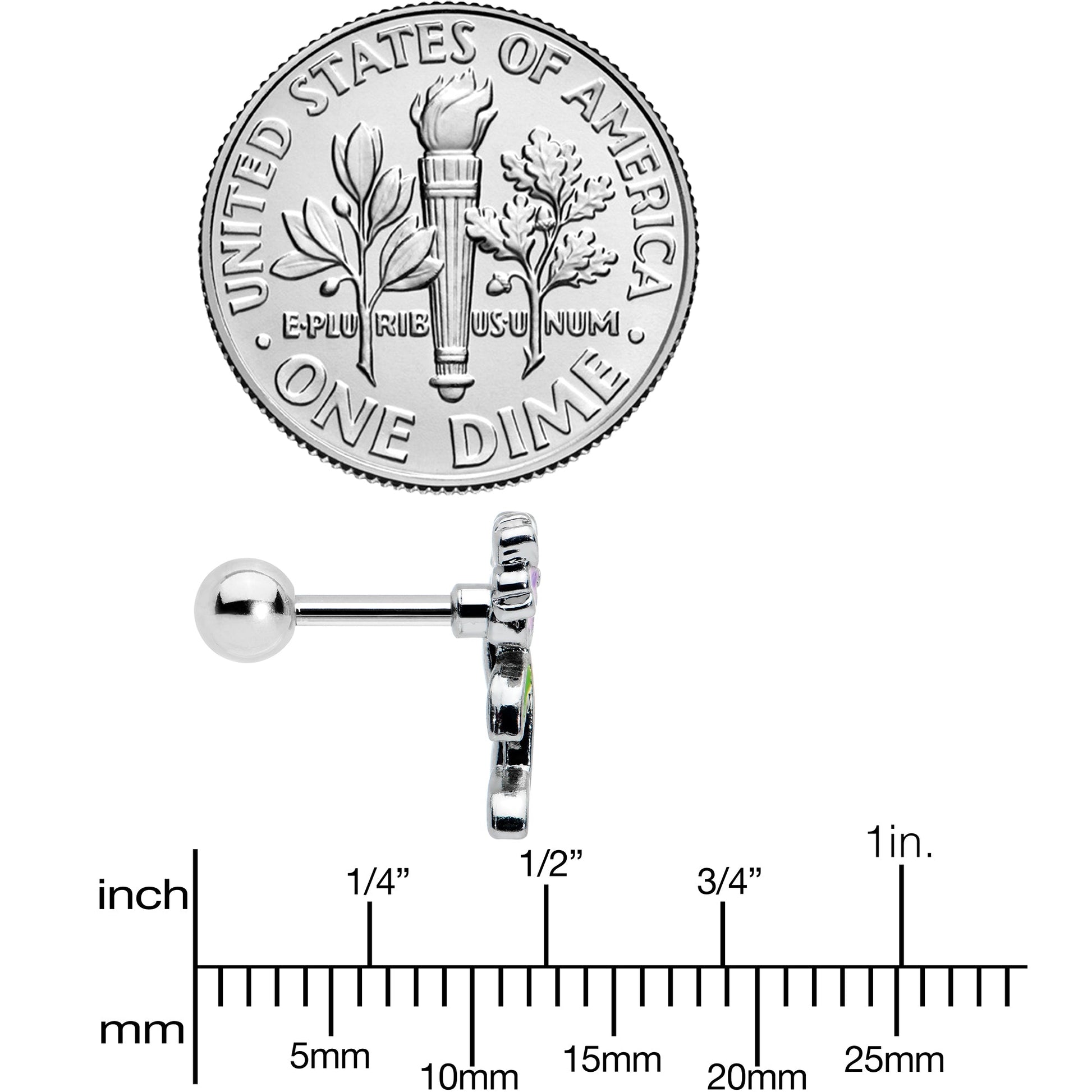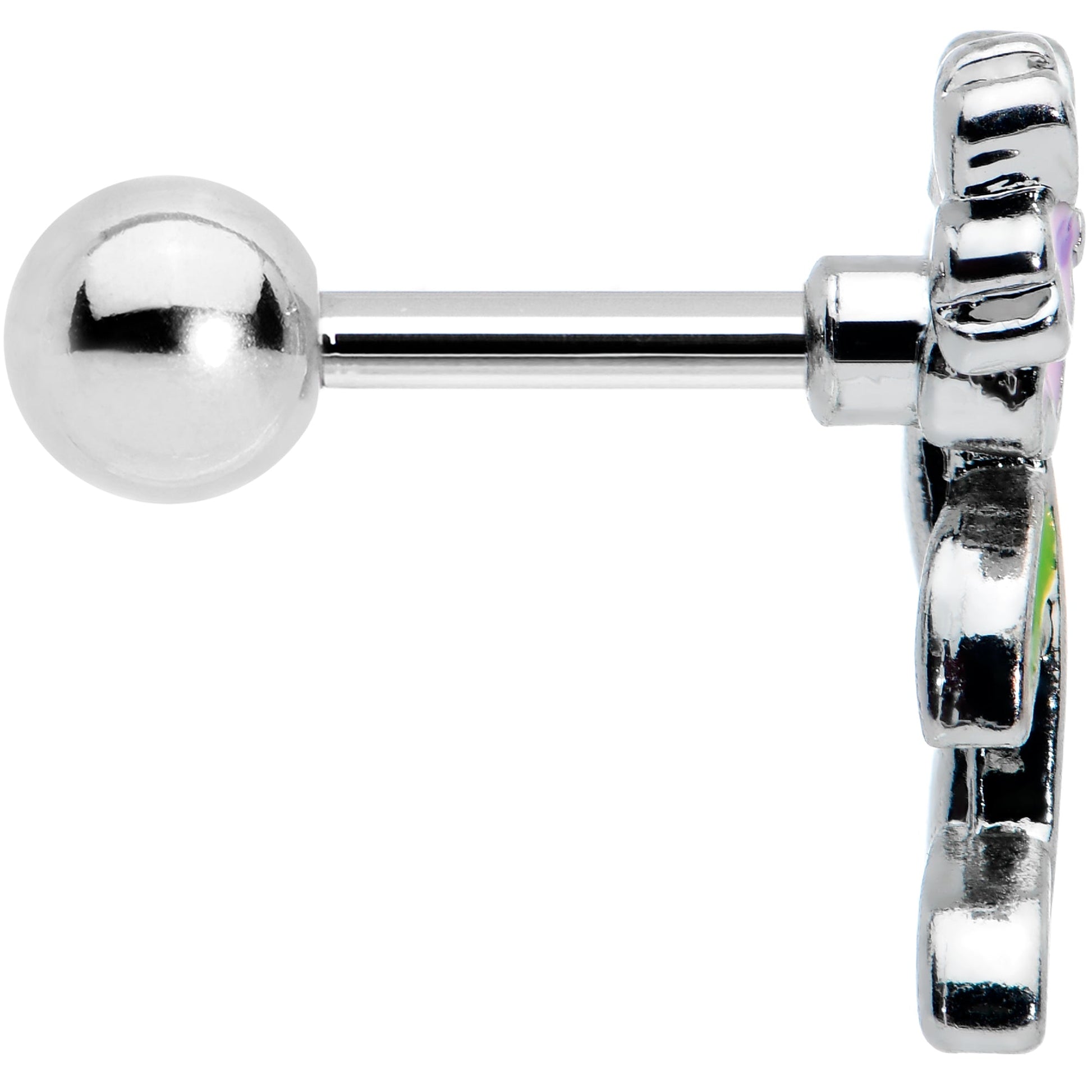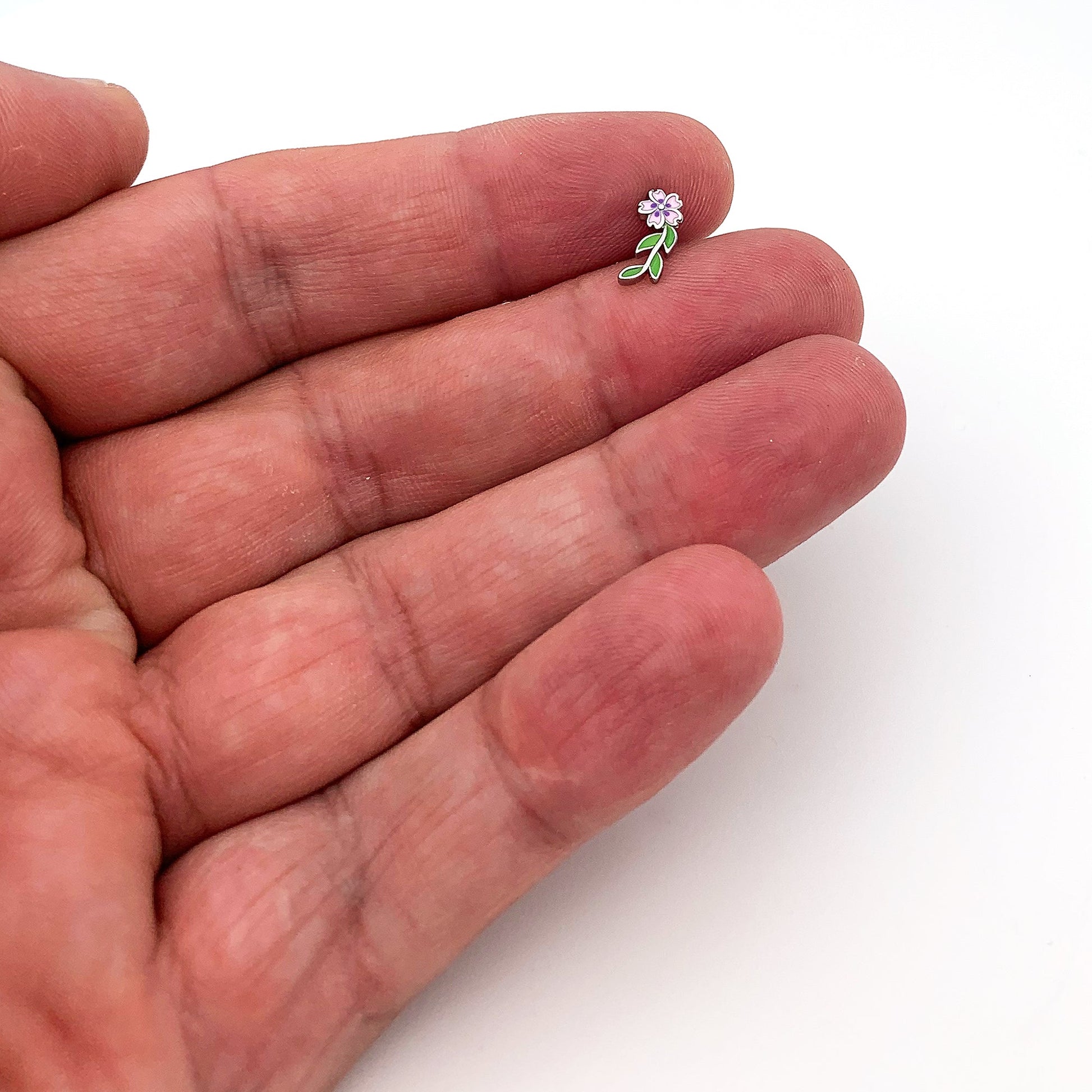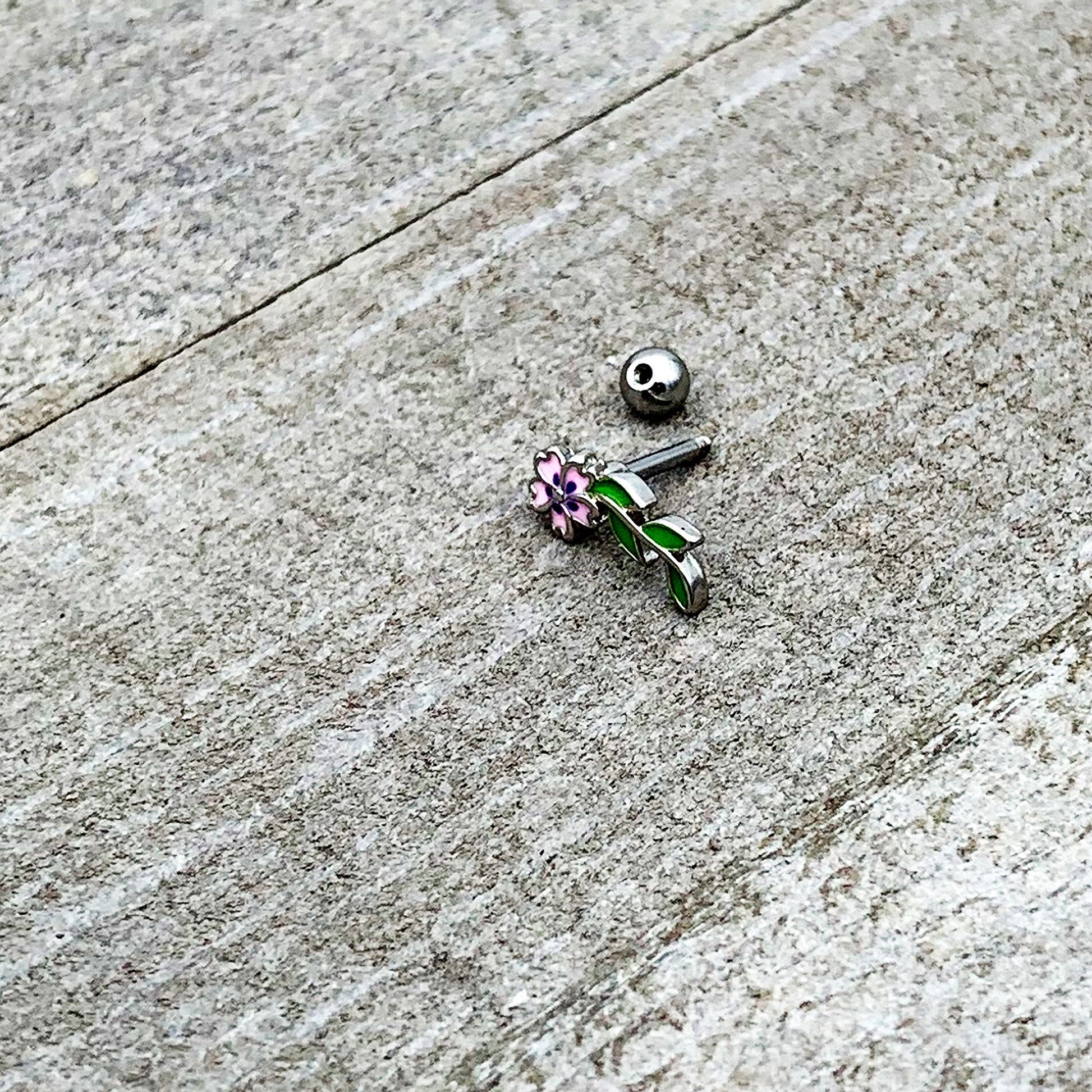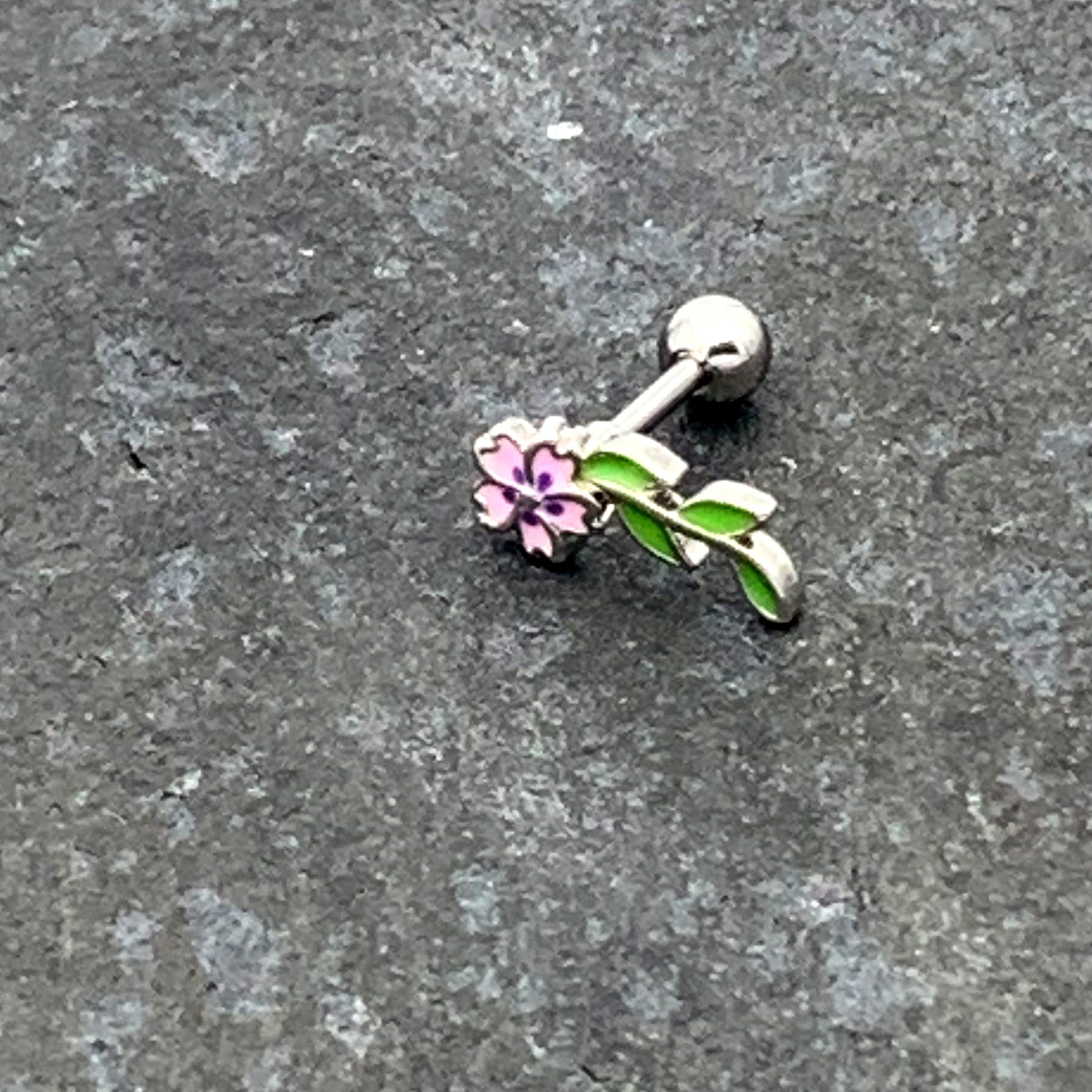 This 16 gauge tragus stud is long on style and color! It's made with a 6mm durable 316L surgical grade stainless steel straight barbell with a 4mm ball end. It features a flower charm, with pink inlaid petals that embellished with purple detailing. The flower also features a long stem, with green inlaid leaves for a striking color contrast. You can even flaunt this flower in multiple piercings including tragus, helix, and some conch piercings. This colorful flower is ready to bloom in your piercings with this colorful, floral cartilage stud!Specifications