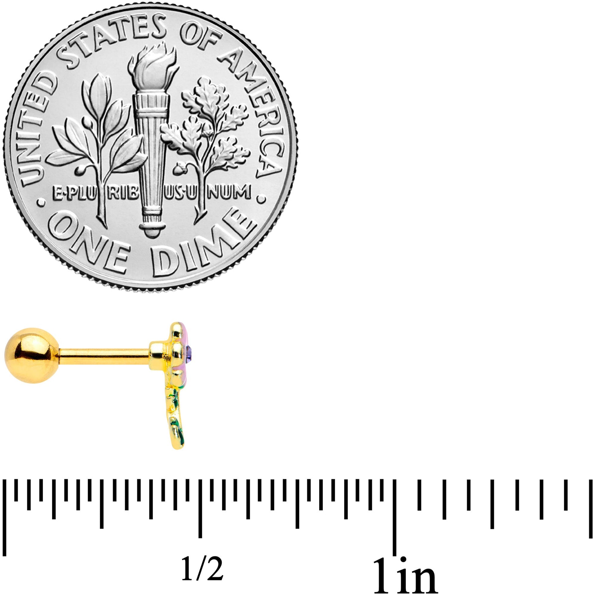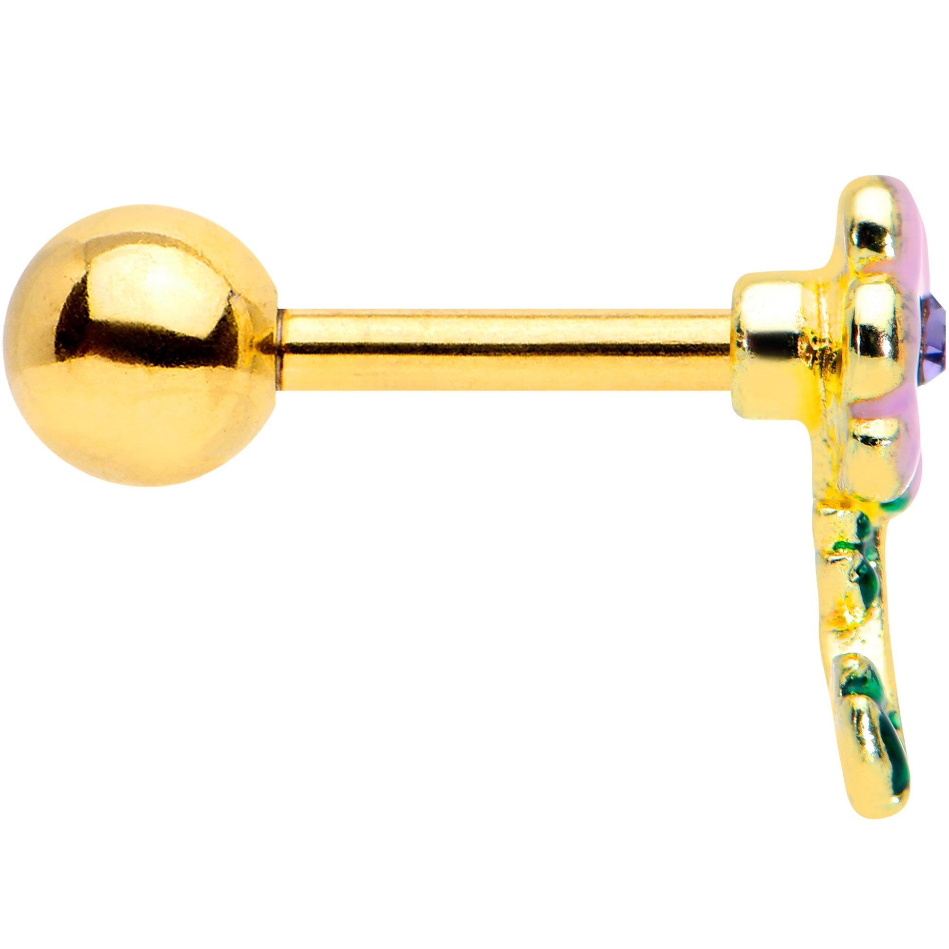 The flower on this 16 gauge cartilage stud has burst into beautiful bloom! It's made with a 6mm gold tone PVD over 316L surgical grade stainless steel straight straight barbell with a 4mm ball end. It features a large pink flower charm with a purple gem set at its center. Beneath it is a spray of leaves, inlaid in green for a cohesive and realistic look. You can even flaunt this flower in multiple piercings including tragus, helix, and some conch piercings. Give your cartilage piercings a touch of floral fantasy with this blooming beautiful tragus stud.Specifications