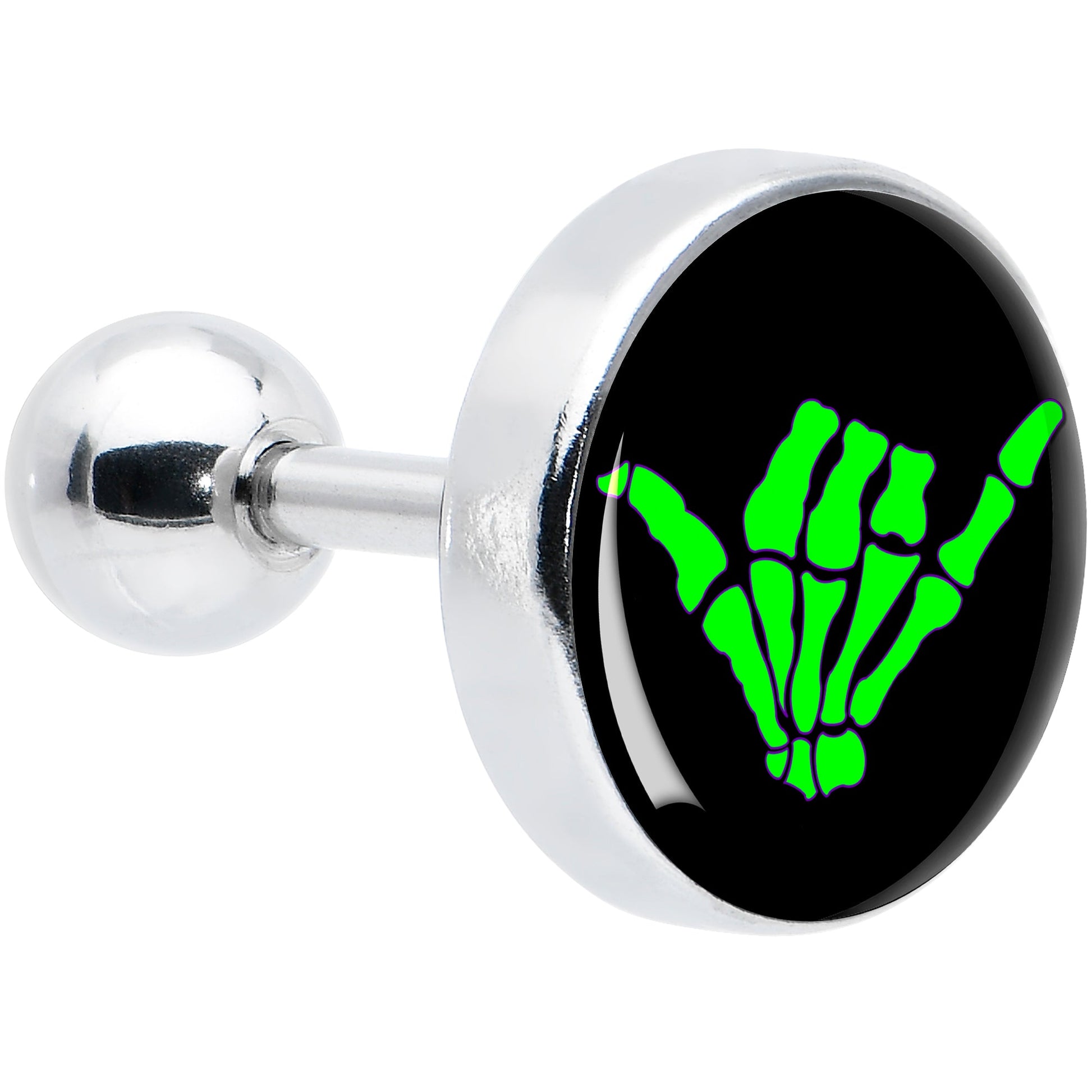 Hang ten whether you are alive or dead with this skeleton themed 16 gauge tragus stud. It is made with a 6mm durable 316L surgical grade stainless steel straight barbell with a 4mm ball end. It features a black disc with a skeleton hand on it. The skeleton hand is bright green and appears to be making the sign known to surfers around the world and you can rock it in multiple piercings including tragus, helix, and some conch piercings. The surf is up so get your bones into the water with this cartilage piercing jewelry.