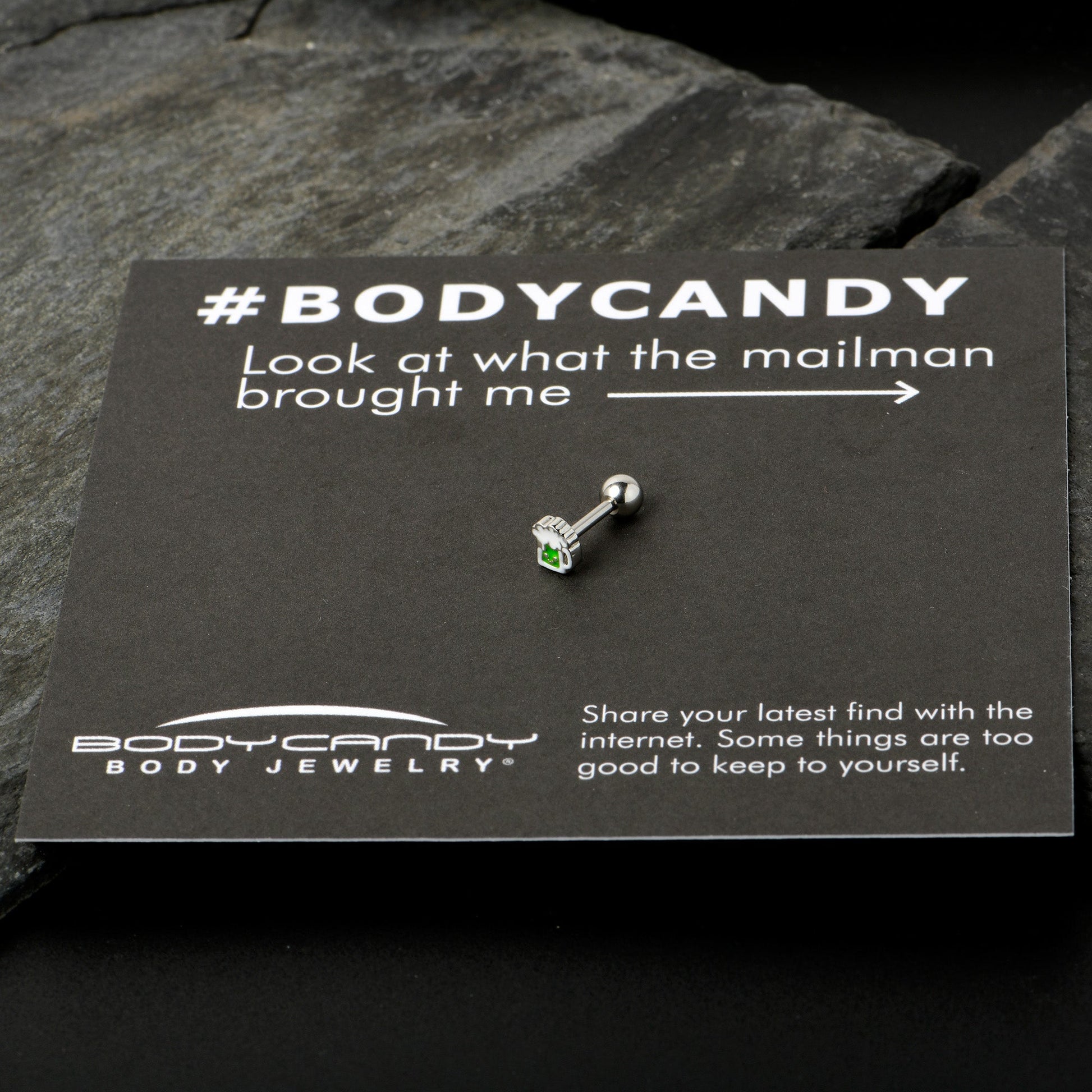 This St Patrick's Day, belly up to the bar with this 16 gauge tragus stud! It's made with a 6mm durable 316L surgical grade stainless steel straight barbell with a 4mm ball end. It features a green beer charm with white detailing and a happy, smiling expression. You can even rock it in multiple piercings including tragus, helix, and some conch piercings, If you're looking for a bit of green to wear this St. Patrick's Day, have no fear - we've got some beer for your piercings with this festive cartilage piercing jewelry!Specifications