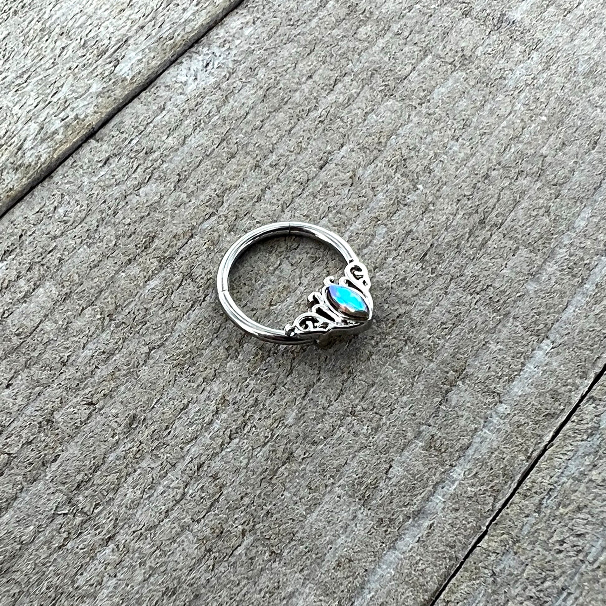 Ride a wave of style with this 16 gauge septum ring! It's made with a 10mm durable 316L surgical grade stainless steel hinged circular ring. It features an Art Deco charm of waves and scrolls. Set at the center is an oval shaped aurora gem that adds a classic touch of color and glamour to a timeless look. It also features a non-removable, hinged segment that makes insertion and removal a breeze and you can rock it in multiple piercings including tragus, helix, and some daith piercings. You'll be waving hello to a whole new look with this sleek and timeless cartilage piercing ring.Specifications