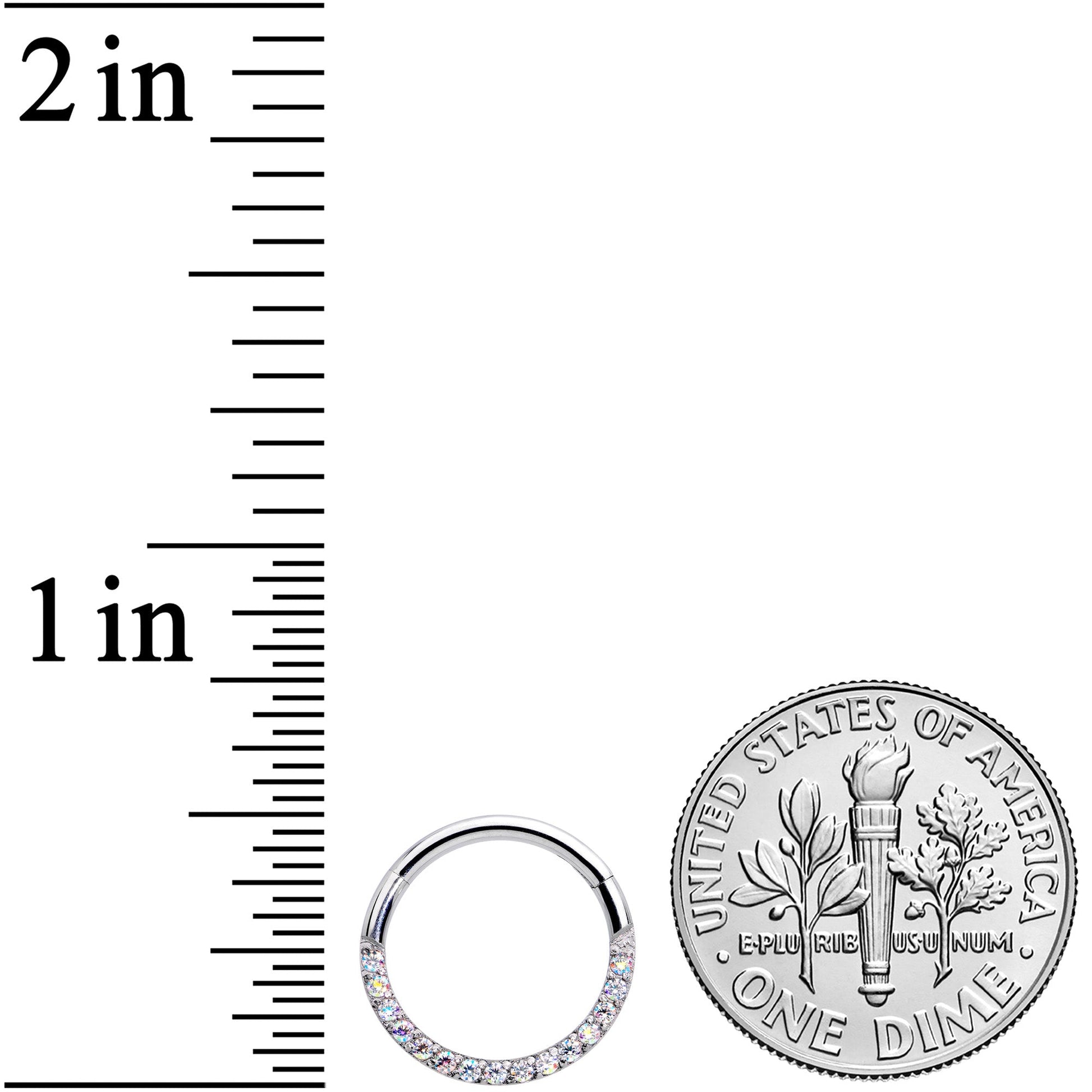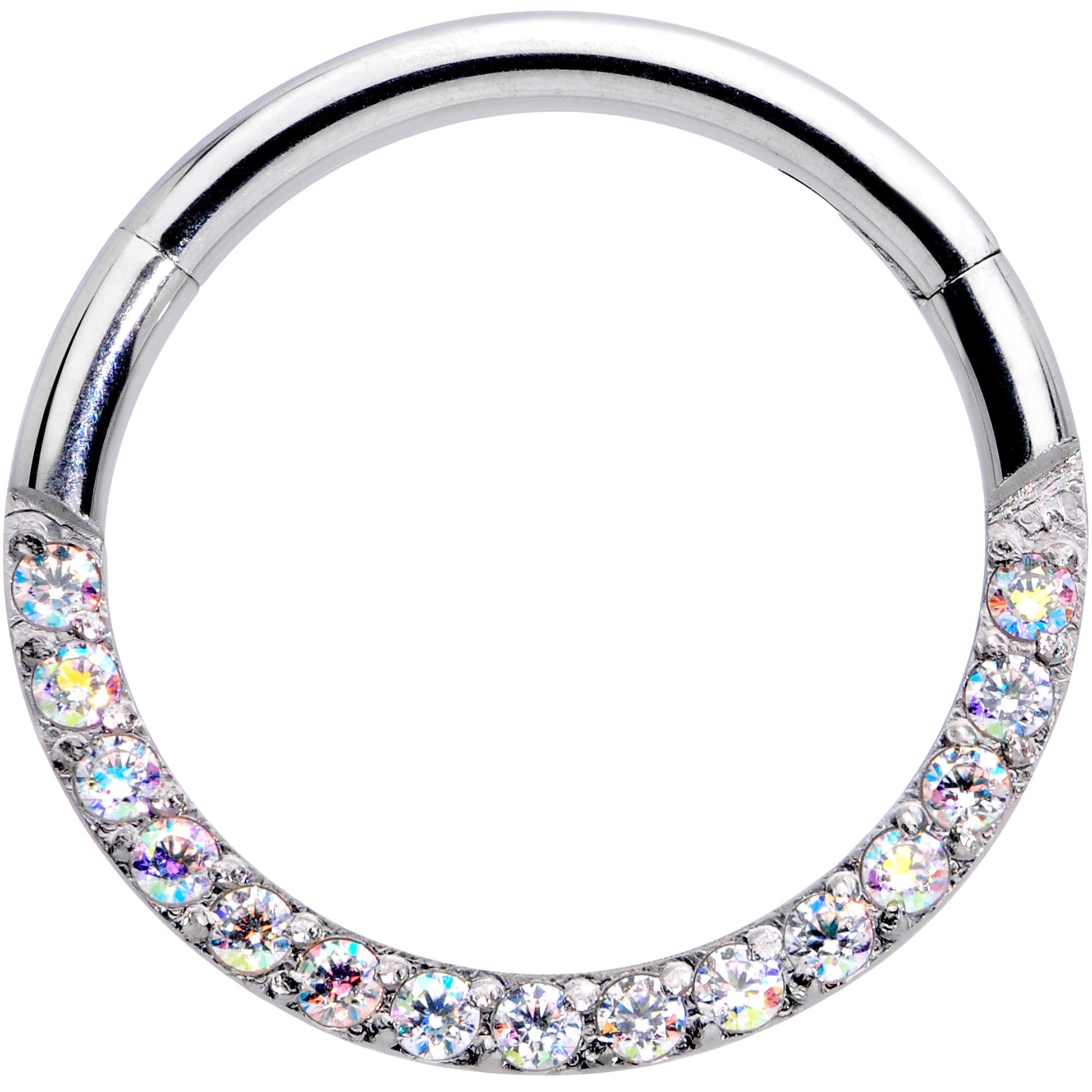 Add a look of sophistication to your ear piercings with this 16 gauge cartilage jewelry! It's made with a 10mm durable 316L surgical grade stainless steel hinged circular ring. The bottom arc of this cartilage earring is paved with aurora color gems for a look that's totally attention-getting without being over-the-top. It also features a non-removable, hinged segment that makes insertion and removal a snap. It works well in multiple piercings including cartilage piercings like your helix, rook, and tragus as well as your septum piercing. So why be subtle when you can be ultra-glam with this fabulously extravagant cartilage ring?Specifications