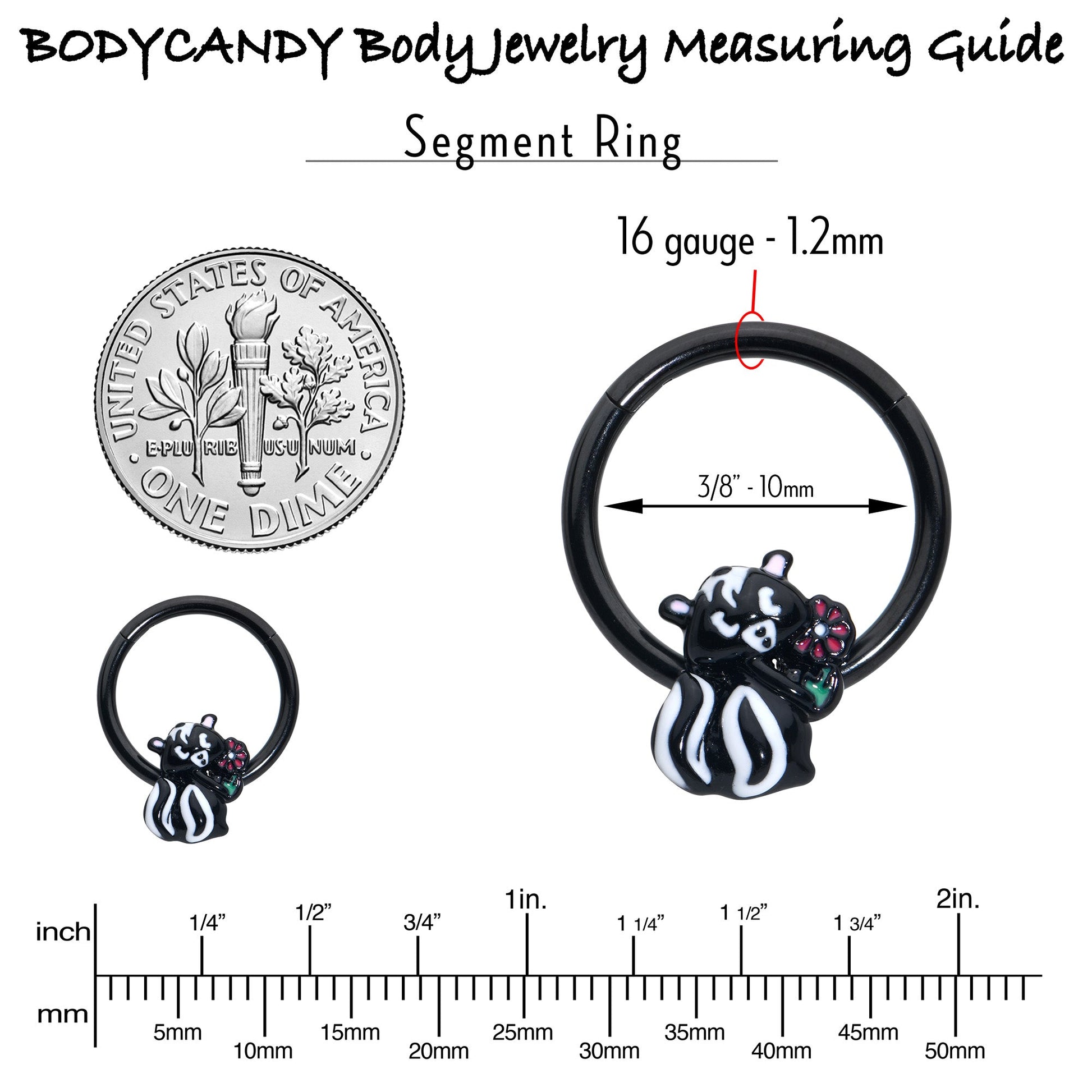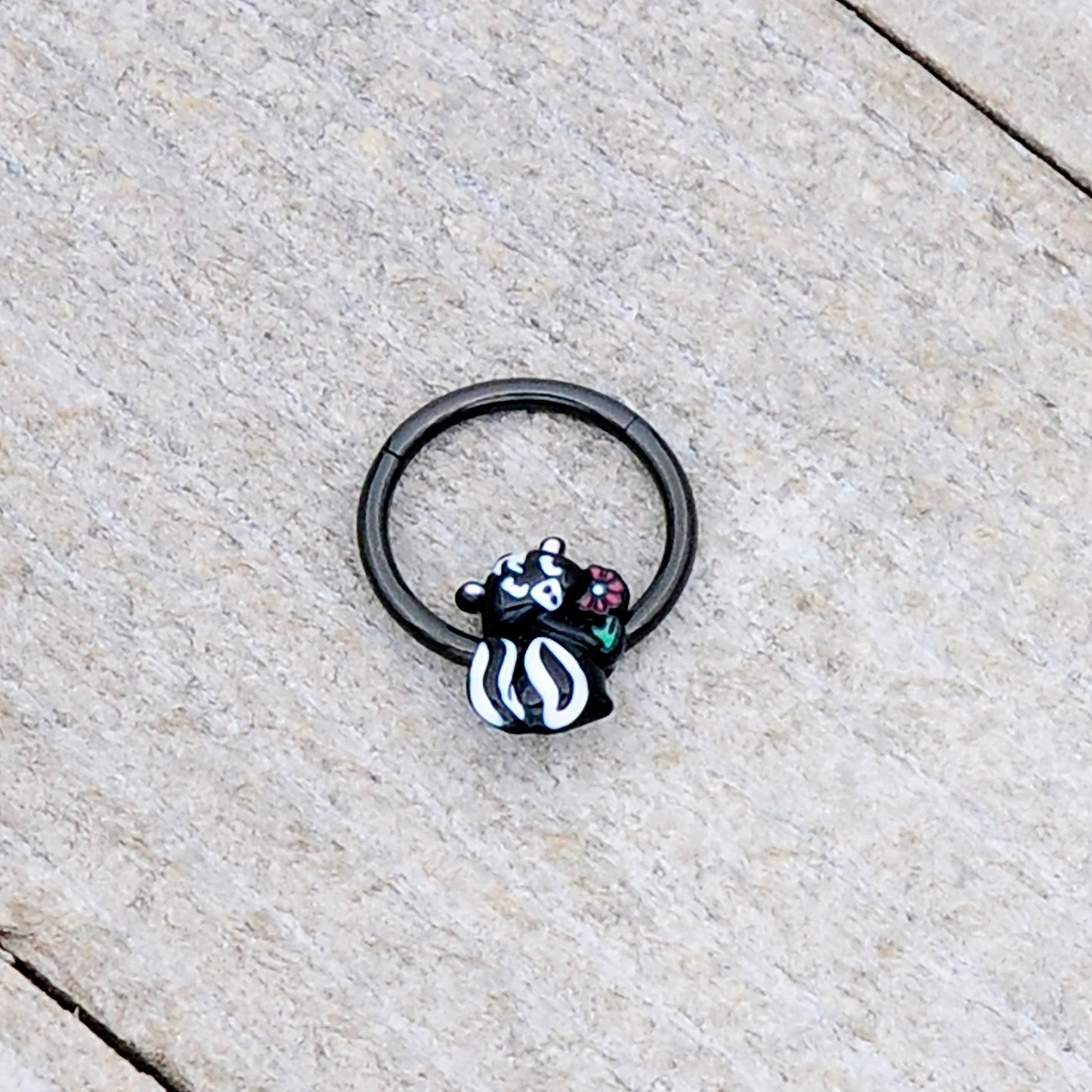 Get funky with the skunky on this 16 gauge septum ring. It is made with a 10mm black PVD over 316L surgical grade stainless steel hinged circular ring. It features an adorable skunk charm. The skunk features black and white inlay and is clutching a red inlaid flower for an extra sweet appearance. It also features a non-removable, hinged segment that makes insertion and removal a breeze and you can even rock it in multiple piercings including tragus, helix, and some conch piercings. You will fall in love with the little stinker on this sweetheart skunk cartilage piercing ring.Specifications