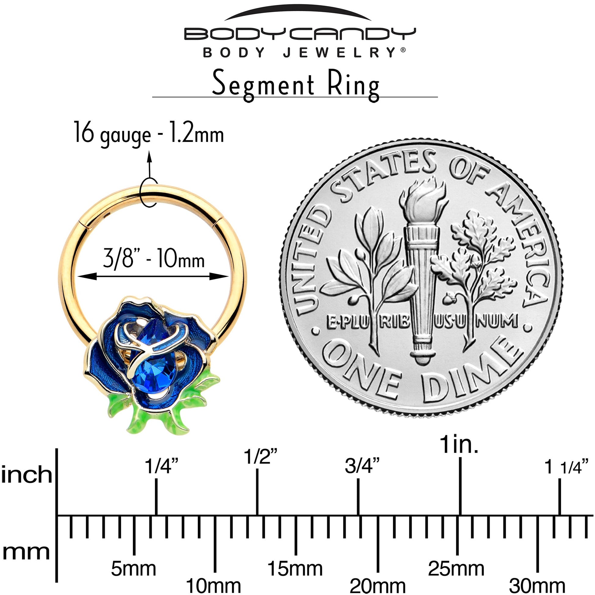 Dive into the depths of style with this 16 gauge septum ring. It's made with a 10mm gold tone PVD over 316L surgical grade stainless steel hinged circular ring. It features a flower charm, inlaid in the deepest of blues. It is further embellished with a matching deep blue gem center and green leafy detailing at the bottom. It also features a non-removable, hinged segment that makes insertion and removal a breeze and you can rock it in multiple piercings including tragus, helix, and some daith piercings. Get the blues in the best way possible with this fabulous, flower cartilage piercing jewelry.Specifications