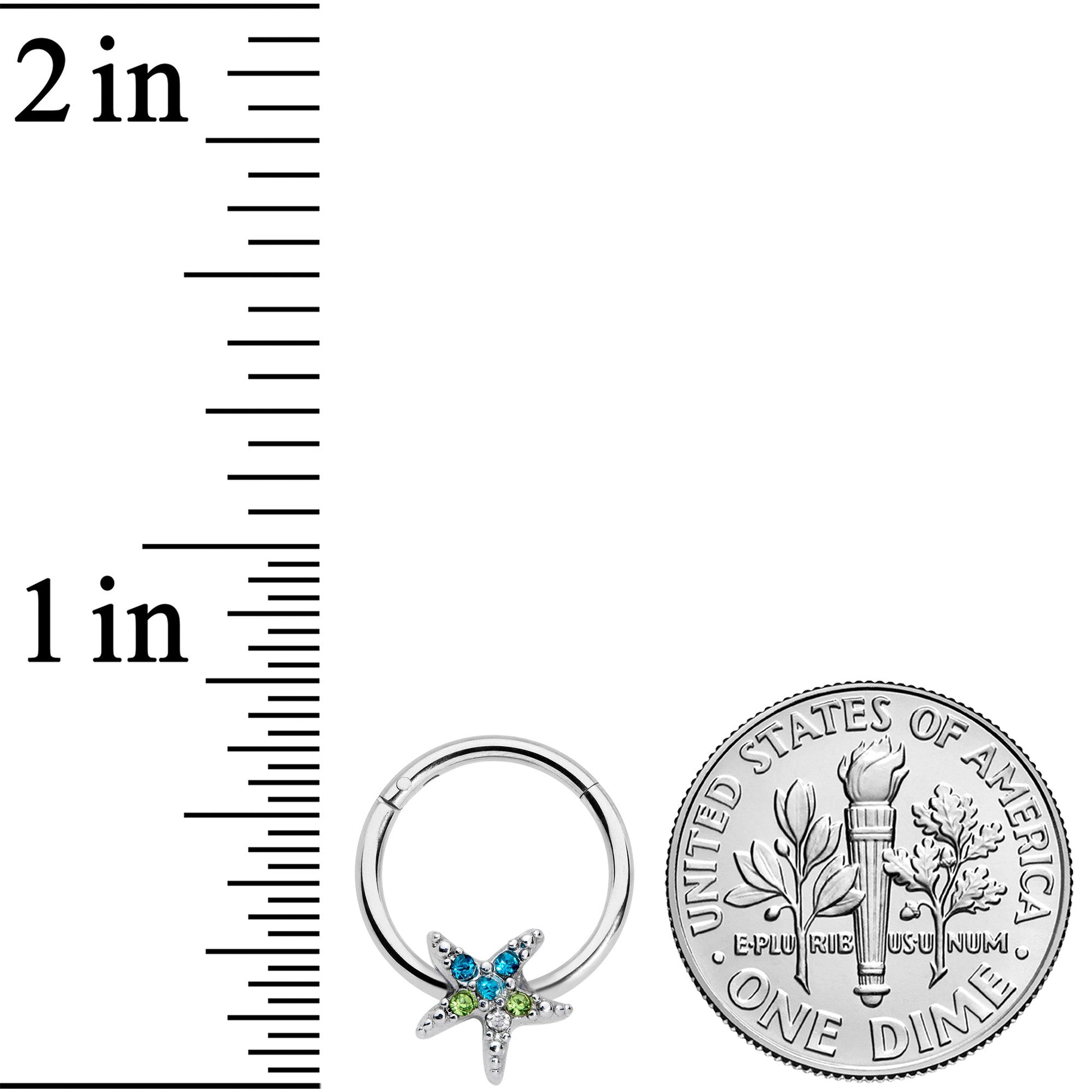 The ocean's gone opulent on this 16 gauge cartilage jewelry! It's made with a 10mm durable 316L surgical grade stainless hinged circular ring. It features a starfish charm paved with gems in blue, bright green, and clear. It's as hot as any summer's day at the beach and twice as sexy. It also features a non-removable, hinged segment that makes insertion and removal a snap and you can sport this starfish in multiple piercings including helix, tragus, and septum.Let this seductive starfish add its stylish colors to your cartilage piercing!Specifications