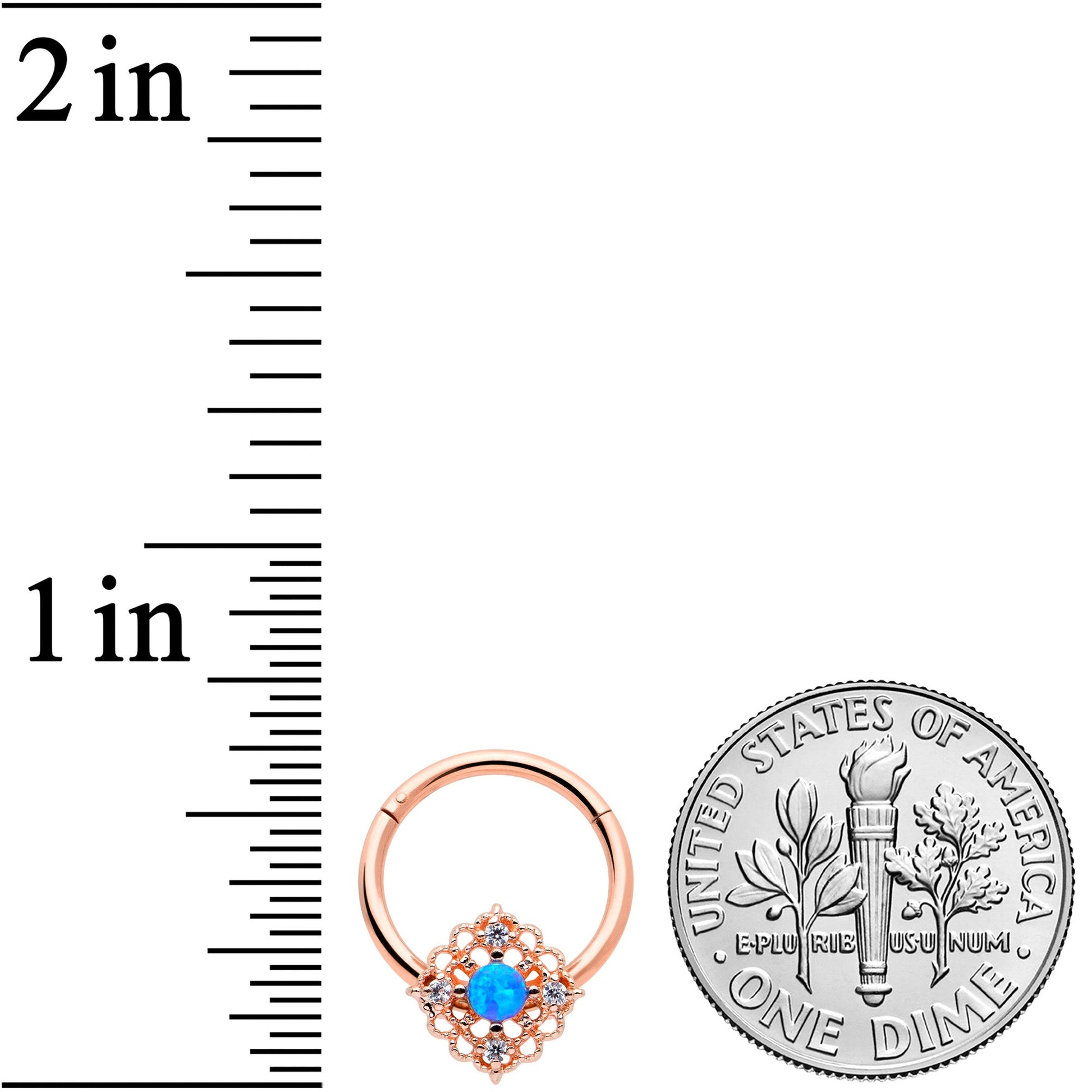 Fall in love with the look of lace on this 16 gauge septum ring! It's made with a 10mm rose gold tone PVD over 316L surgical grade stainless steel hinged circular ring. It features a lace-inspired charm of curving lines, set at the center with a blue synthetic opal. It's further embellished with clear cubic zirconia gems for an added touch of glamour. It also features a non-removable, hinged segment that makes insertion and removal a snap and can be worn in multiple piercings such as septum, tragus, and helix. You're going to love the luscious lacy look of this elegant cartilage piercing ring!Specifications