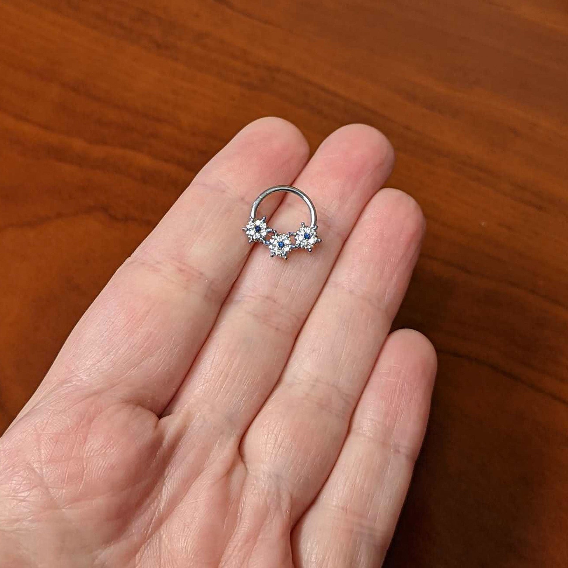 The snowflakes on this 16 gauge septum ring are ones that you'll never let melt away from you whether it's Christmas or not! It's made with a 10mm durable 316L surgical grade stainless steel hinged circular ring. It features a trio of intricate snowflake charms set with clear gems as well as deep blue gems at their centers for a luscious touch of color you'll totally fall for! It also features anon-removable, hinged segment that makes insertion and removal a breeze and you can even rock it in multiple piercings including tragus, helix, and some daith piercings! This winter, let the snow spruce up your cartilage piercings with this sweet and sumptuous tragus piercing ring!Specifications