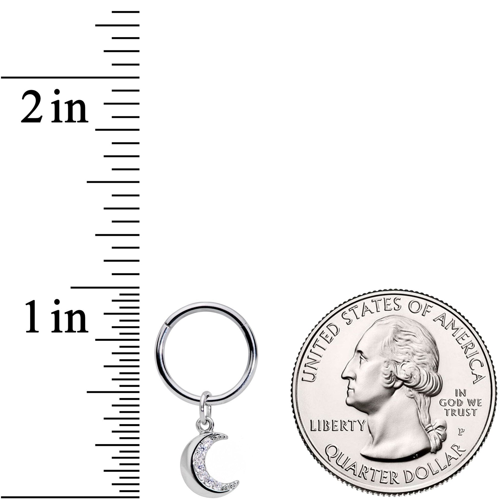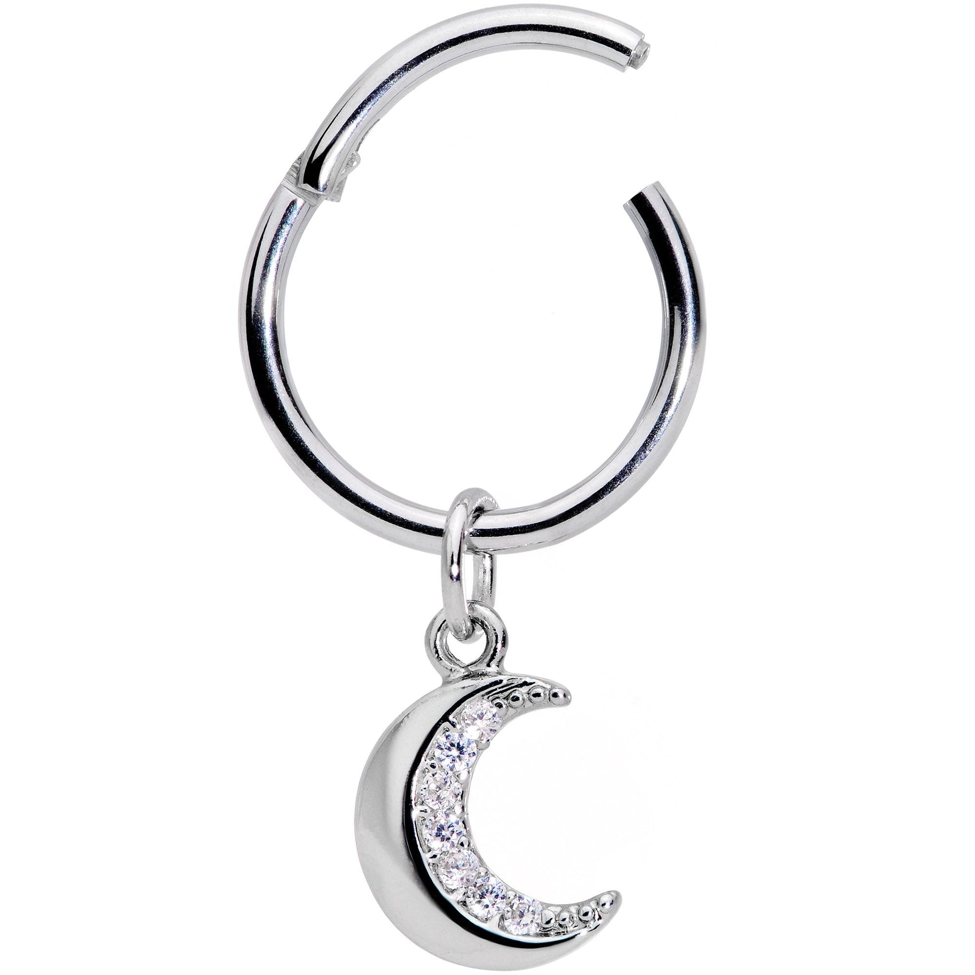Are you kind of a night owl? Do you shrink away from the sun and make merry by moonlight? Tell the world with this 16 gauge cartilage ring! It's made with a 10mm durable 316L surgical grade stainless steel hinged circular ring. It features a dangling crescent moon, with a clean and uncluttered design. It's embellished only with a row of clear cubic zirconia gems along its inner edge, keeping "simple" from becoming "plain"....or, even worse, "boring". This has just enough glamour to make it stand out without taking it over the top. It also features a non-removable hinged segment that makes it super easy to insert and remove. And you're going to love that because it works so well in so many piercings, including tragus, helix, and septum. Pop this segment ring in your piercing and you'll be ready to go howl at the moon!Specifications