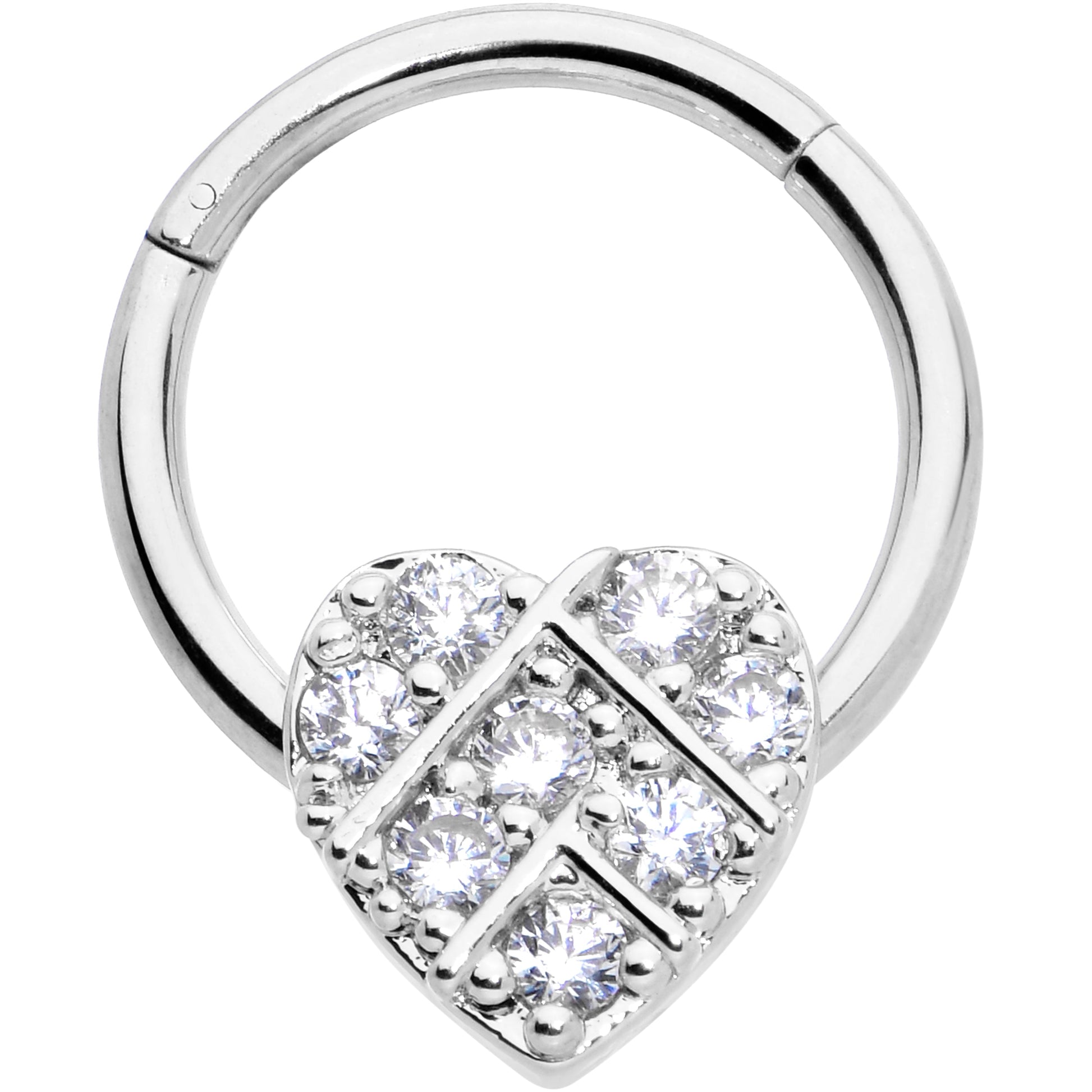 Get a luxe look of love with lattice this Valentine's Day with this 16 gauge septum ring. It's made with a 10mm durable 316L surgical grade stainless steel hinged circular ring. It features a heart charm, with latticework detailing. Set in between each of the lines are clear gems for an added touch of style that really takes this look over the top. It also features a non-removable, hinged segment that makes insertion and removal a breeze and you can rock it in multiple piercings including tragus, helix, and some daith piercings. Fall in love with style when you're rocking this heart themed cartilage piercing jewelry.Specifications