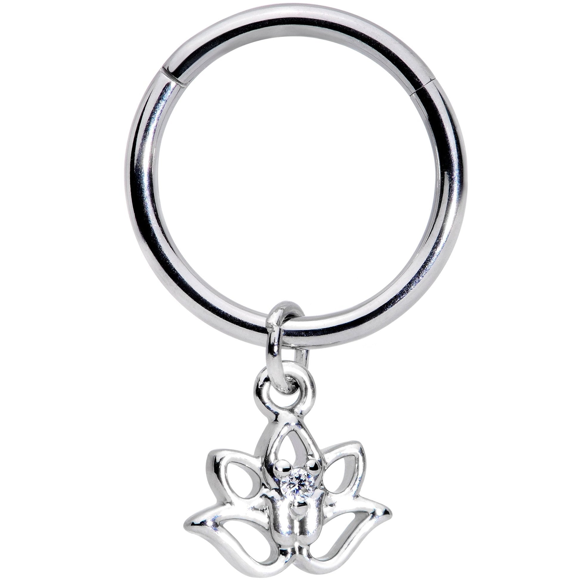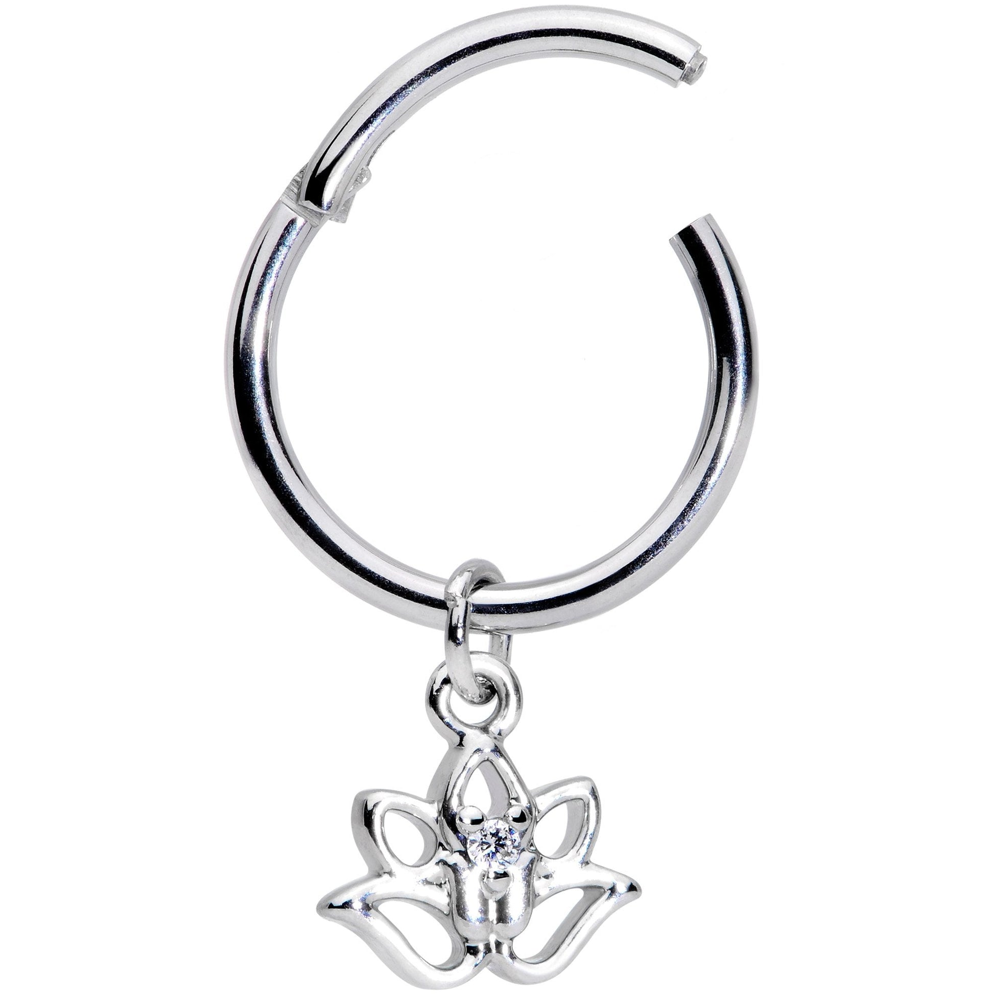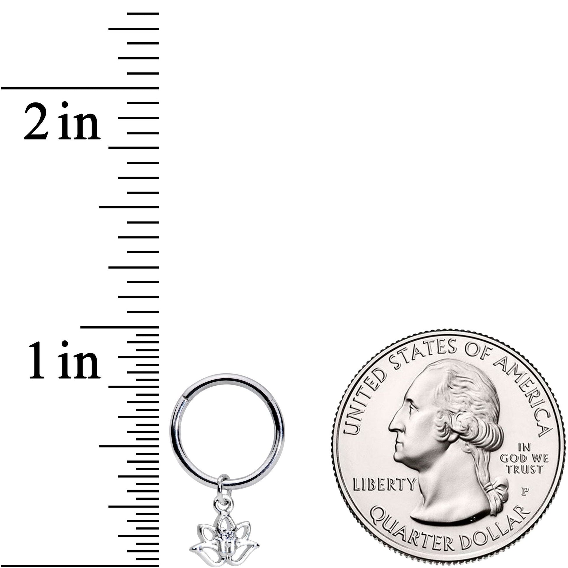 The lotus flower that hangs from this 16 gauge cartilage ring will serve as a daily reminder of wisdom and inner peace. Made with a 10mm durable 316L surgical grade stainless steel hinged circular ring, it features a clear cubic zirconia gem at the center of the openwork lotus. It's reminiscent of the clarity that we find when we remain open-minded and the treasure that is hidden inside us all. This ring features a hinged non-removable segment that makes it super easy to insert and remove. You'll love this because these work beautifully in multiple piercings including daith, tragus, and helix. A truly wise choice.Specifications