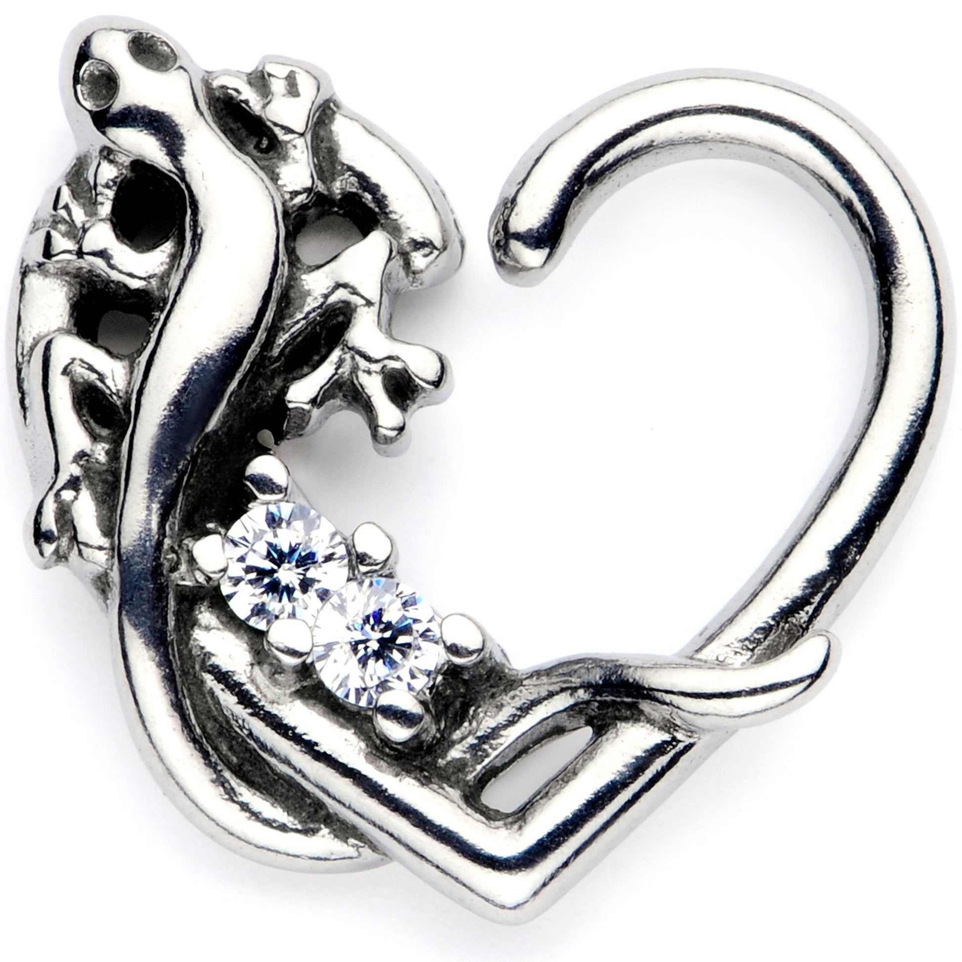 Grab yourself some love for your ear piercing with this 16 gauge heart closure earring. The 10mm diameter heart-shaped ring is made from 316L surgical grade stainless steel for a durable piece to add to your body jewelry collection. Designed to be worn in the right ear, this cartilage jewelry features a lovely lizard crawling over a bed of clear cubic zirconia gems along one side. All you have to do is twist the ends slightly and gently pull away to insert into your piercing, and this cartilage earring is perfect for wearing in a variety of ear piercings including the helix, tragus, and daith!Specifications