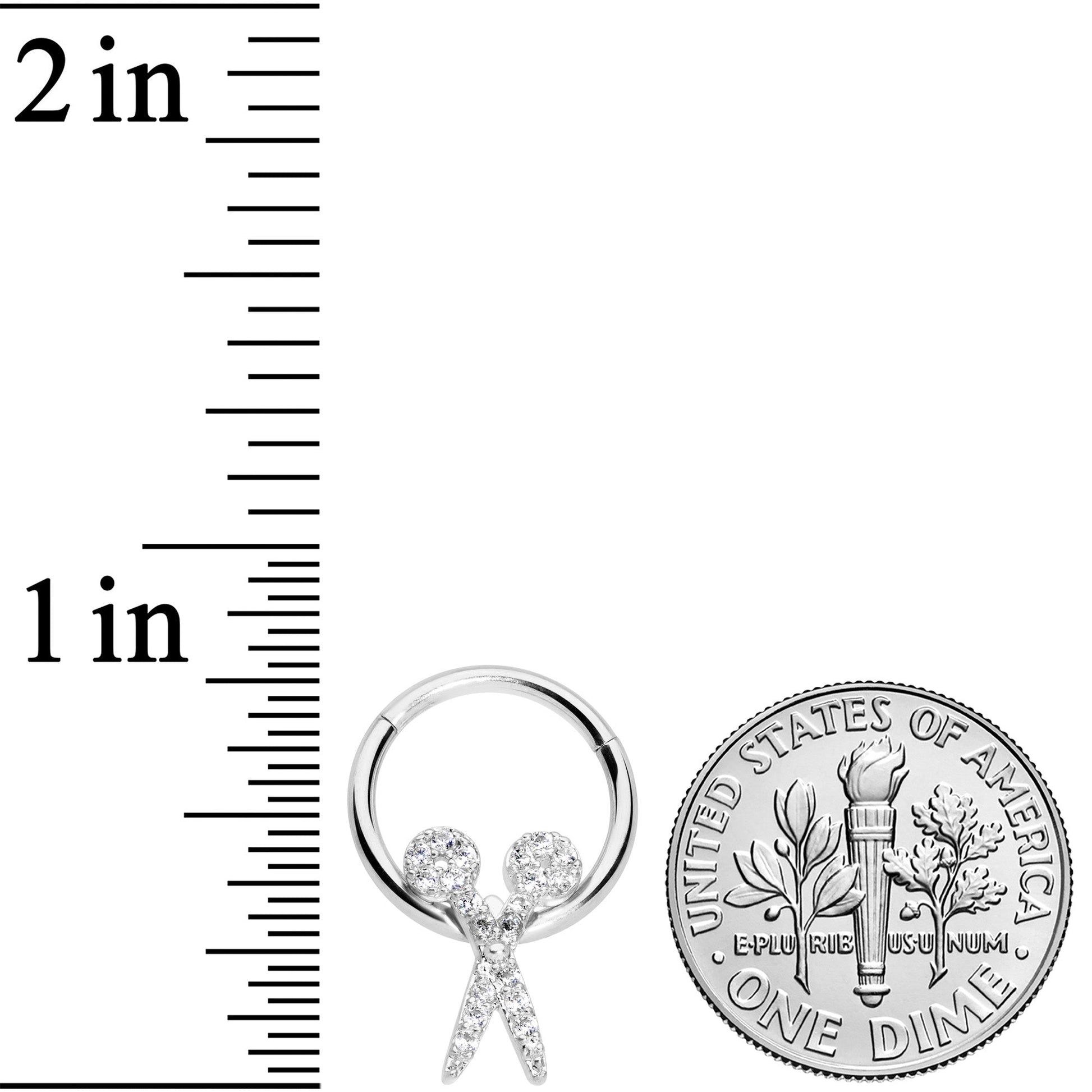 Whether you call them scissors or shears, you'll be calling them gorgeous on this 16 gauge cartilage jewelry! It's made with a 10mm durable 316L surgical grade stainless steel hinged circular ring. It features an open pair of scissors charm paved with clear cubic zirconia gems for a look that screams elegance. It also features a non-removable, hinged segment that makes insertion and removal and snap. And you can show off these shears in multiple piercings including septum and cartilage piercings like the tragus, and helix. Add a great big snip of glamour to your cartilage piercing with this stunning scissor septum ring!Specifications