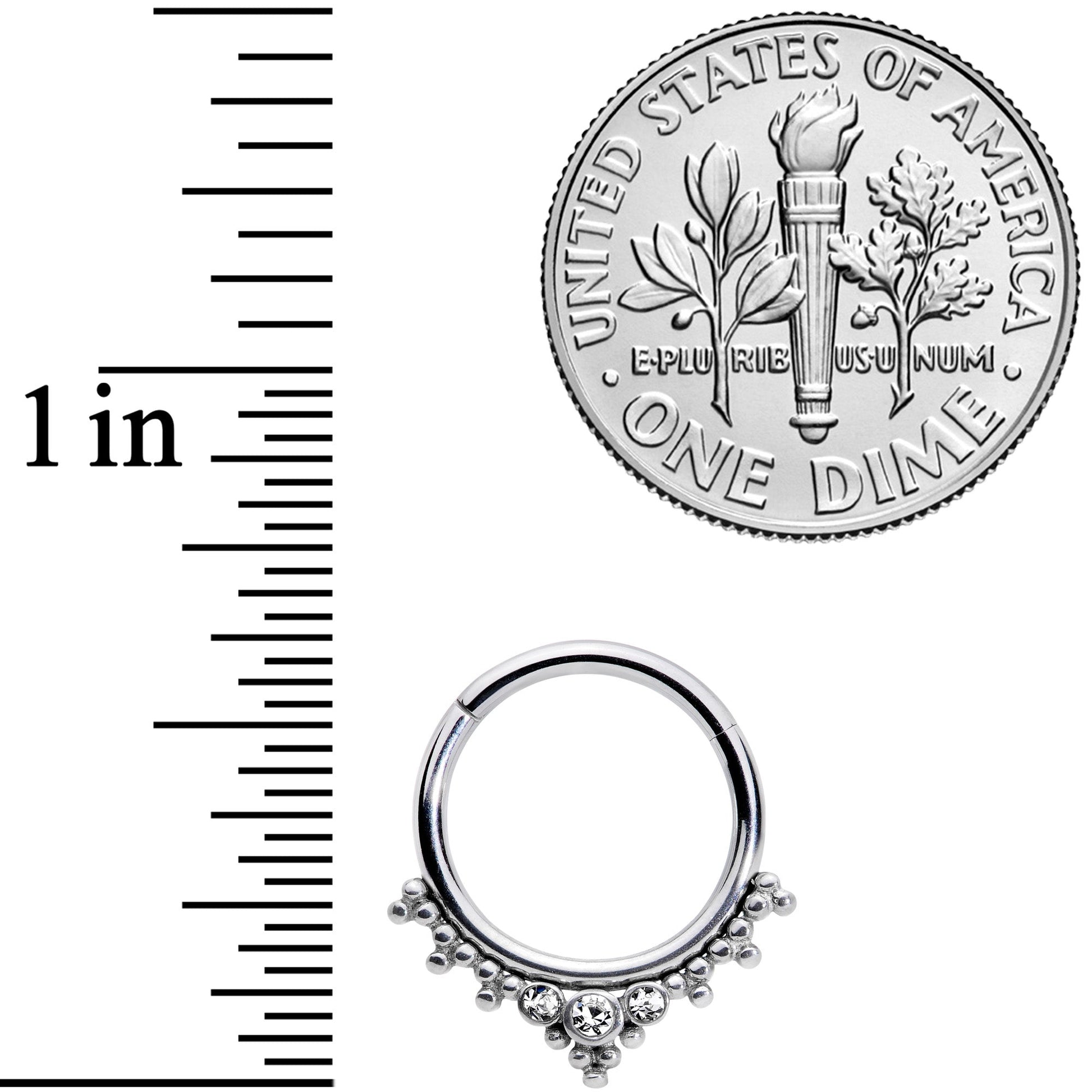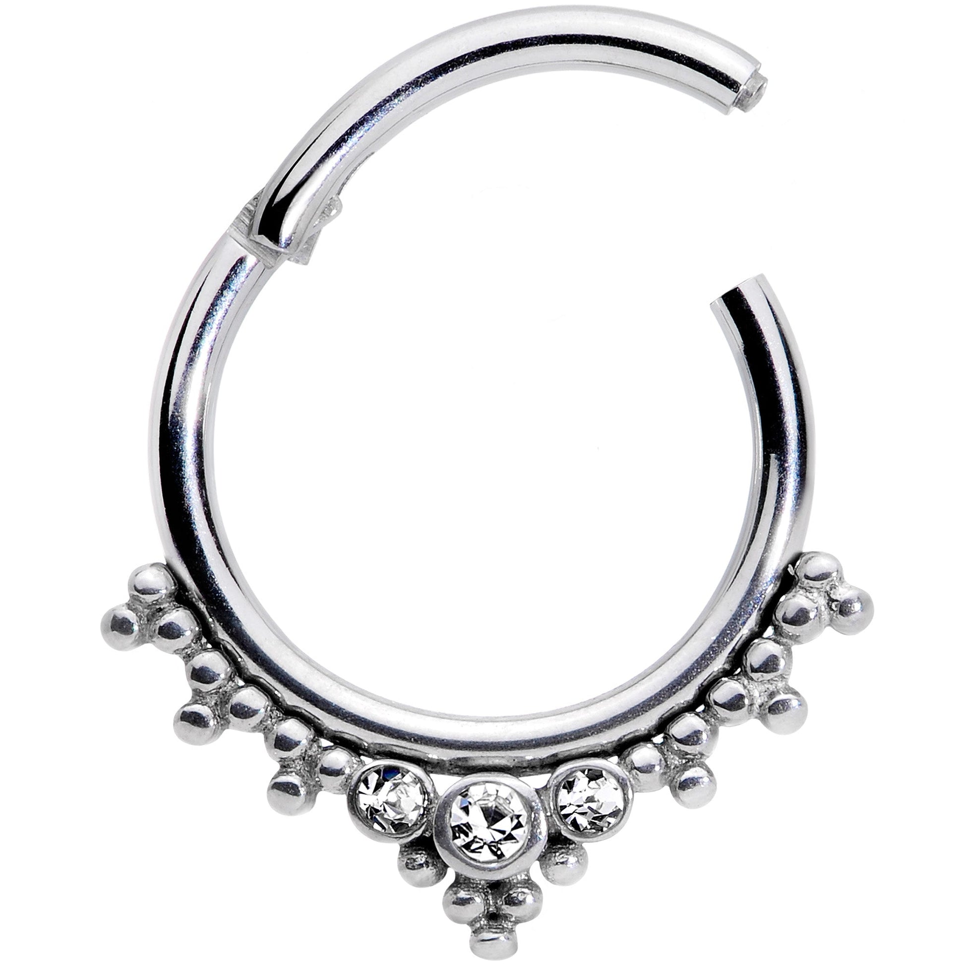 This 16 gauge cartilage earring is petite but packs a powerful punch of style! It's made with a 10mm 316L surgical grade stainless steel hinged circular ring. It features a trio of tiny clear cubic zirconia gems that are simply stylish. The body jewelry ring features a non-removable hinged segment that makes the ring super easy to insert and remove. You'll absolutely love that because it works so well in so many piercings including your septum piercing and cartilage piercings like the daith, tragus, rook, and helix. Once you try out the triad, you'll never want to give it up!Specifications