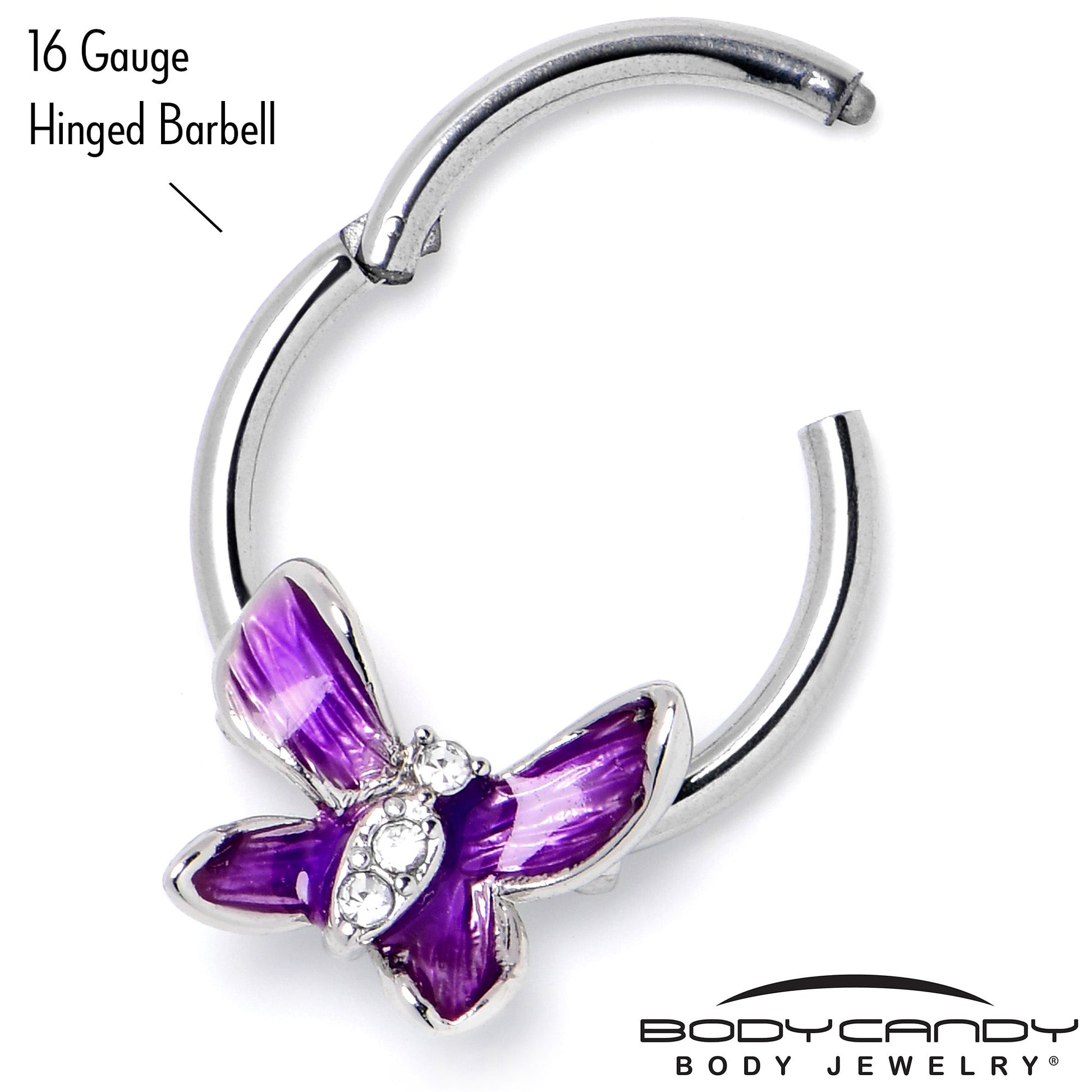 This 16 gauge septum ring is not just a beauty, it is a beautiful butterfly. It is made with a 10mm durable 316L surgical grade stainless steel hinged circular ring. It features an elegantly simple butterfly charm, with purple wings and clear gems set into the body. It also features a non-removable, hinged segment that makes insertion and removal a breeze and you can even rock it in multiple piercings including tragus, helix, and some daith piercings. Simple details, style, and plenty of elegance - this cartilage piercing jewelry really is a beauty.Specifications