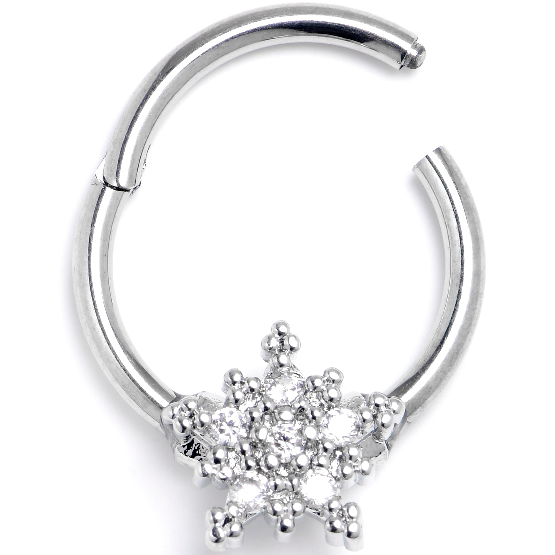 The snowflake on this 16 gauge septum ring is one that you'll never let melt away from you. It is made with a 10mm durable 316L surgical grade stainless steel hinged circular ring. It features an intricate snowflake charm set with clear gems and embellished with textured detailing. It also features a non-removable, hinged segment that makes insertion and removal a breeze and you can even sport this snowflake in multiple piercings including tragus, helix, and some daith piercings. This winter, let the snow spruce up your style with this sumptuous snowflake cartilage piercing jewelry.Specifications
