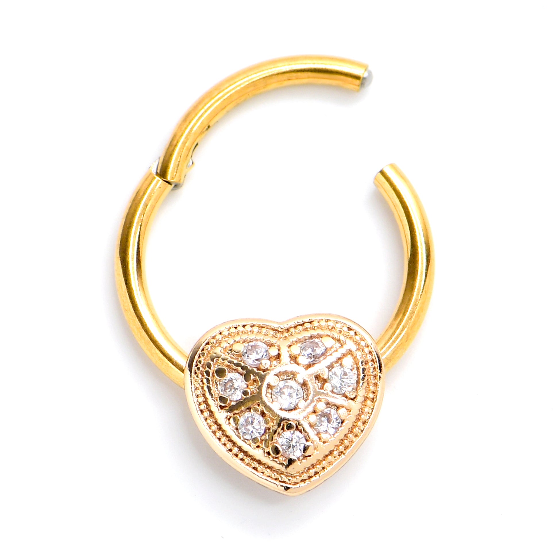 Look luxe without breaking the bank with this 16 gauge septum ring. It is made with a 10mm gold tone PVD over 316L surgical grade stainless steel straight hinged circular ring. It end features a heart charm, with ornate detailing and clear gems all along the interior. It also features a non-removable, hinged segment that makes insertion and removal a breeze and you can rock it in multiple piercings including tragus, helix, and some daith piercings. You are going to fall in love with the baroque look of this heart-themed cartilage piercing jewelry.Specifications