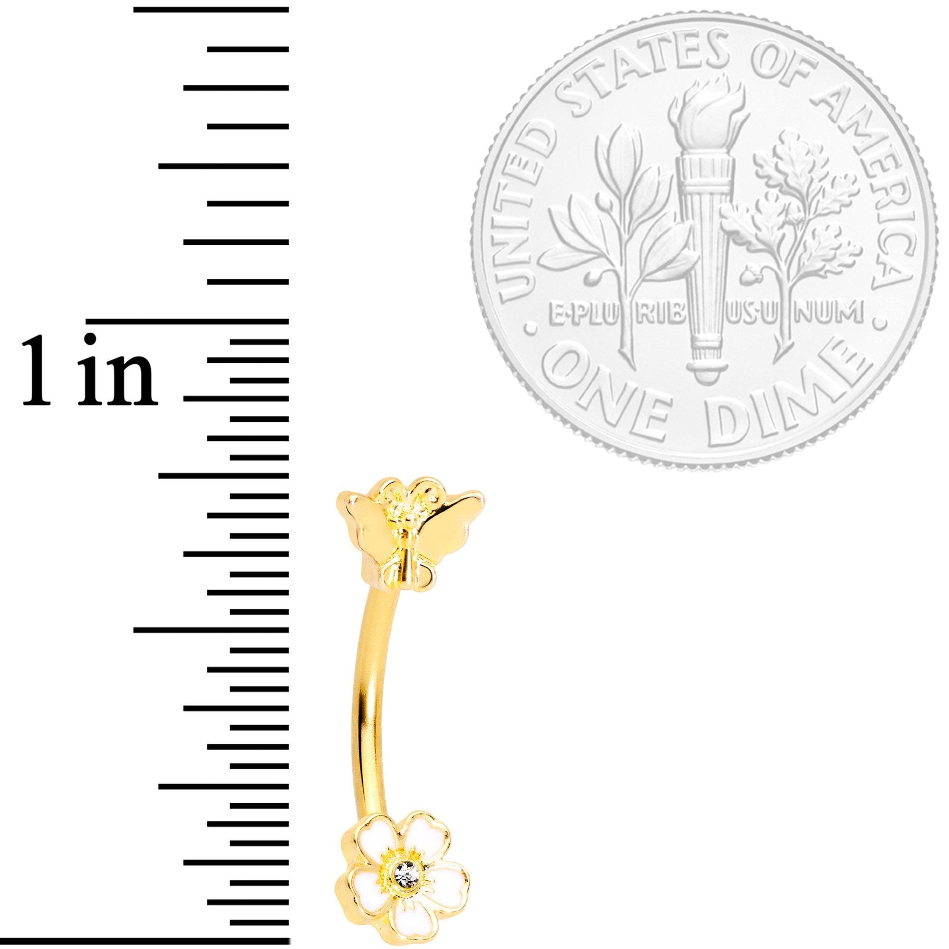 Spring brings flowers out in the strangest places - like your piercing! This 16 gauge eyebrow piercing is made with a 10mm gold tone anodized over 316L surgical grade stainless steel curved barbell. One end features a small flower, inlaid in white, with a tiny clear gem embellishing its very center. The other end features a butterfly, lightly detailed for a simple look that doesn't overwhelm the overall piece. This eyebrow jewelry works well in cartilage piercings like your rook, helix, daith, and tragus, and even in some navel piercings.Specifications